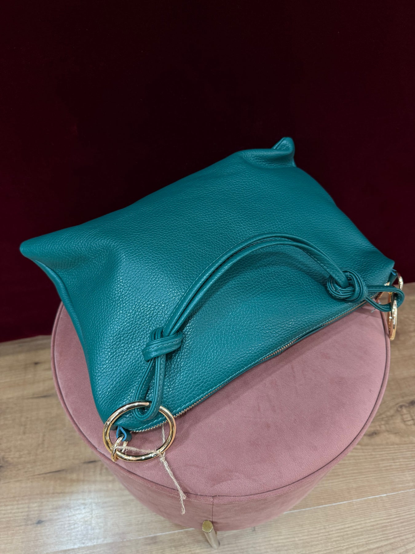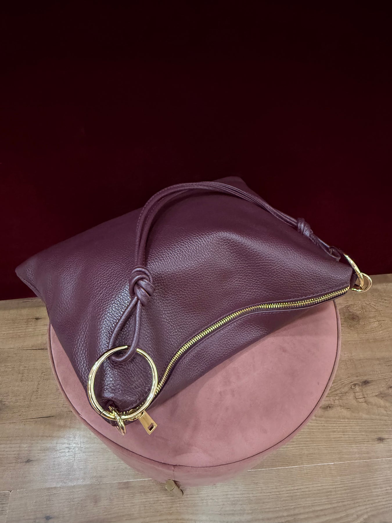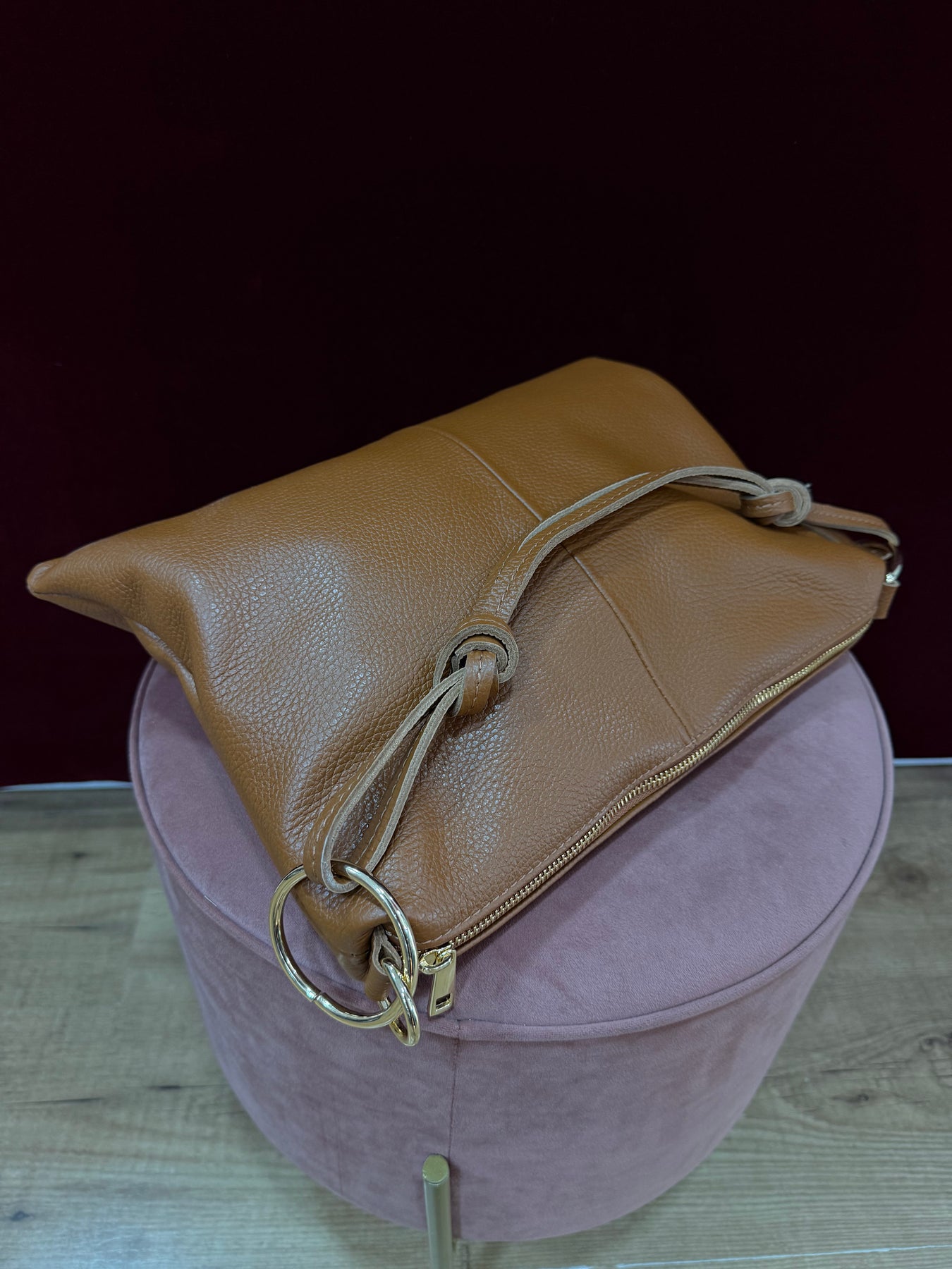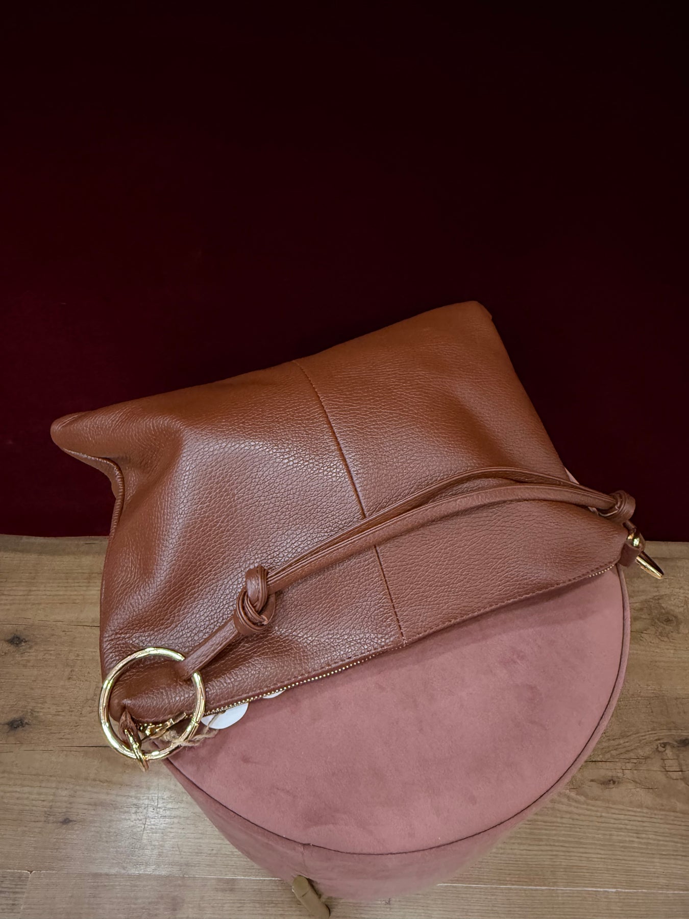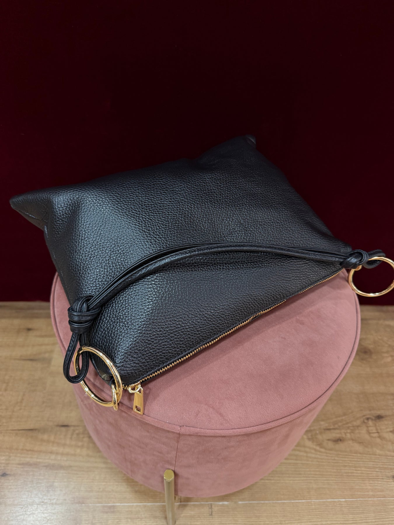 Borsa in vera pelle a busta con doppio laccio per indossarla a spalla, e particolare anello oro sui lati , dotata anche di tracolla removibile e regolabile, interno in tessuto.