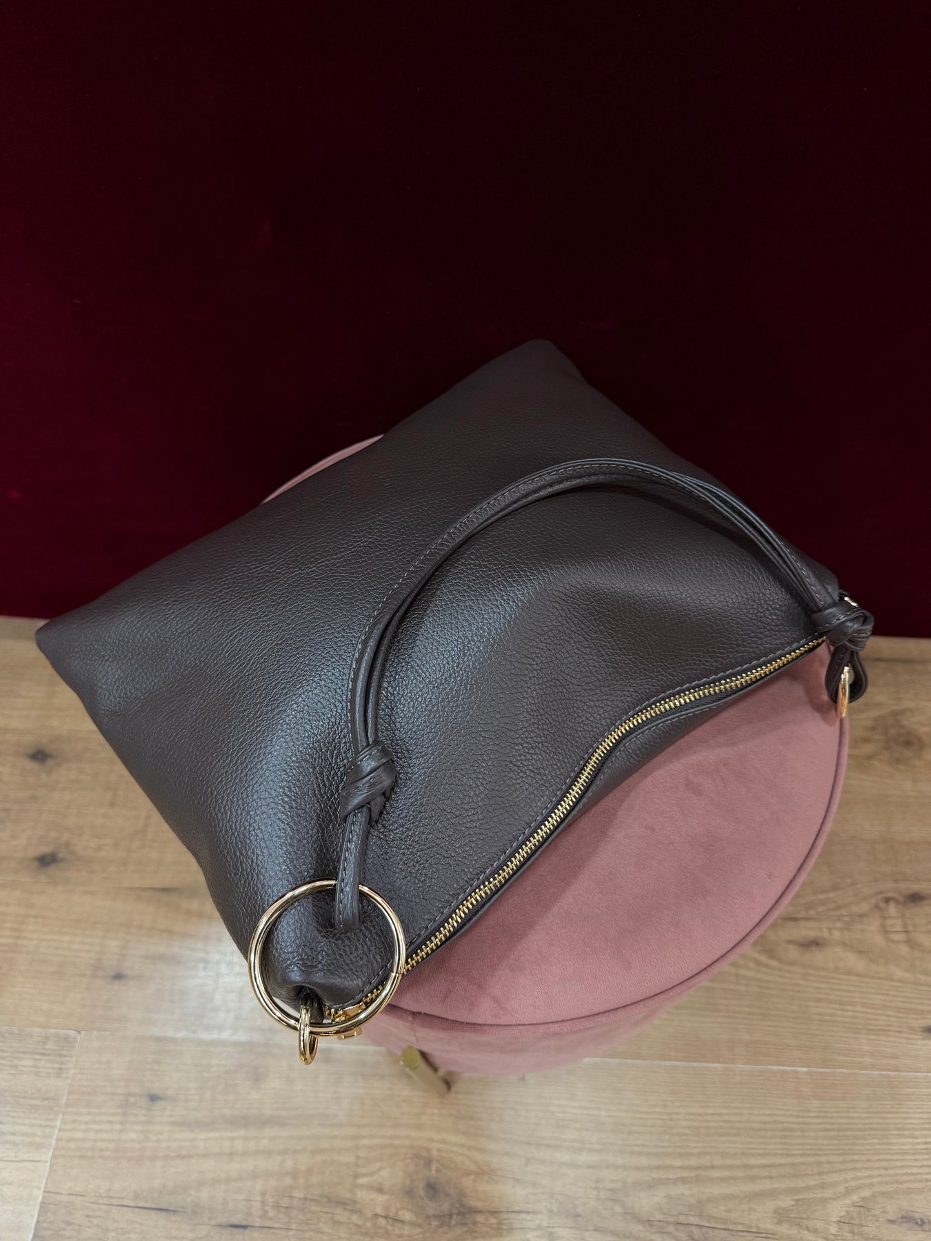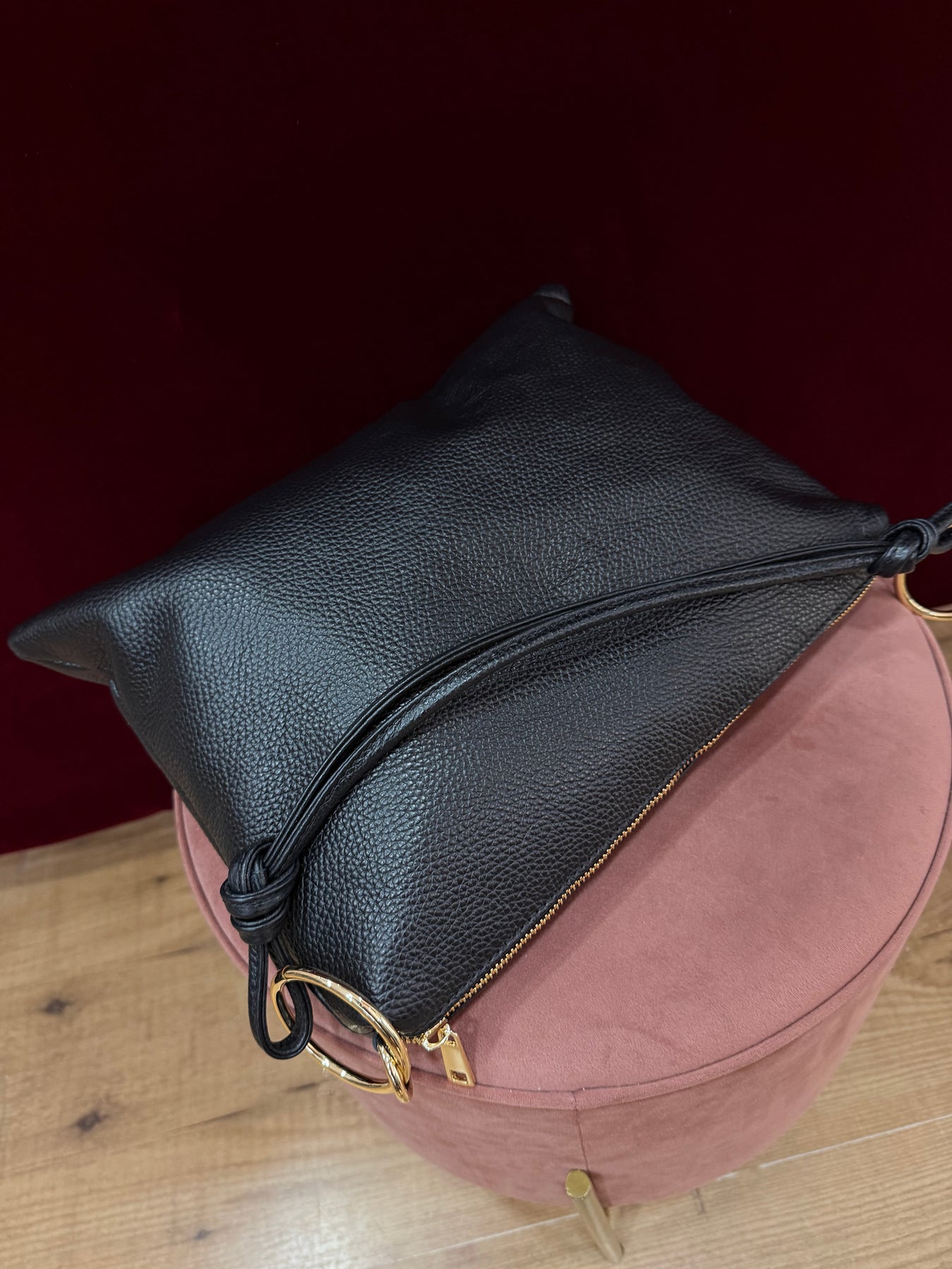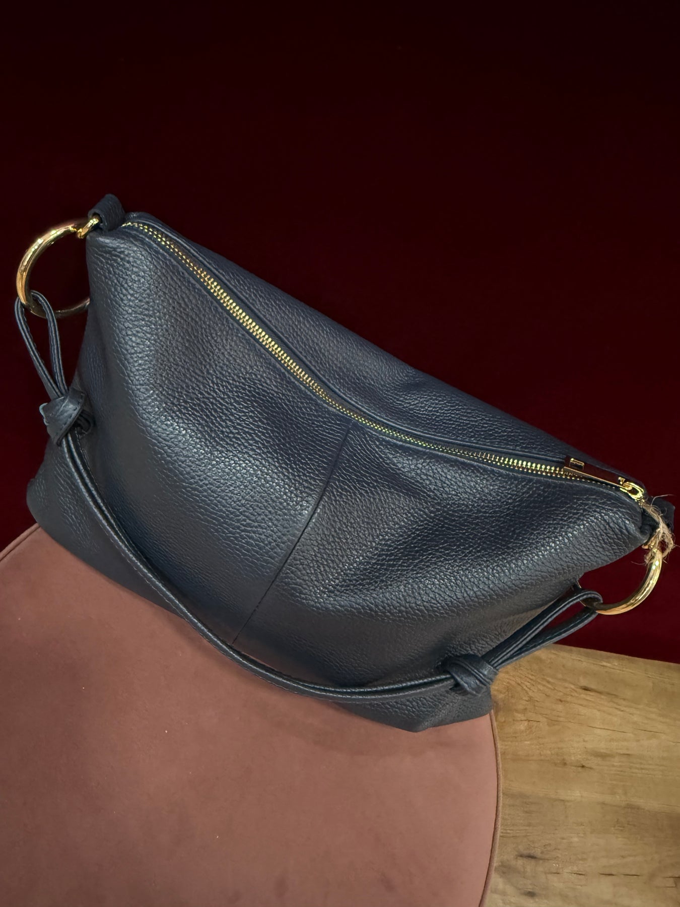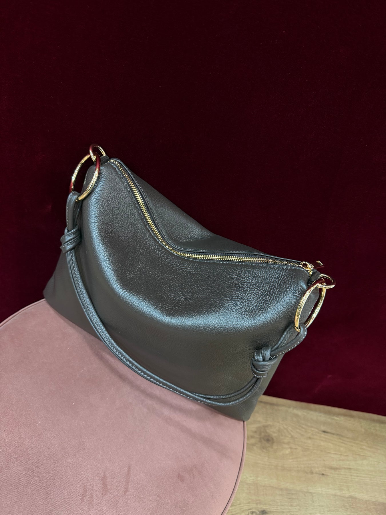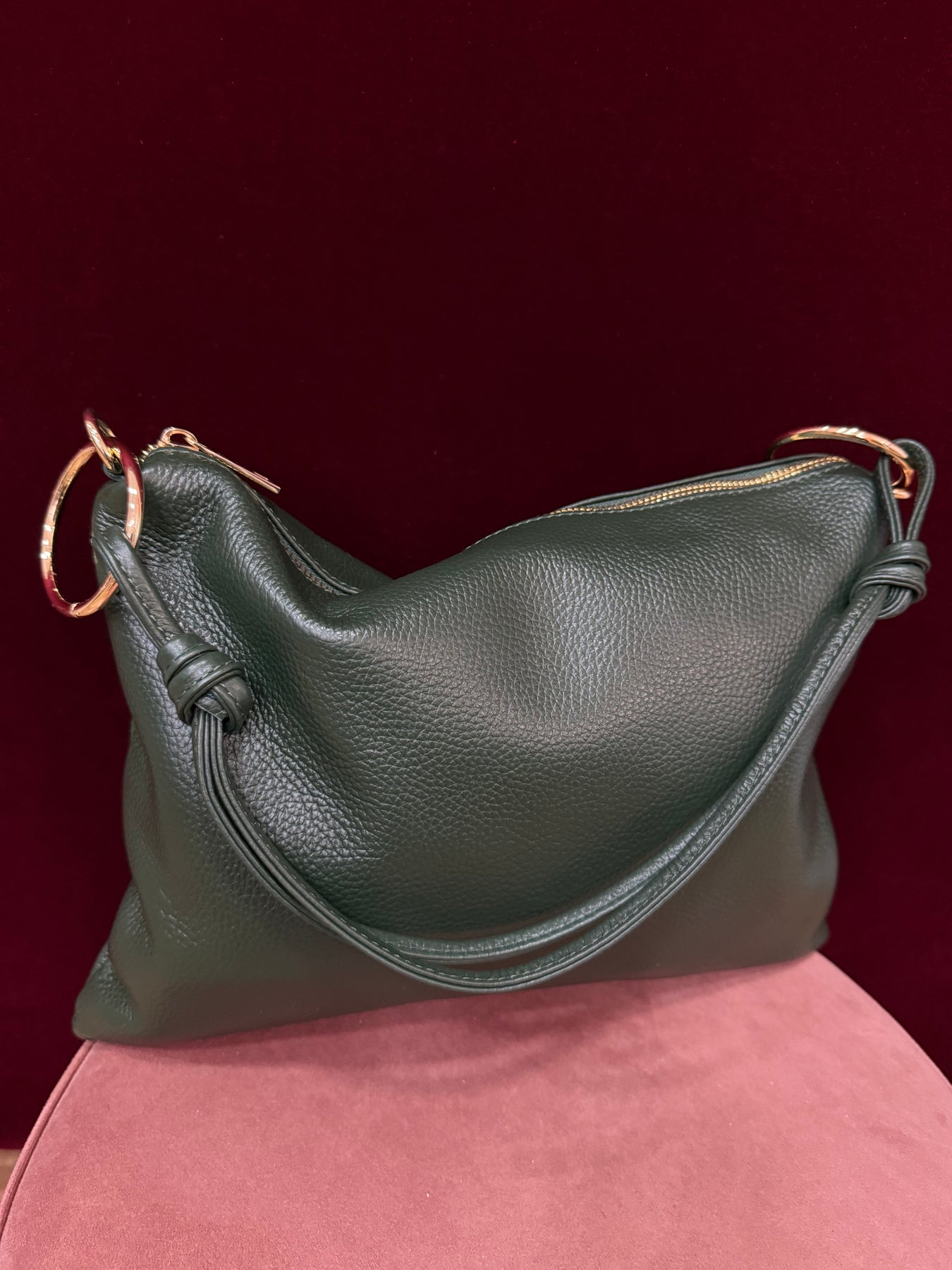 Borsa in vera pelle a busta con doppio laccio per indossarla a spalla, e particolare anello oro sui lati , dotata anche di tracolla removibile e regolabile, interno in tessuto.