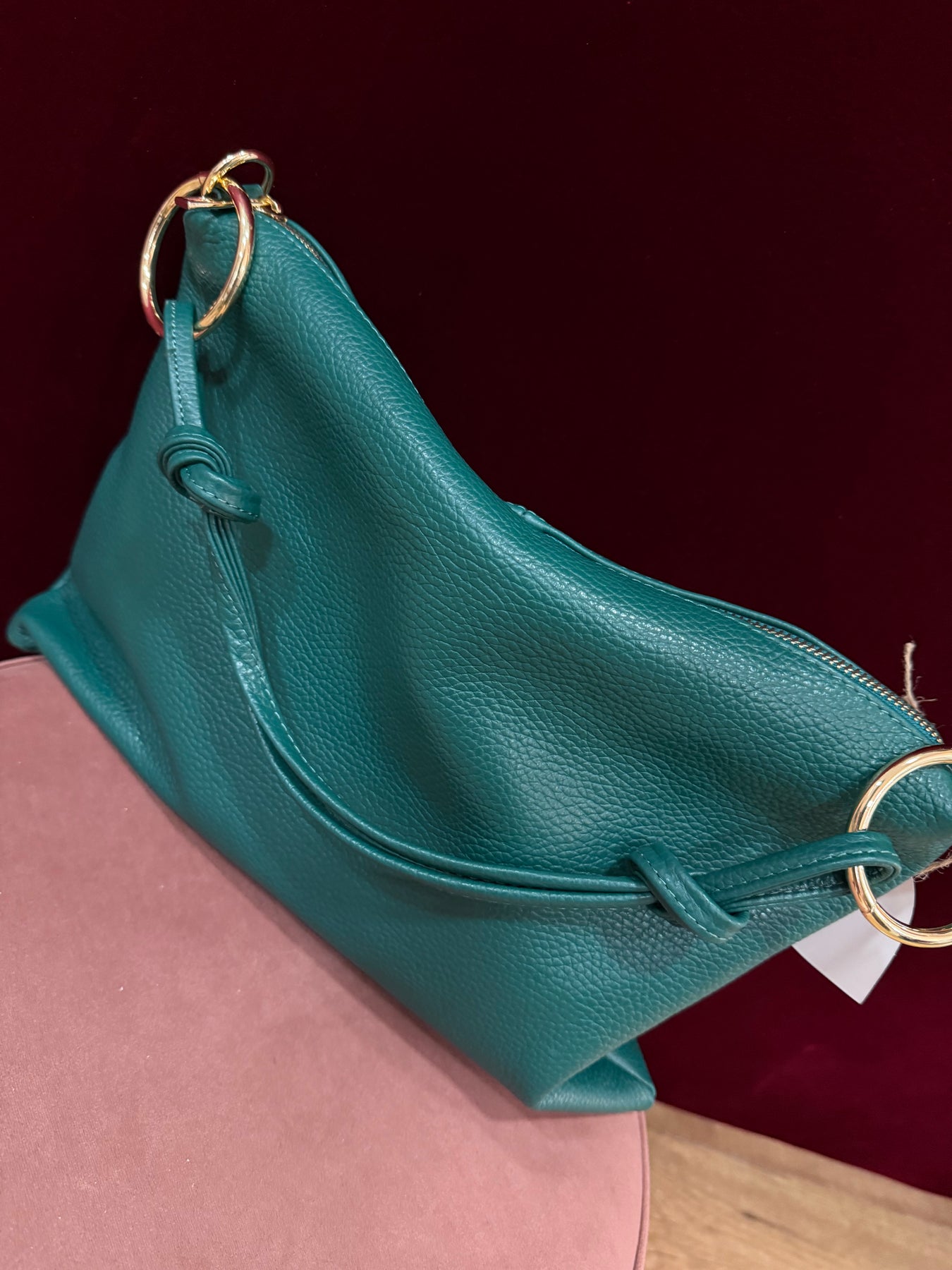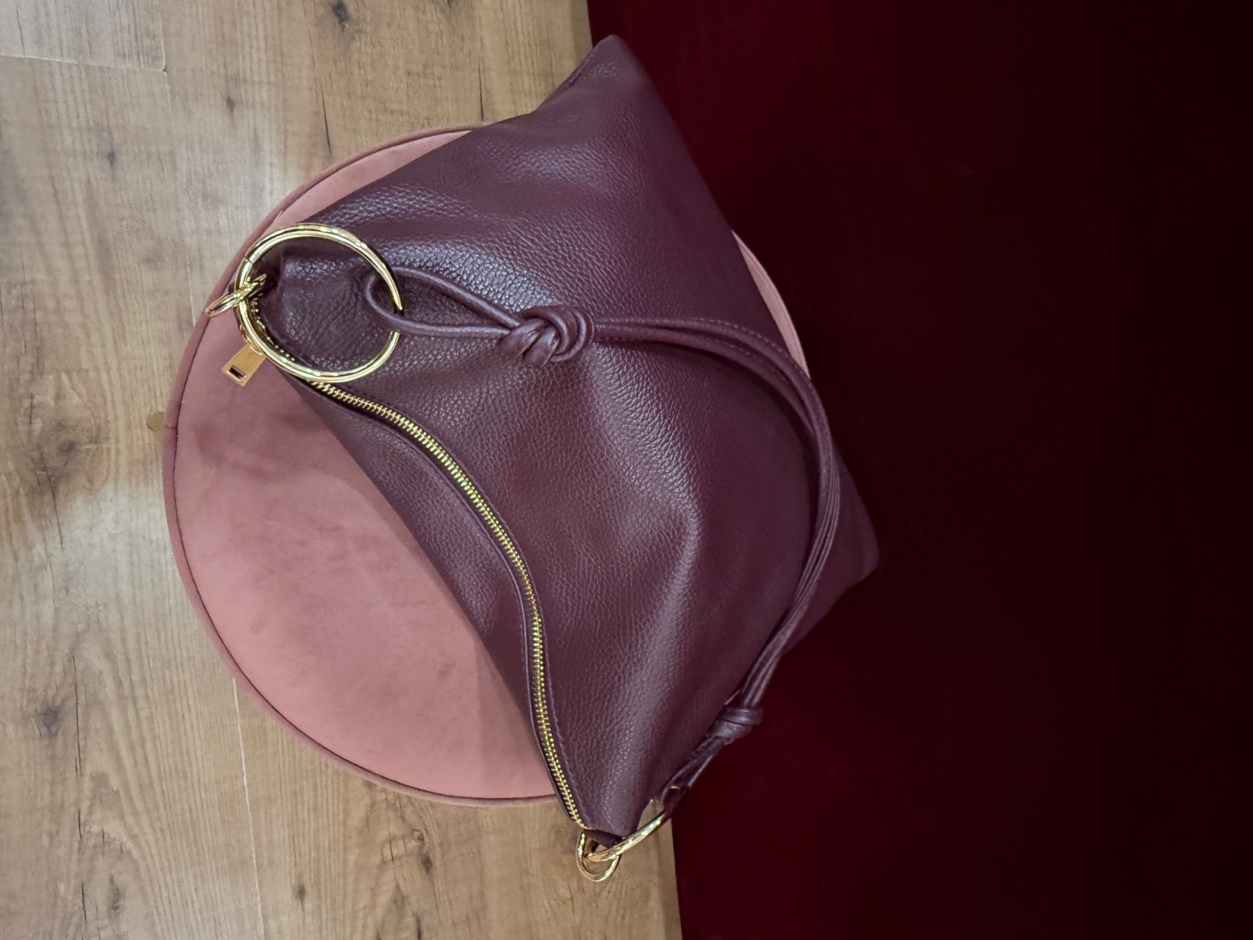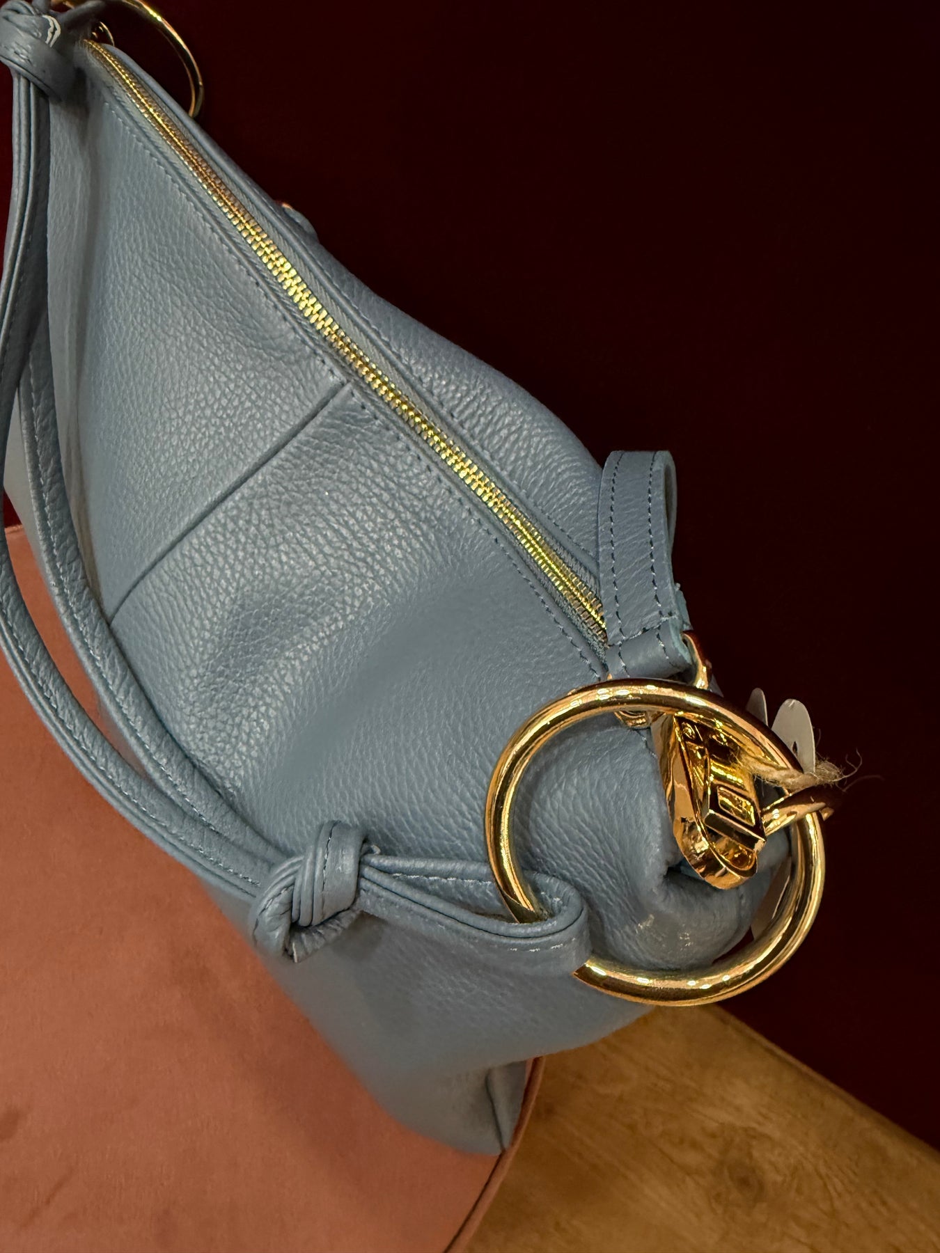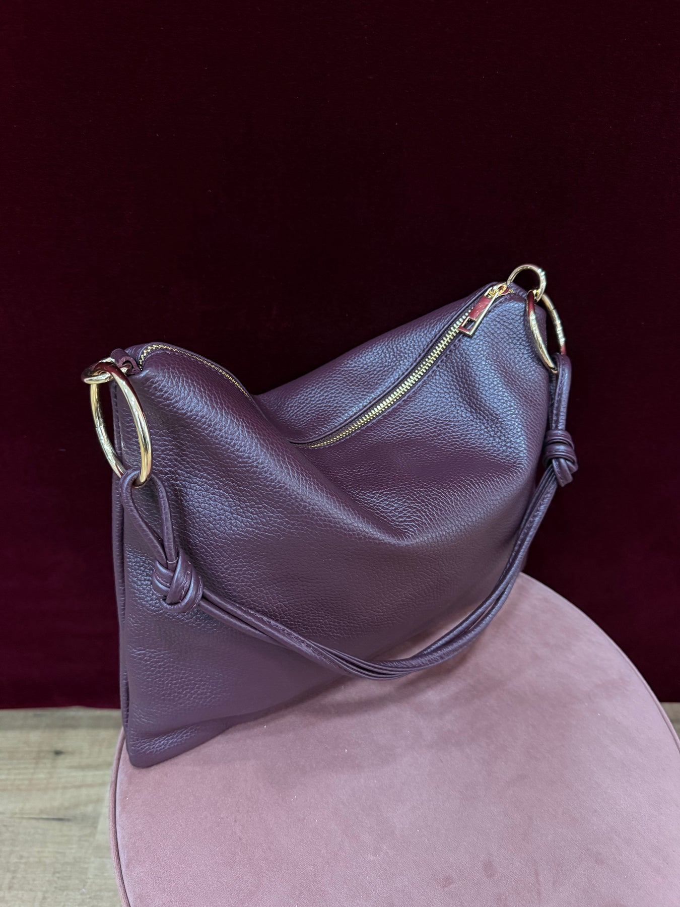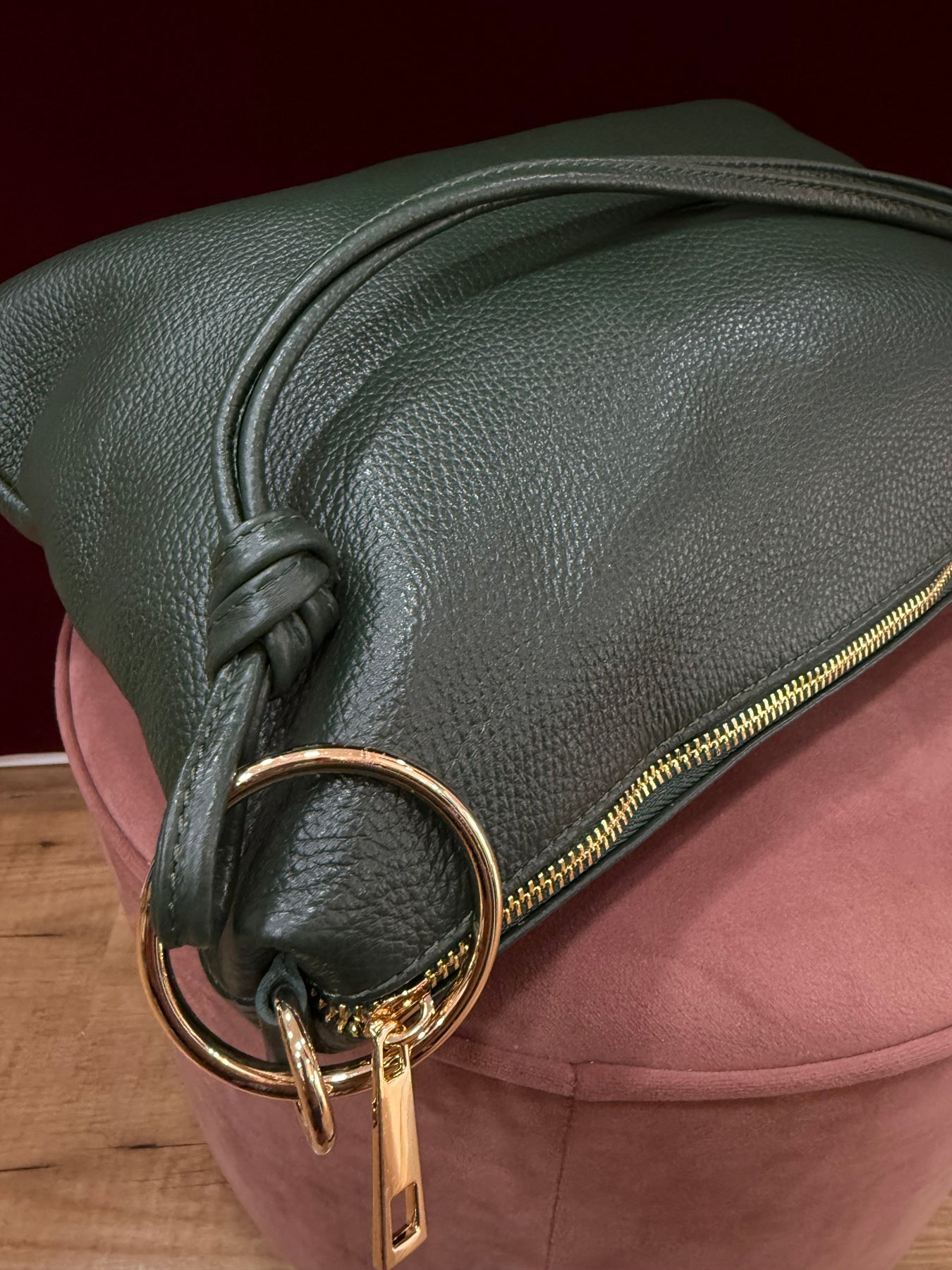 Borsa in vera pelle a busta con doppio laccio per indossarla a spalla, e particolare anello oro sui lati , dotata anche di tracolla removibile e regolabile, interno in tessuto.