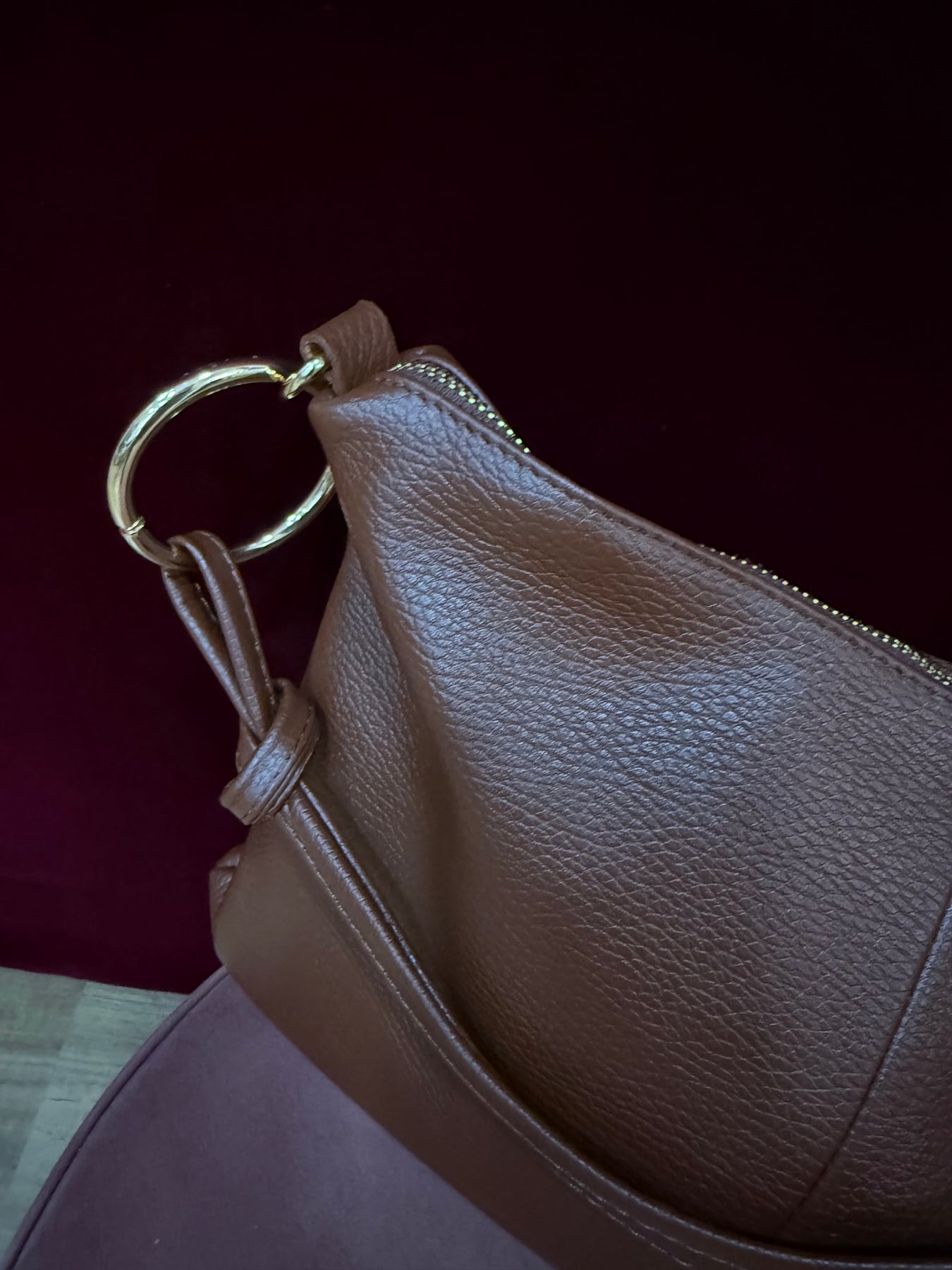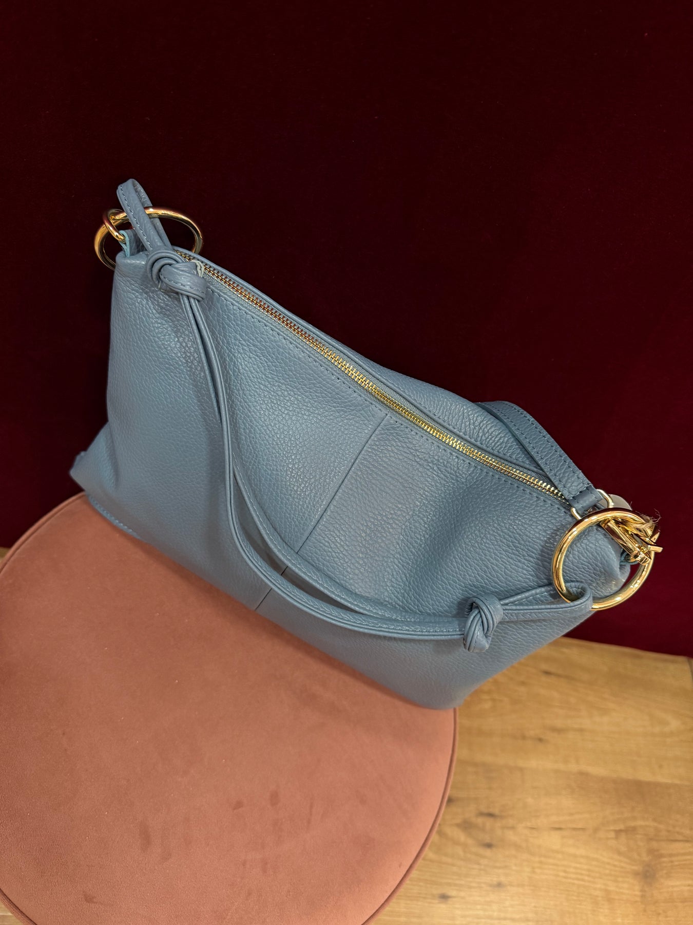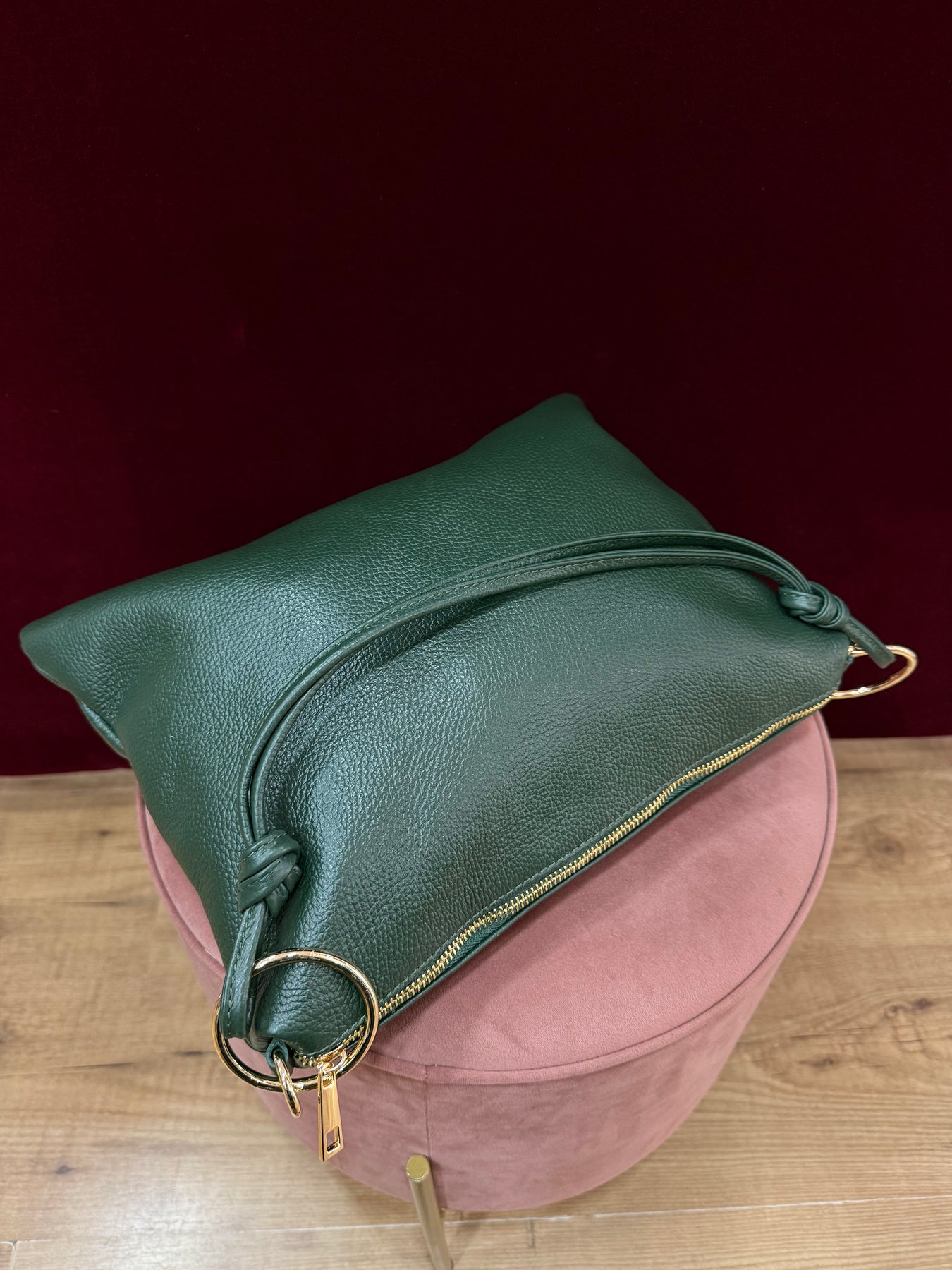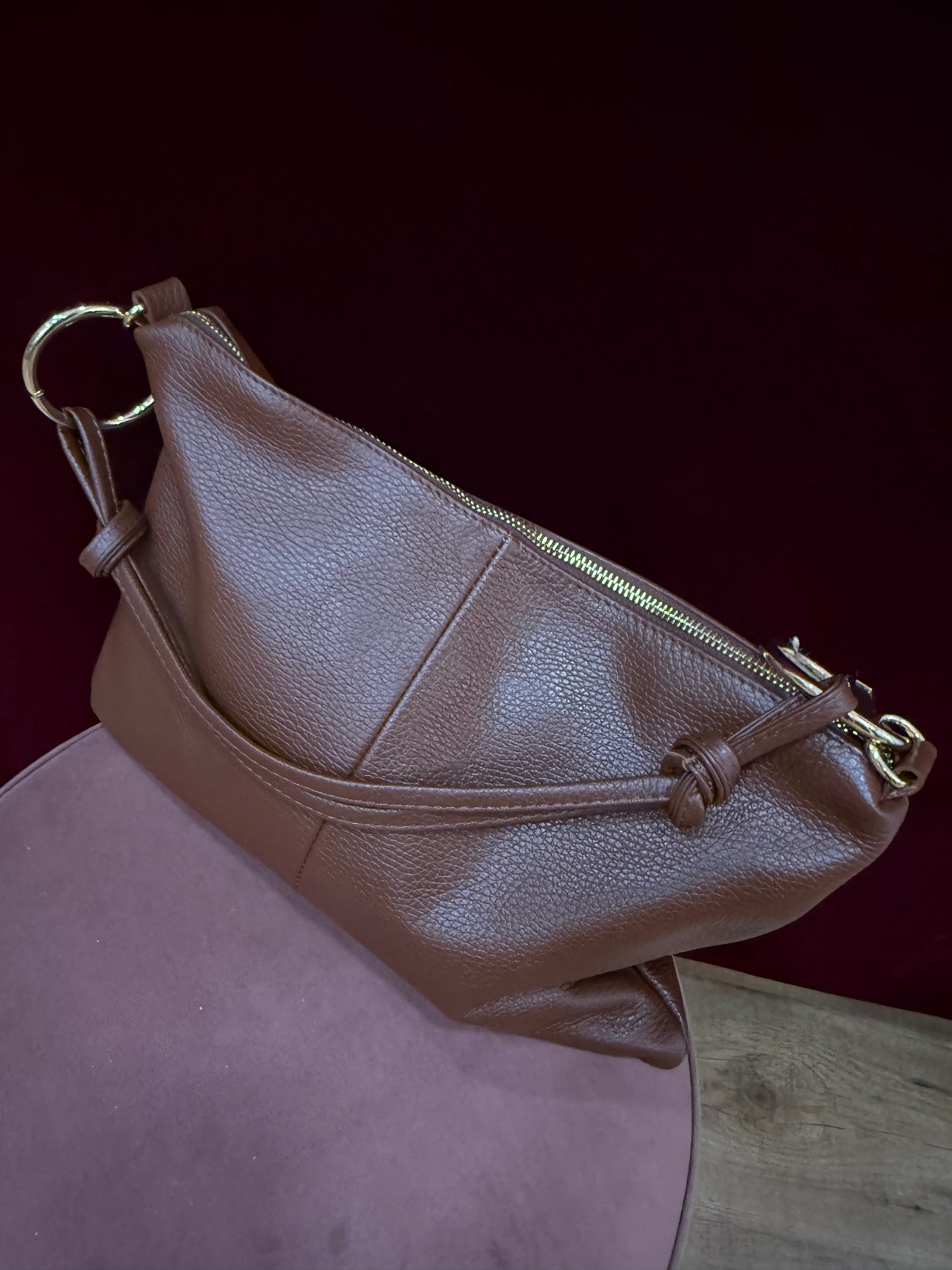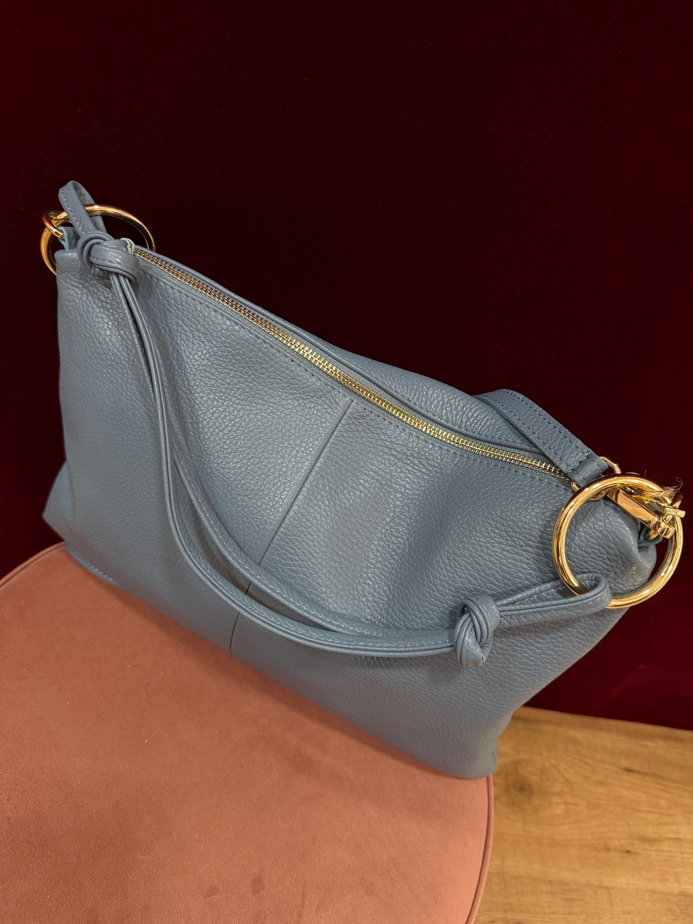 Borsa in vera pelle a busta con doppio laccio per indossarla a spalla, e particolare anello oro sui lati , dotata anche di tracolla removibile e regolabile, interno in tessuto.
