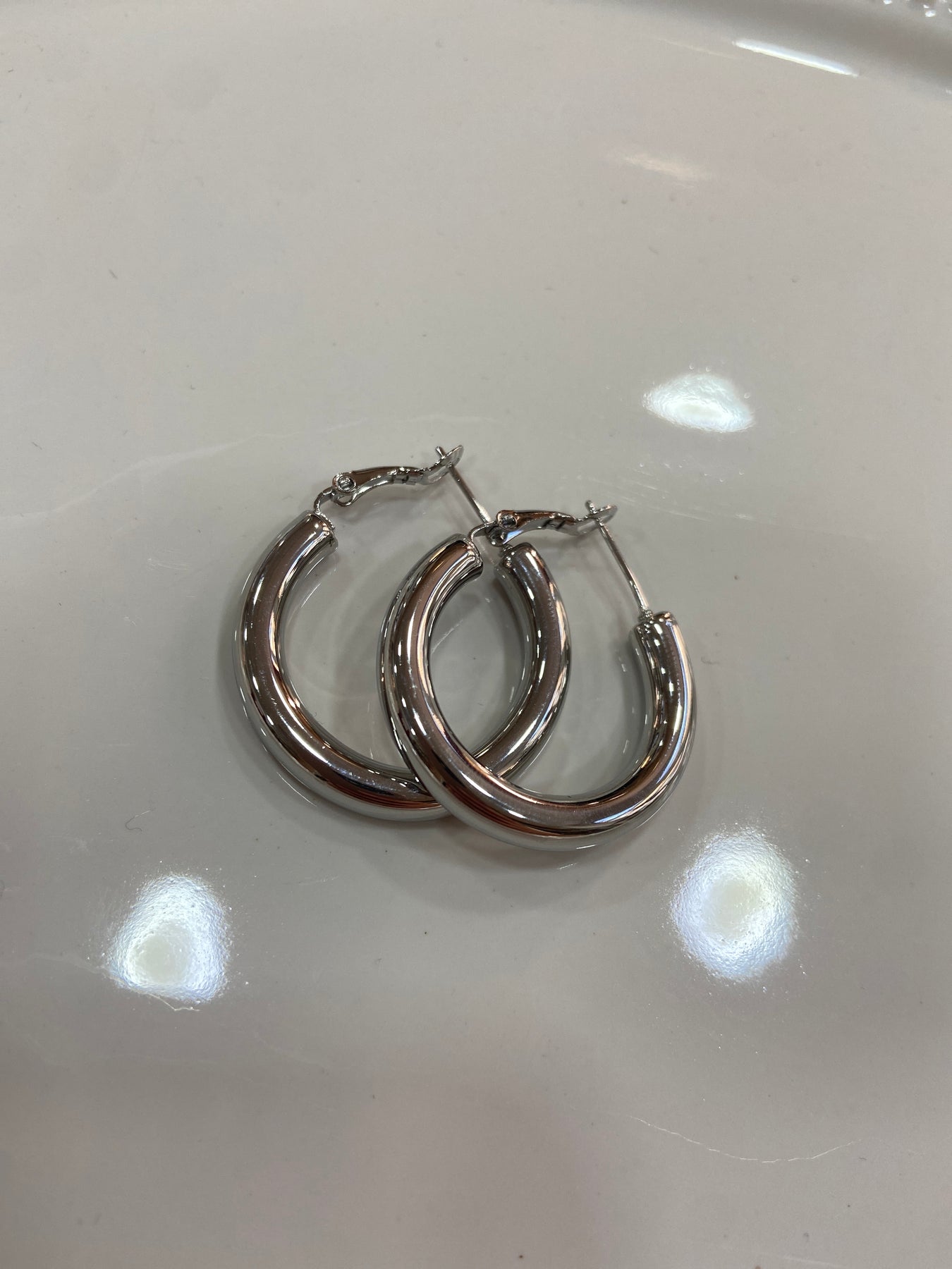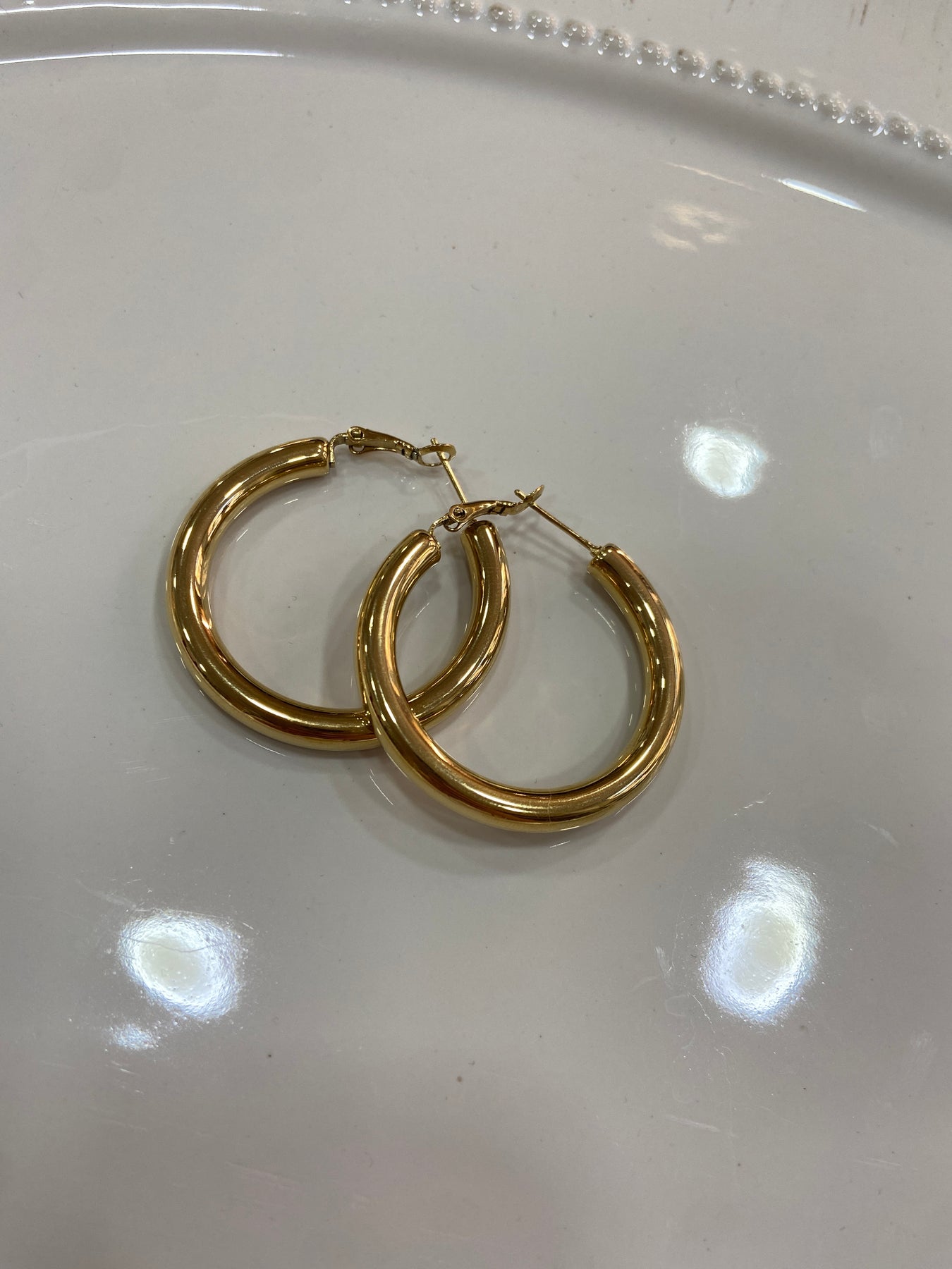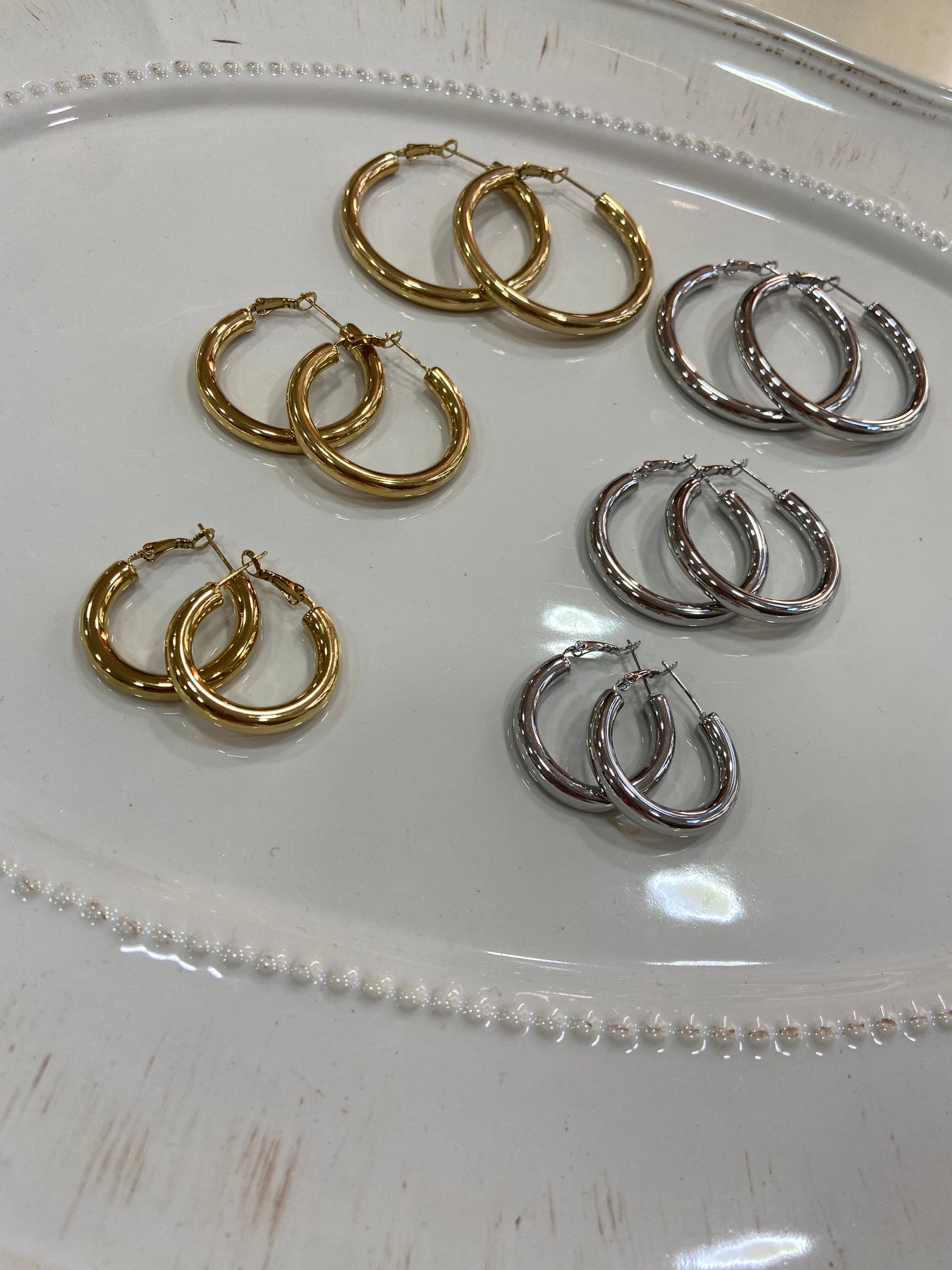 Orecchini a cerchio in acciaio disponibili in color oro e argento in 3 misure. Nichel free.