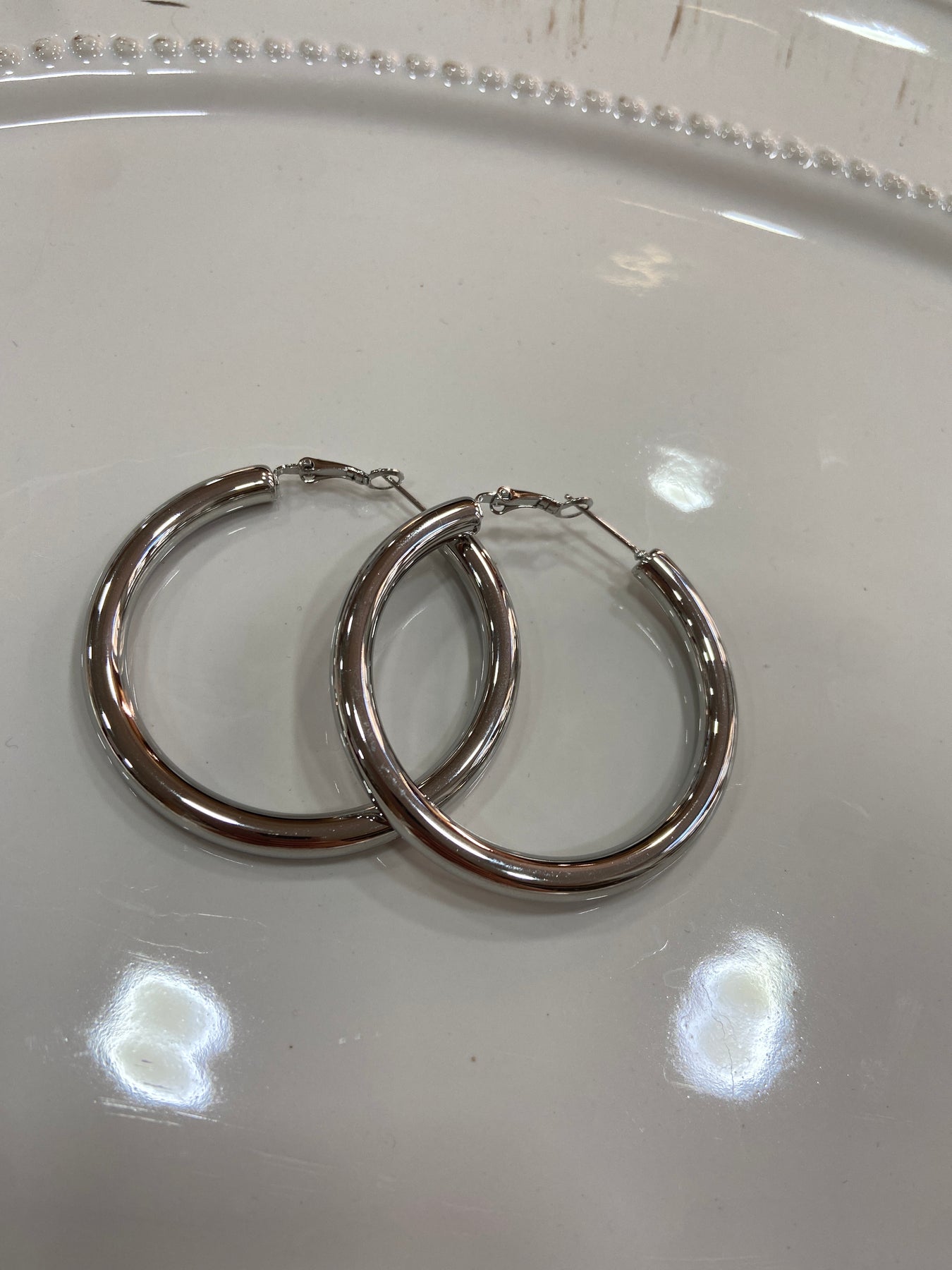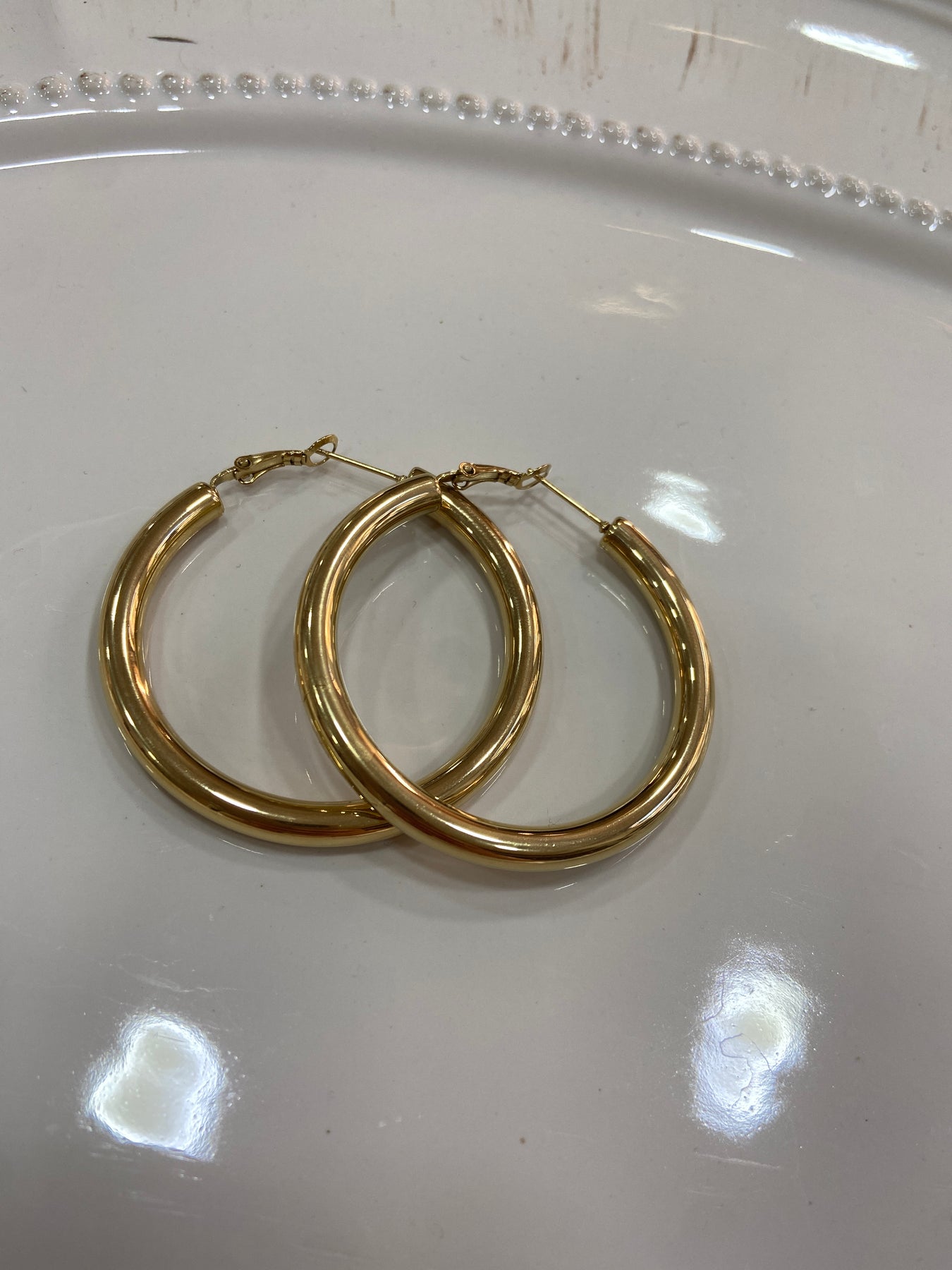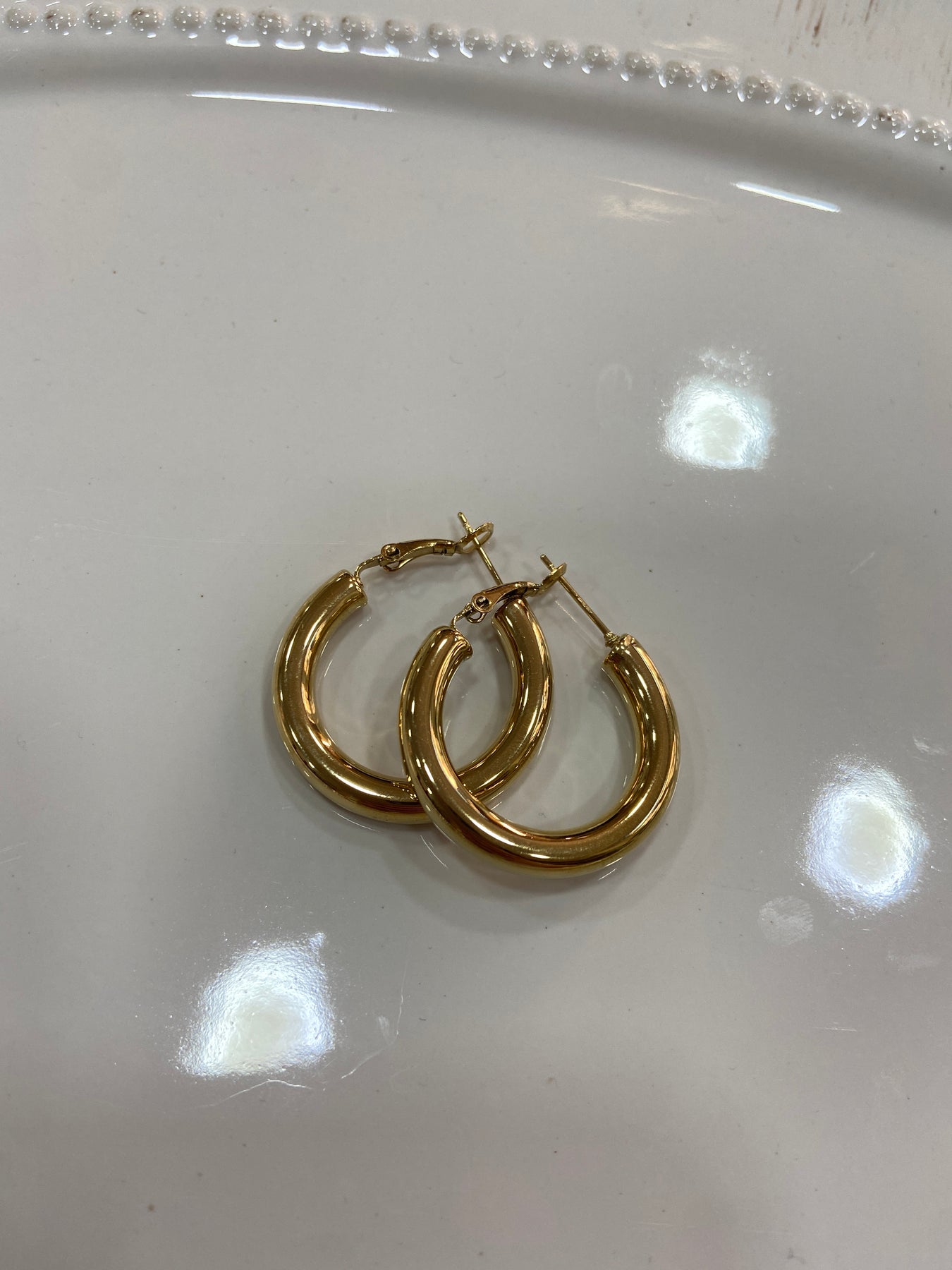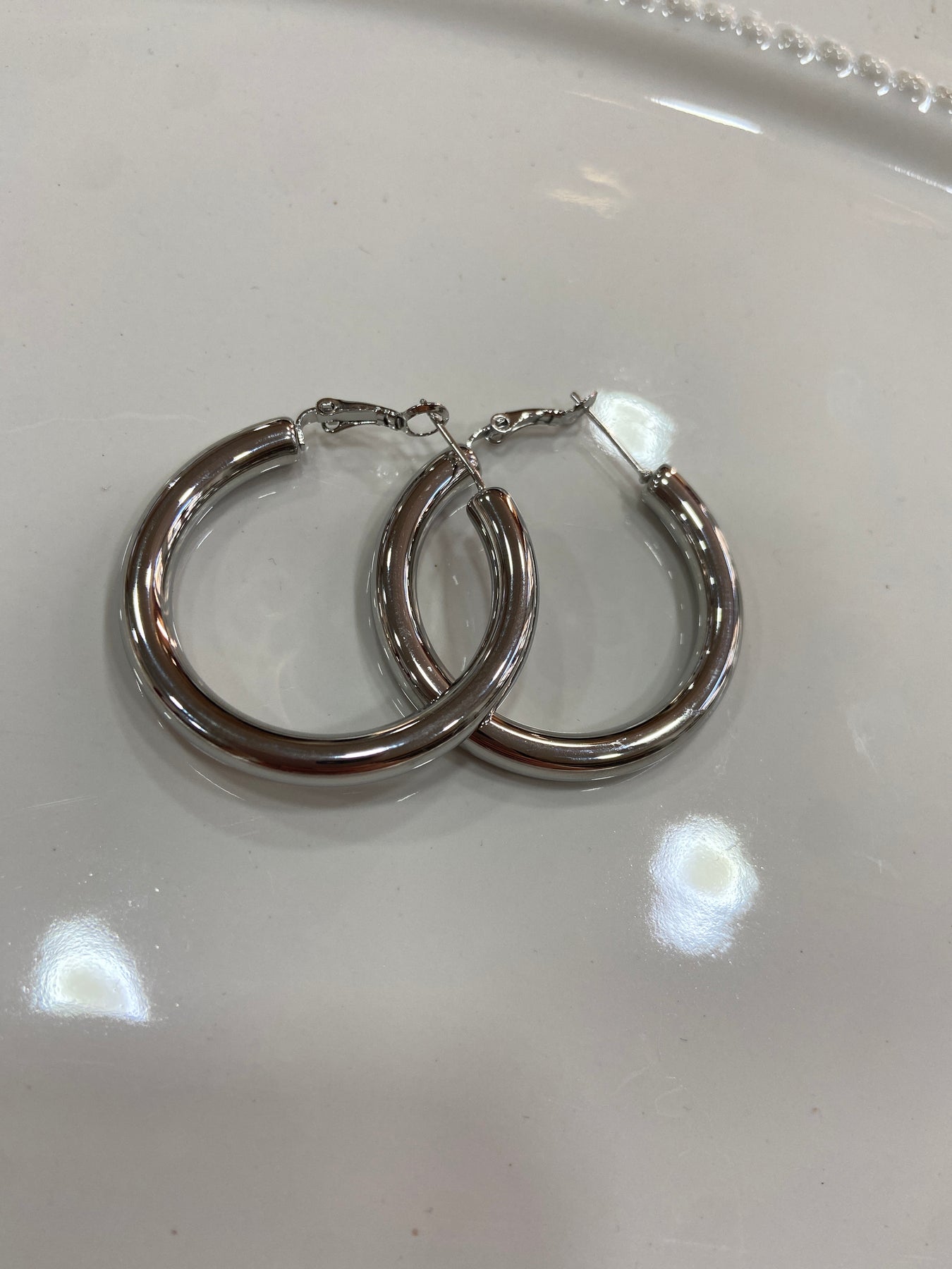 Orecchini a cerchio in acciaio disponibili in color oro e argento in 3 misure. Nichel free.