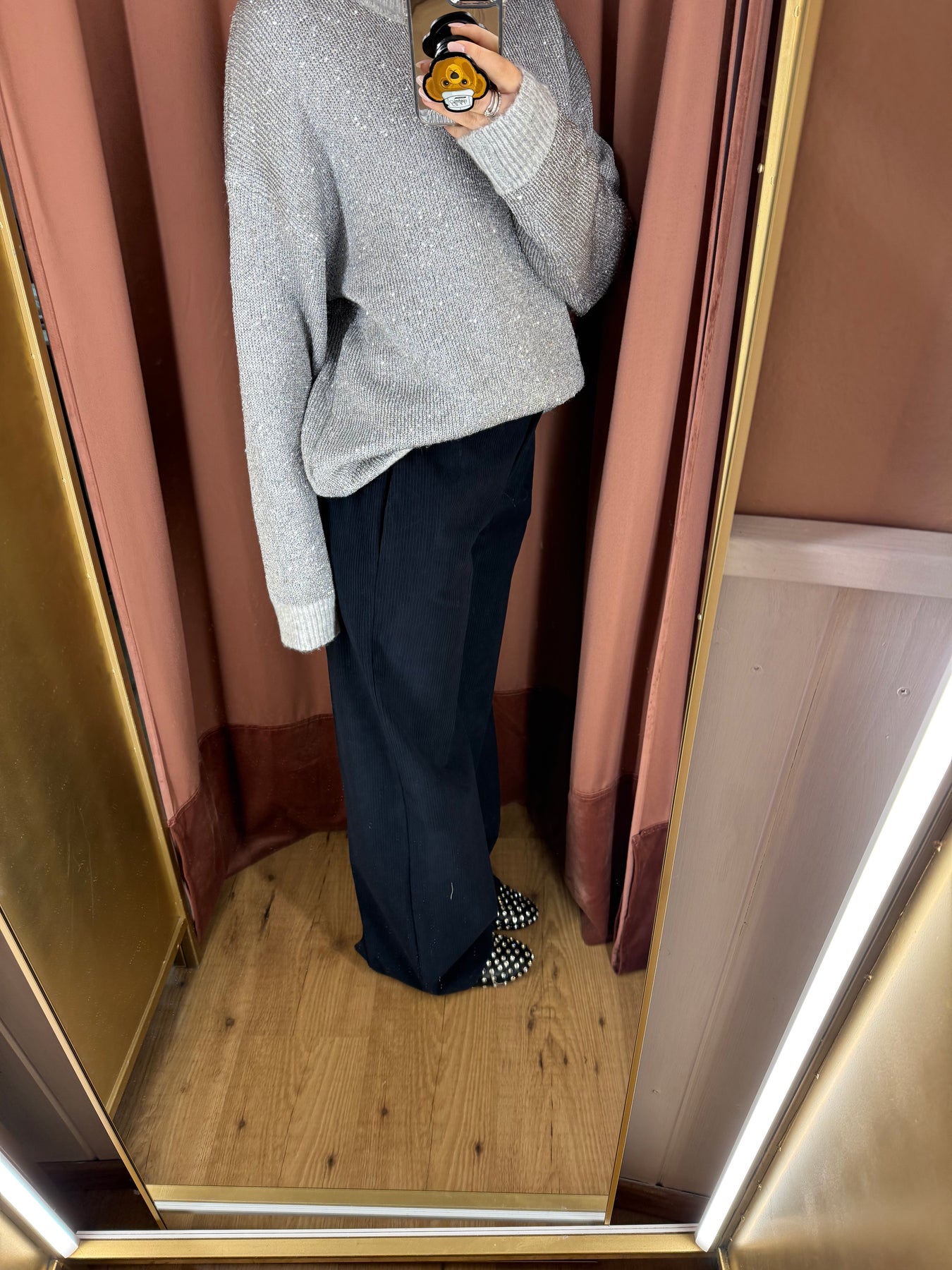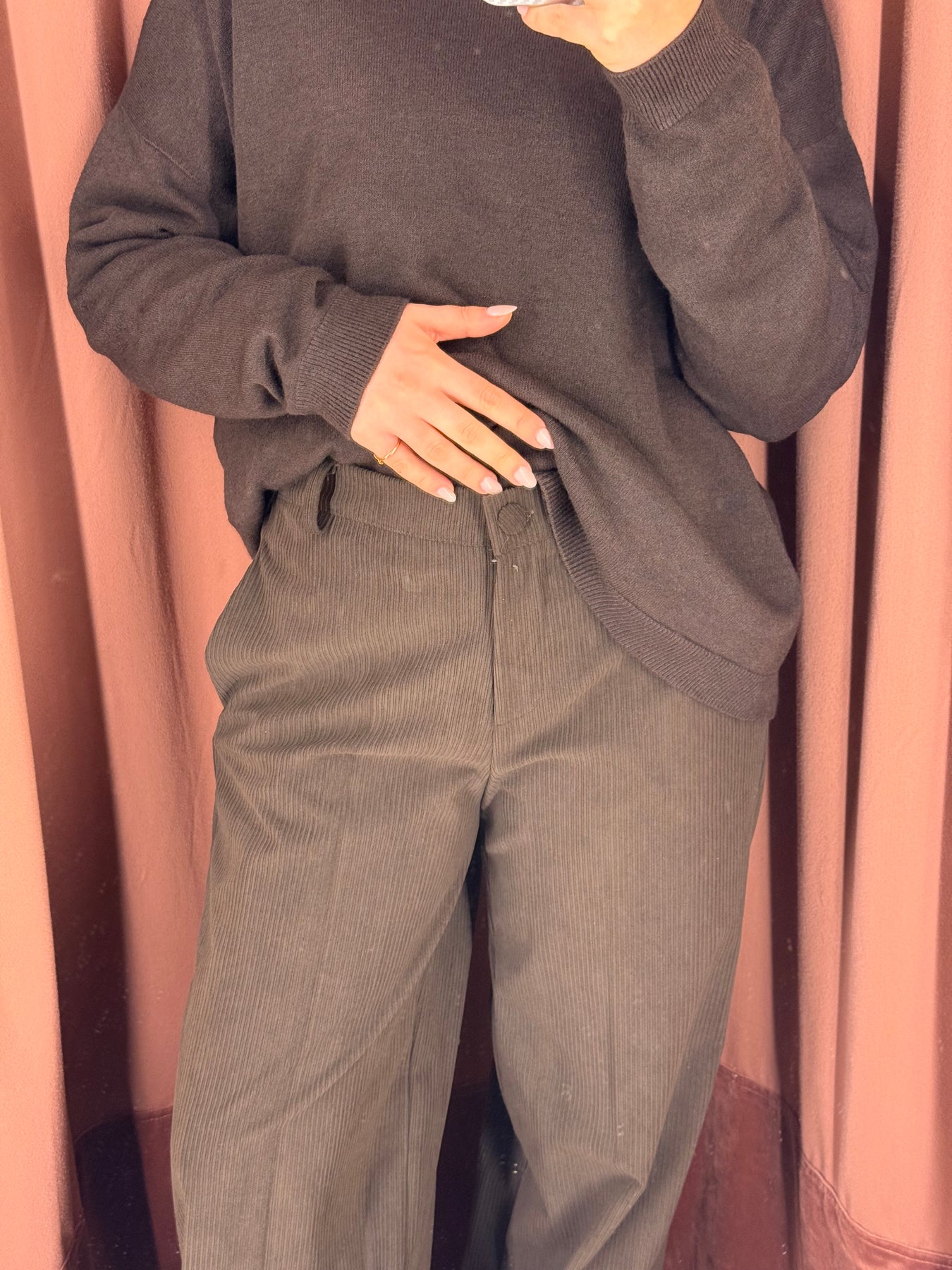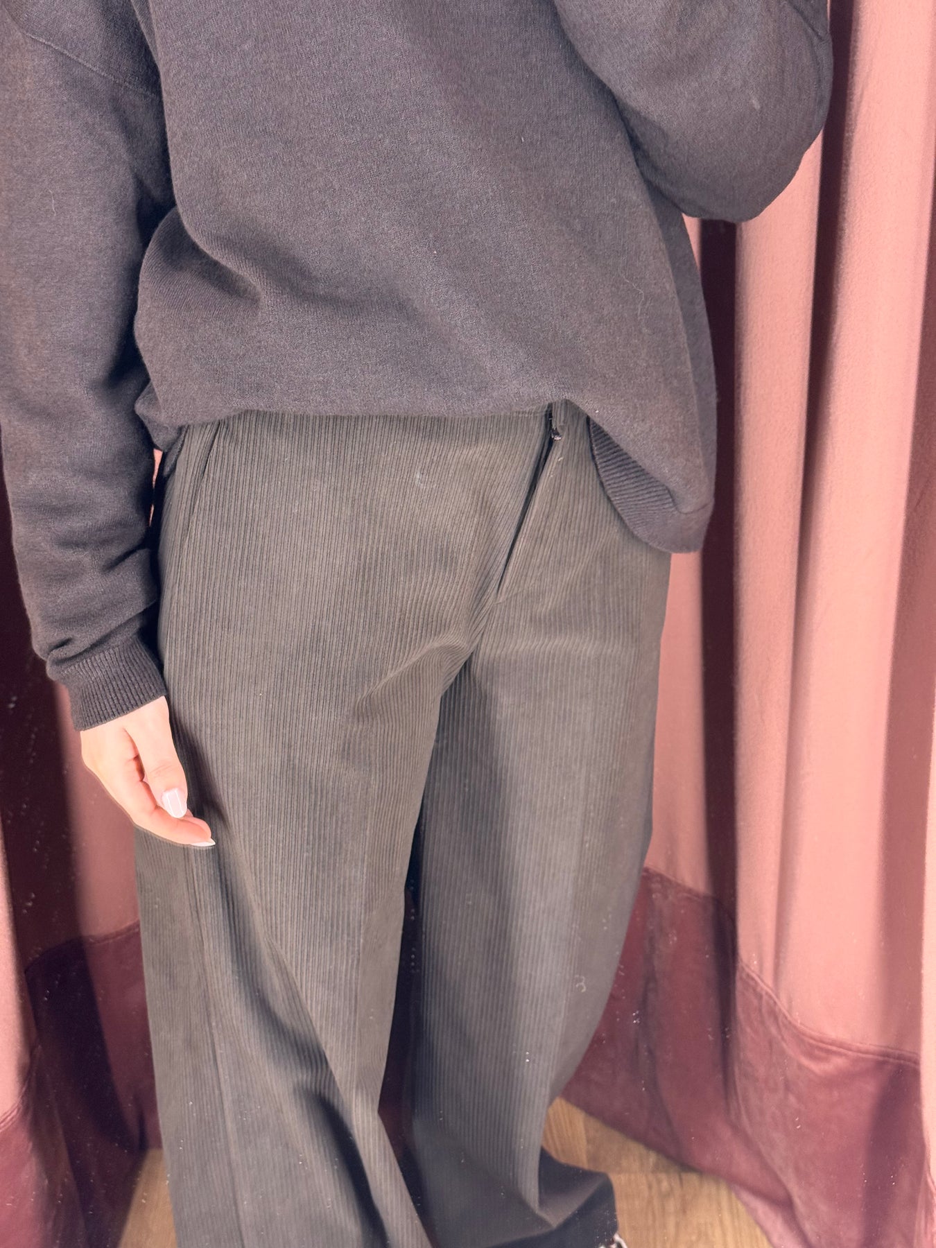 Pantalone in velluto con vita con baschina sul davanti e vita elasticizzata dietro, taglia unica.