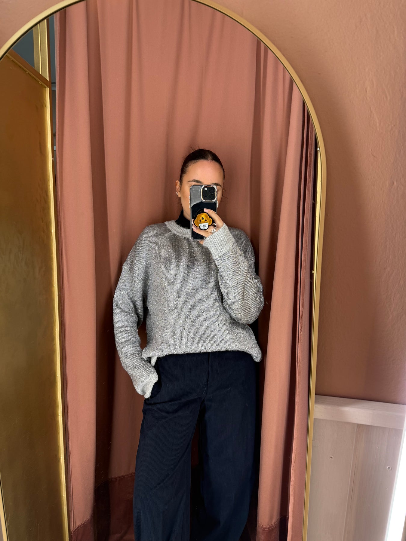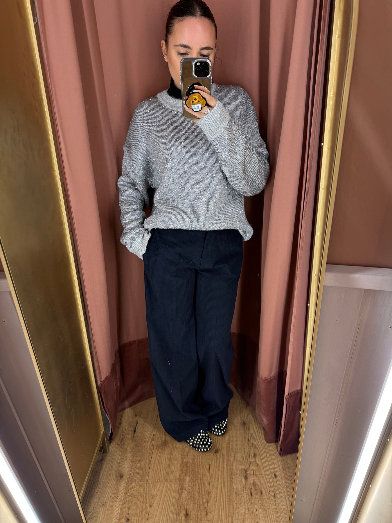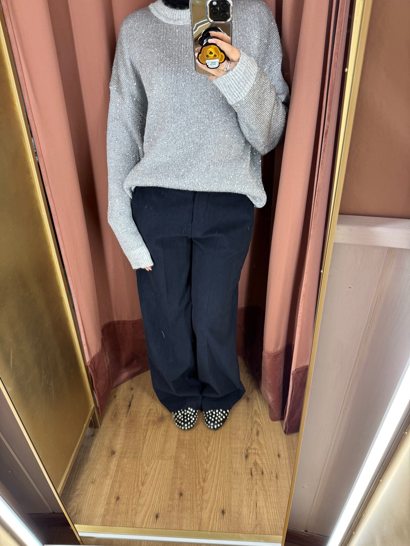 Pantalone in velluto con vita con baschina sul davanti e vita elasticizzata dietro, taglia unica.