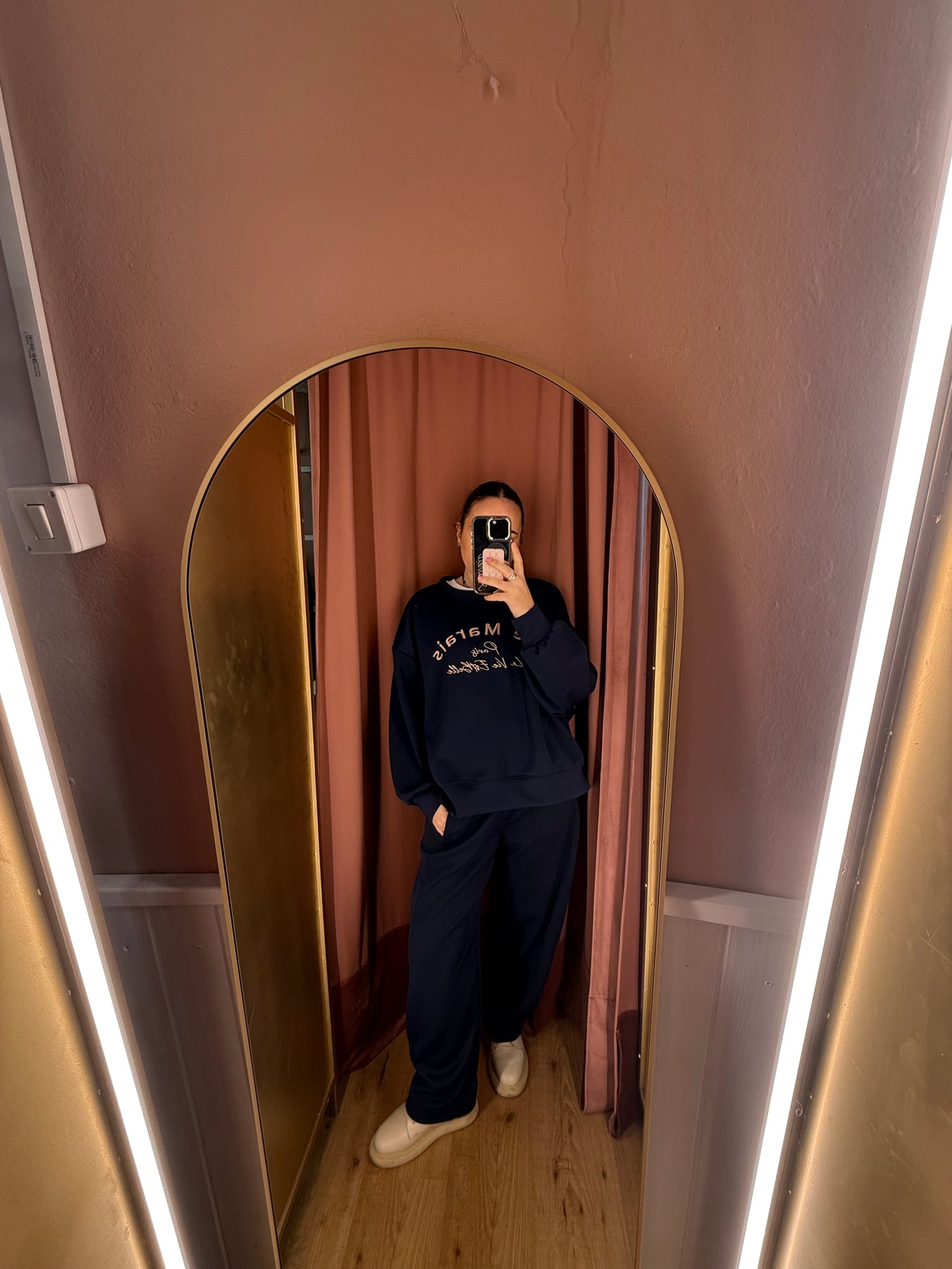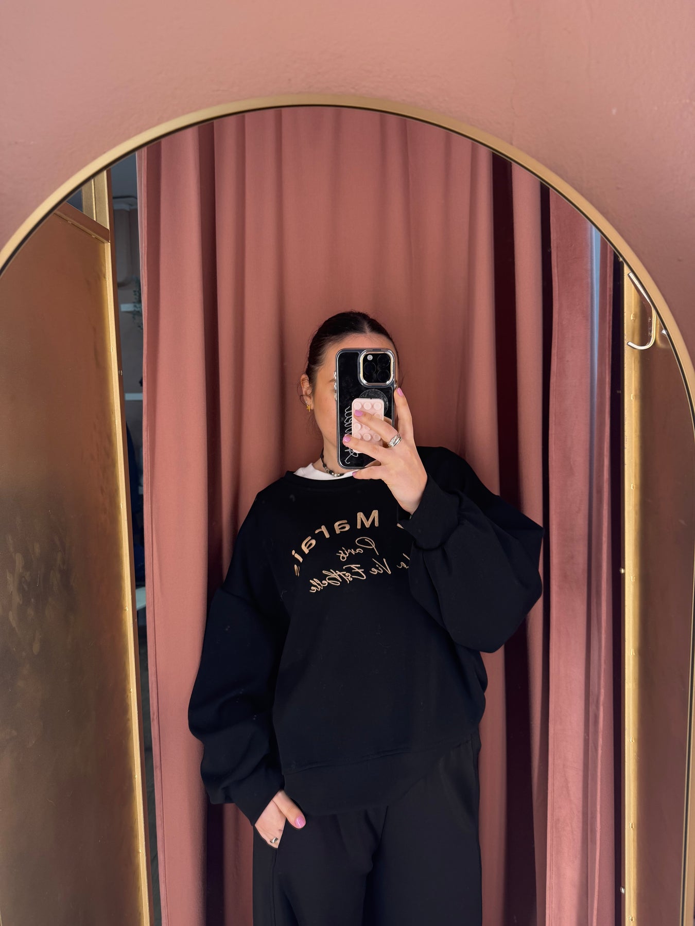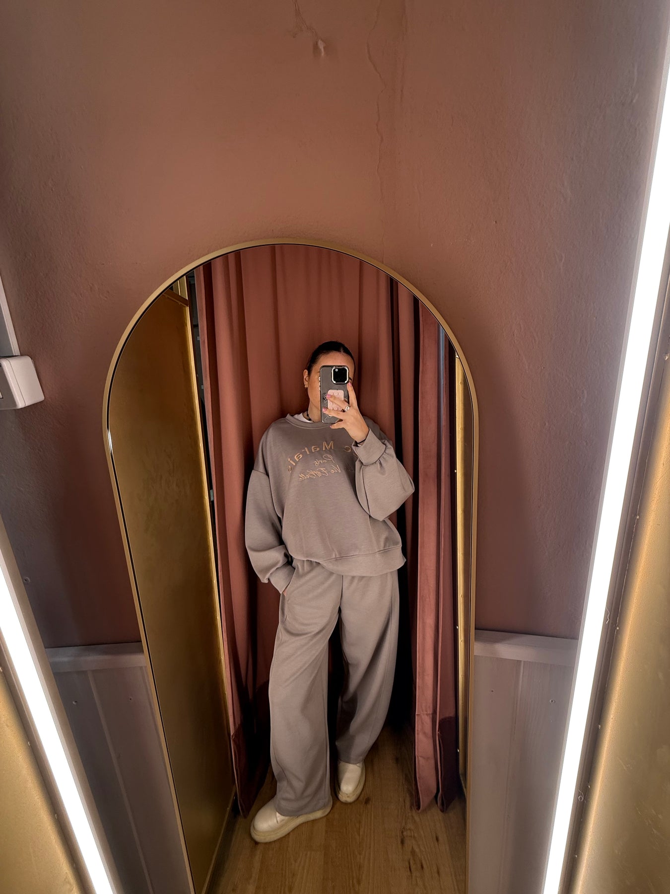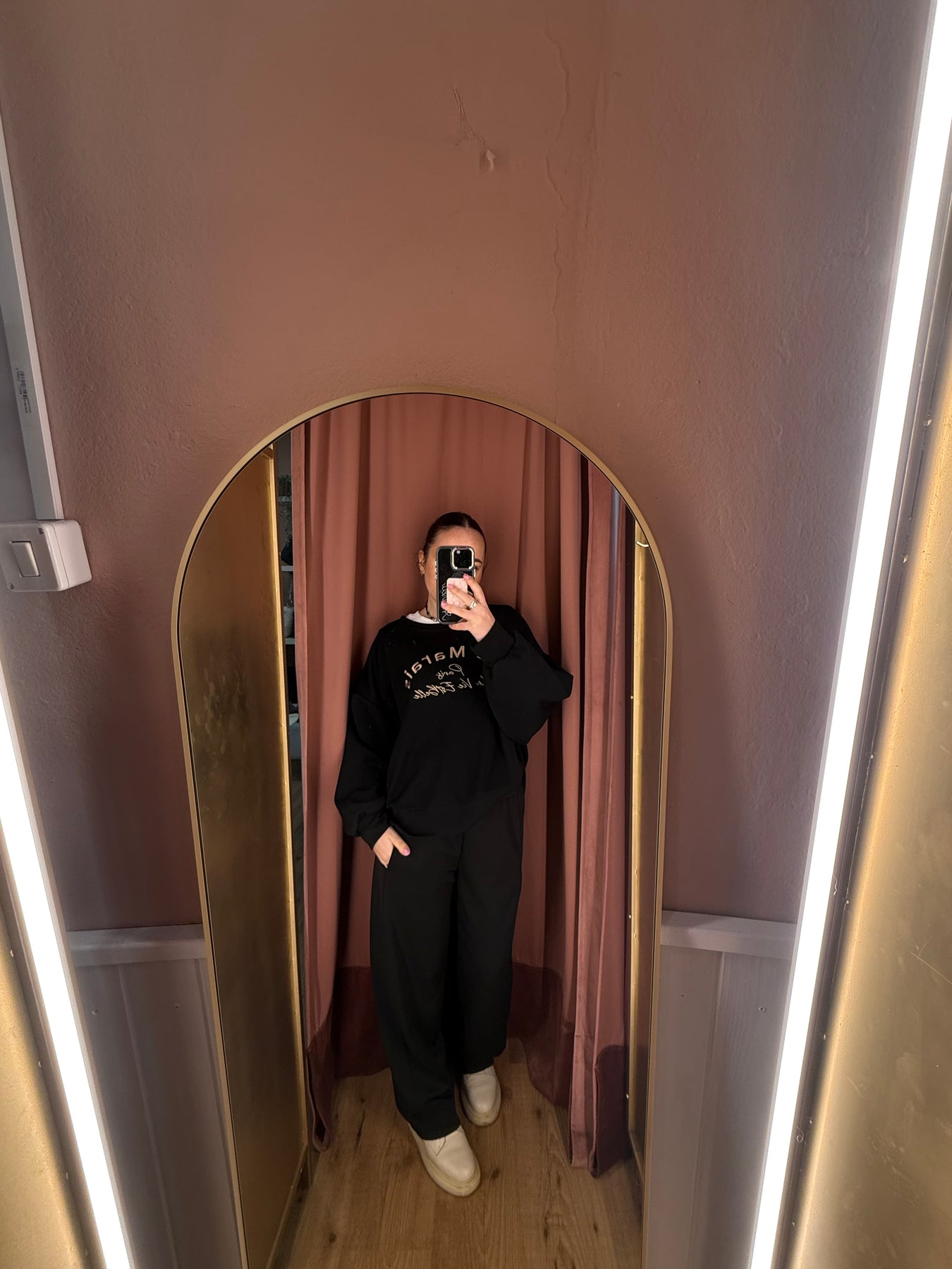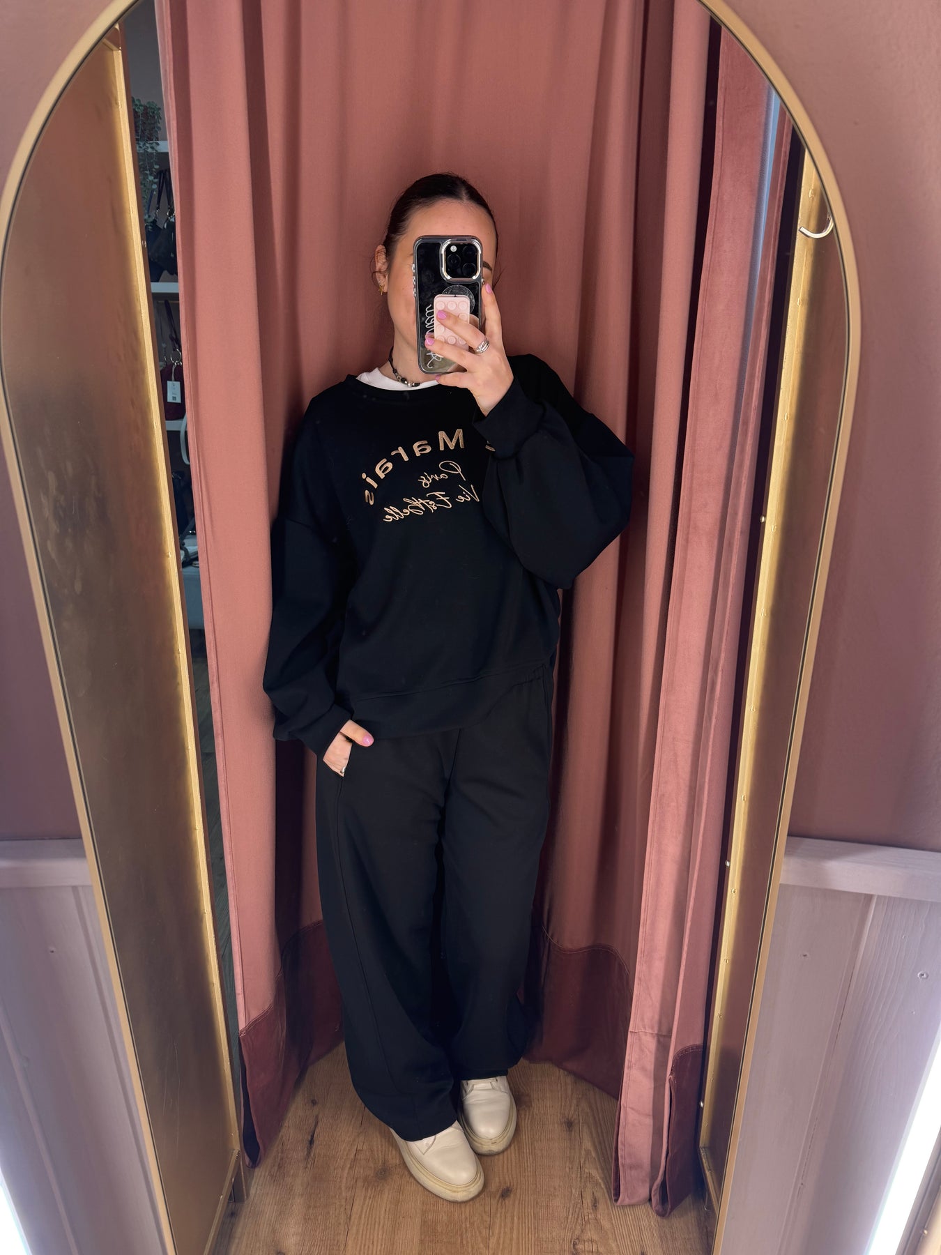 Completo maglia con scritta a girocollo e pantalone carrot in neoprene con vita elastica.