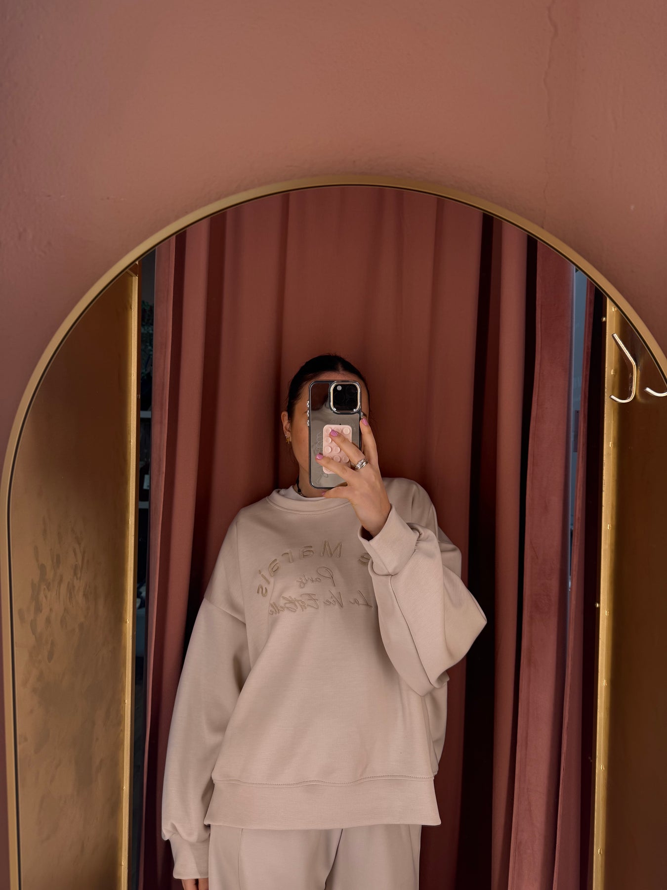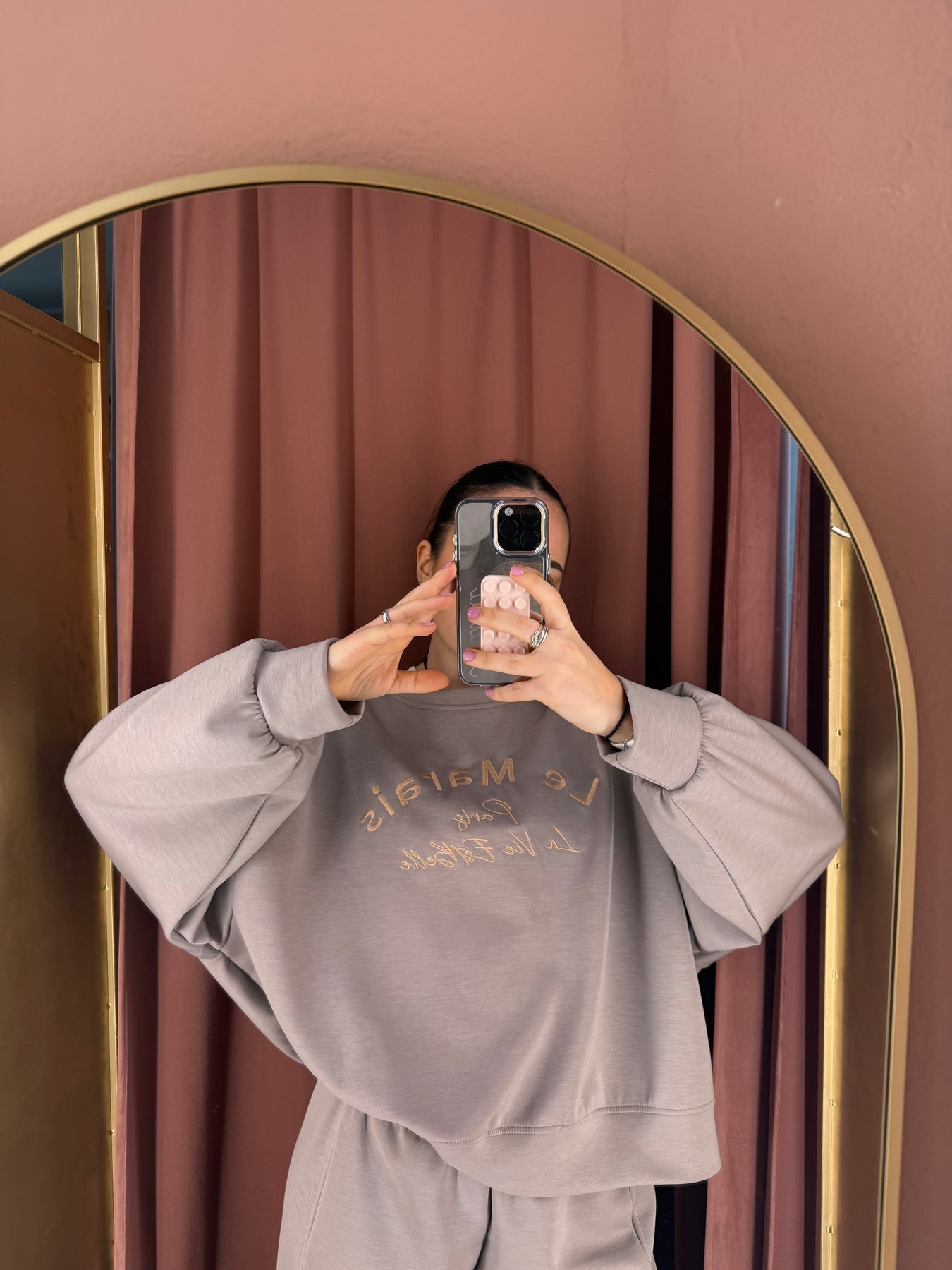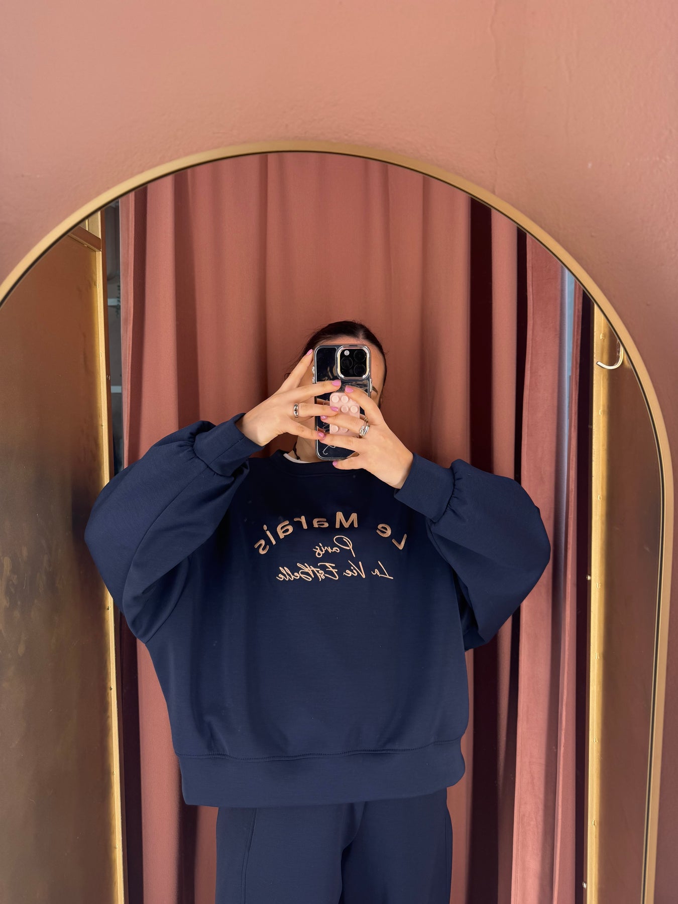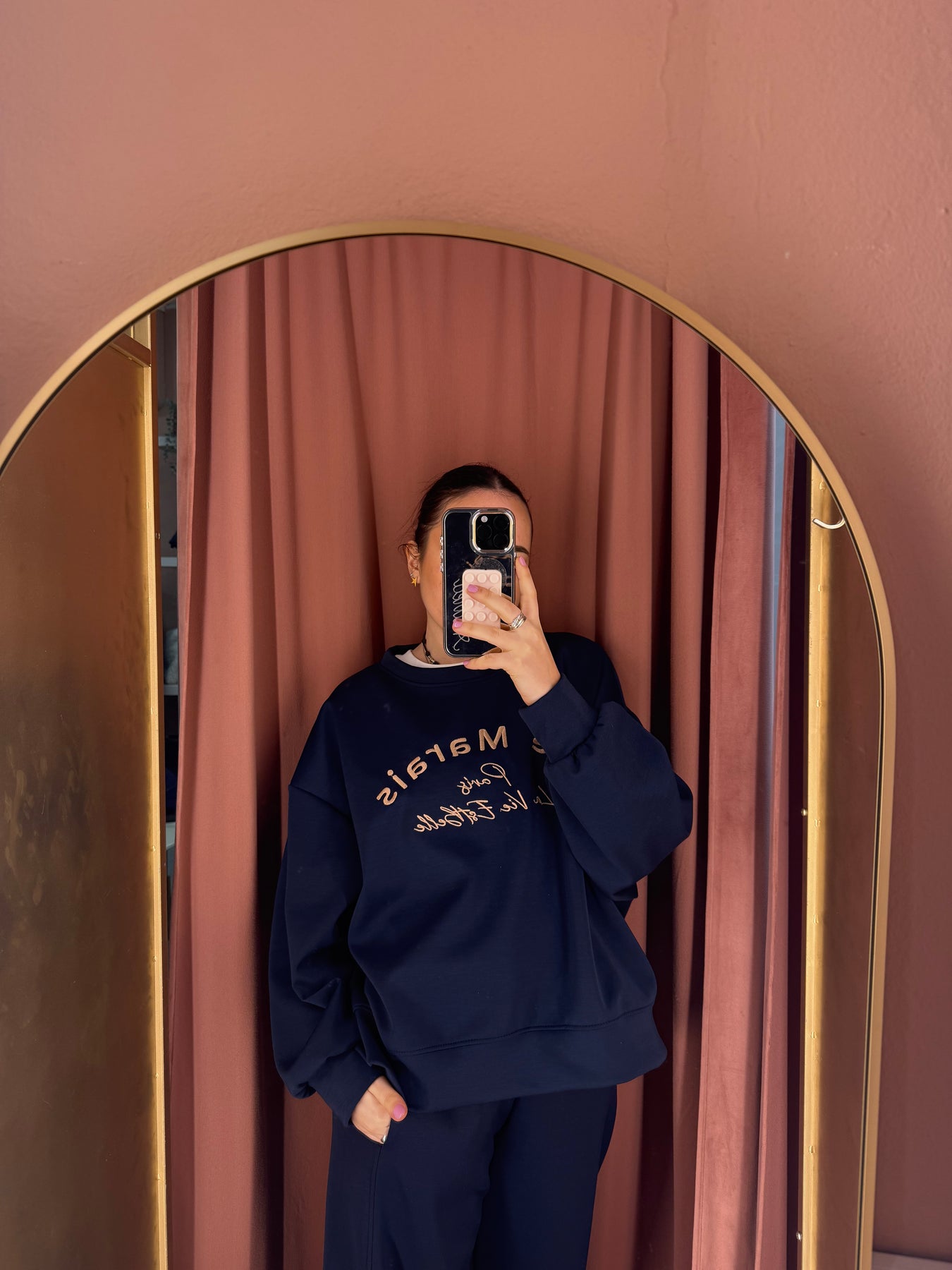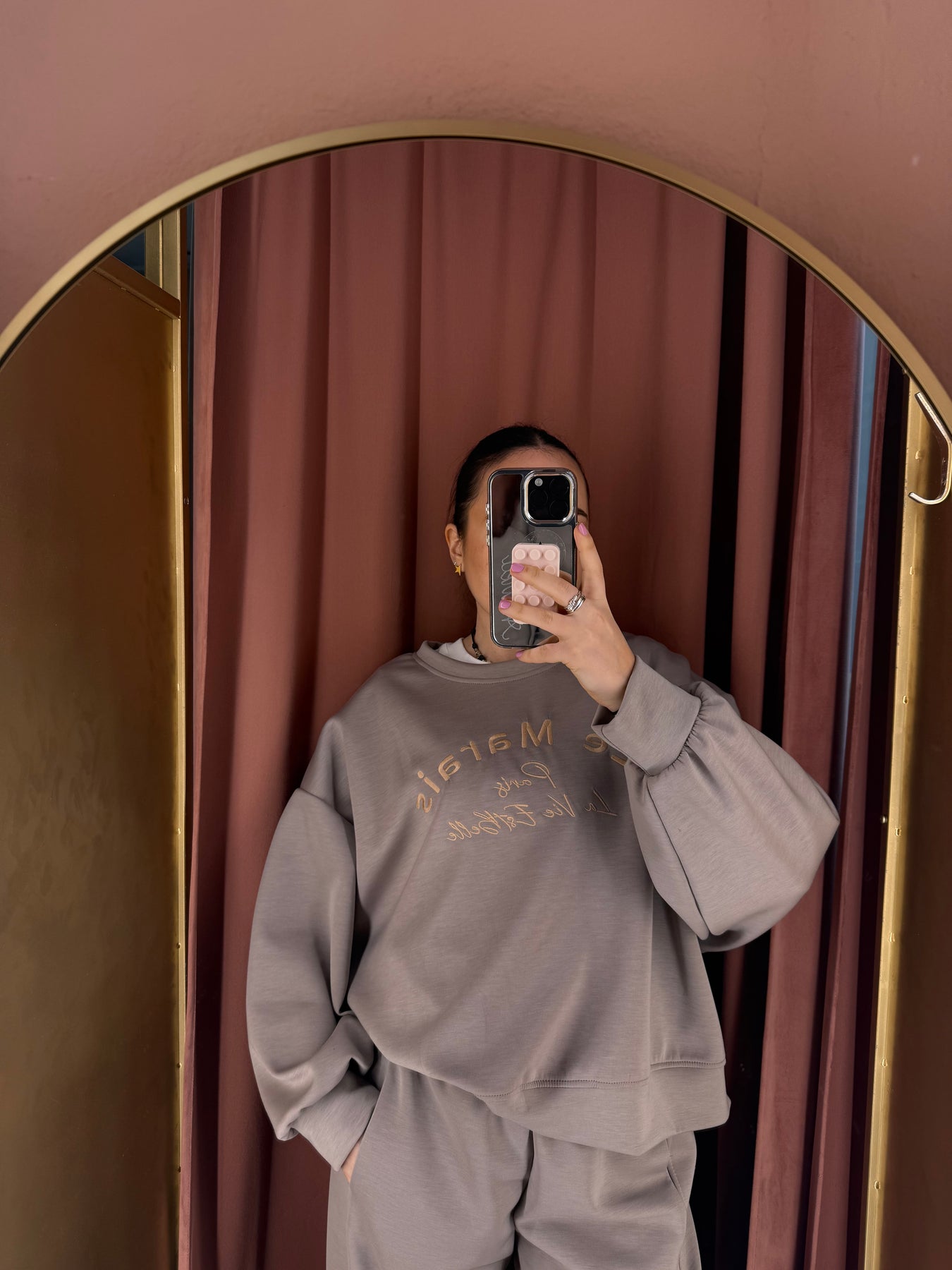 Completo maglia con scritta a girocollo e pantalone carrot in neoprene con vita elastica.