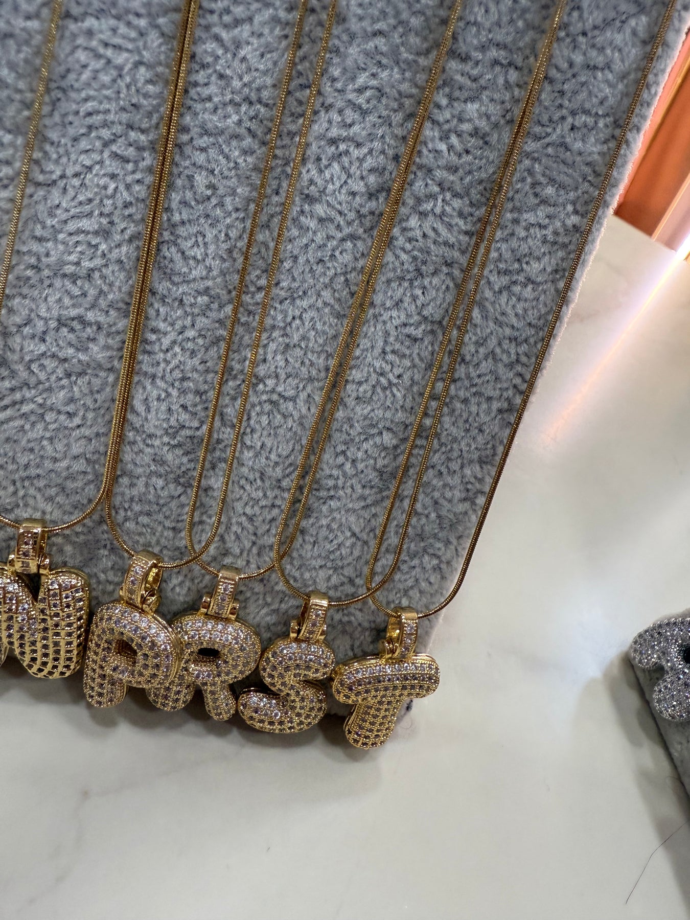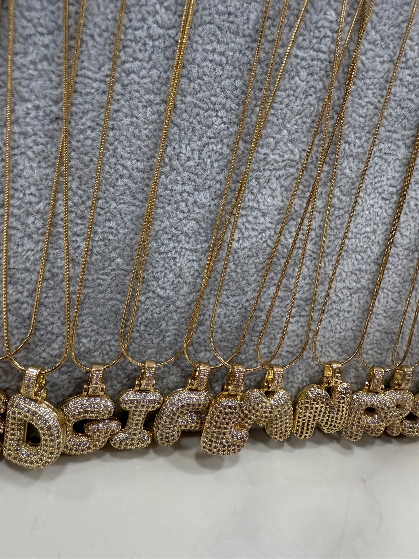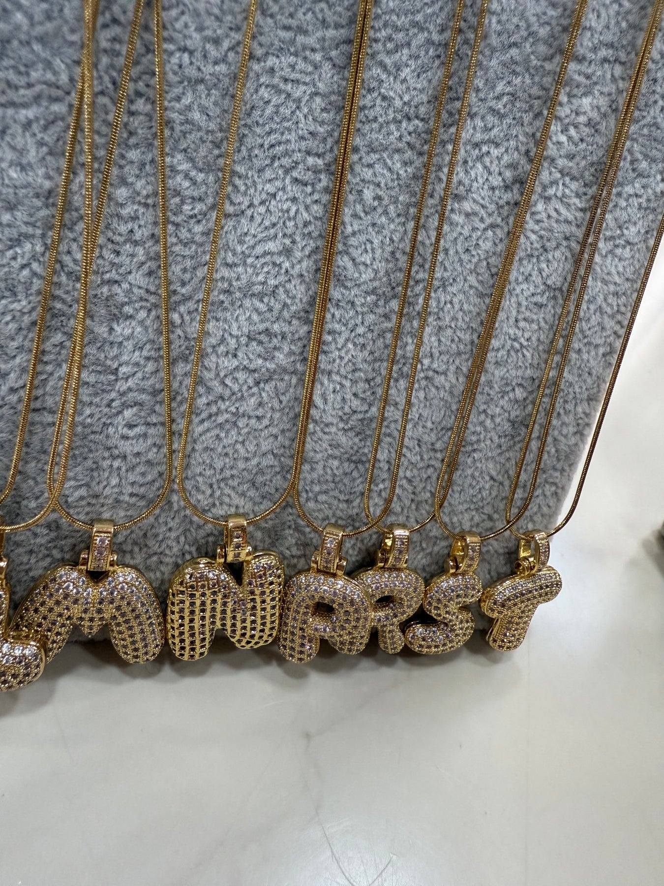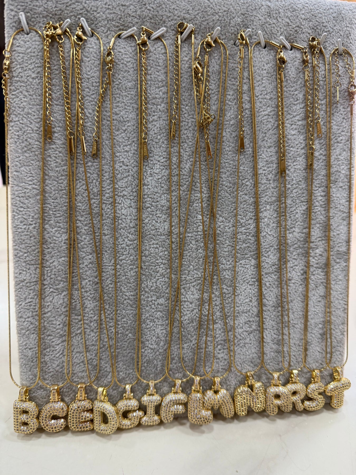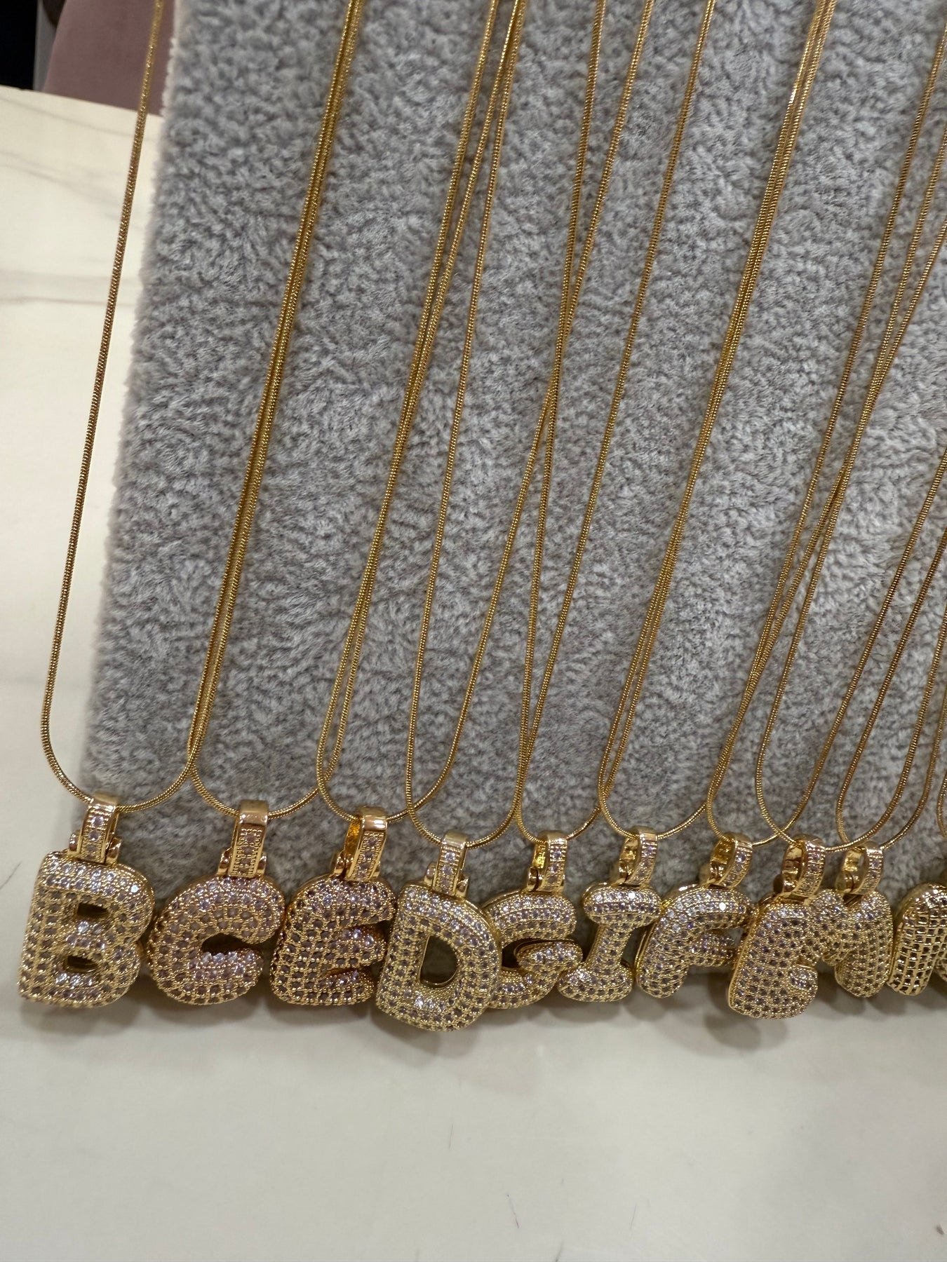 Collana girocollo color oro da 40 cm con allungo e lettera bombata con strass .