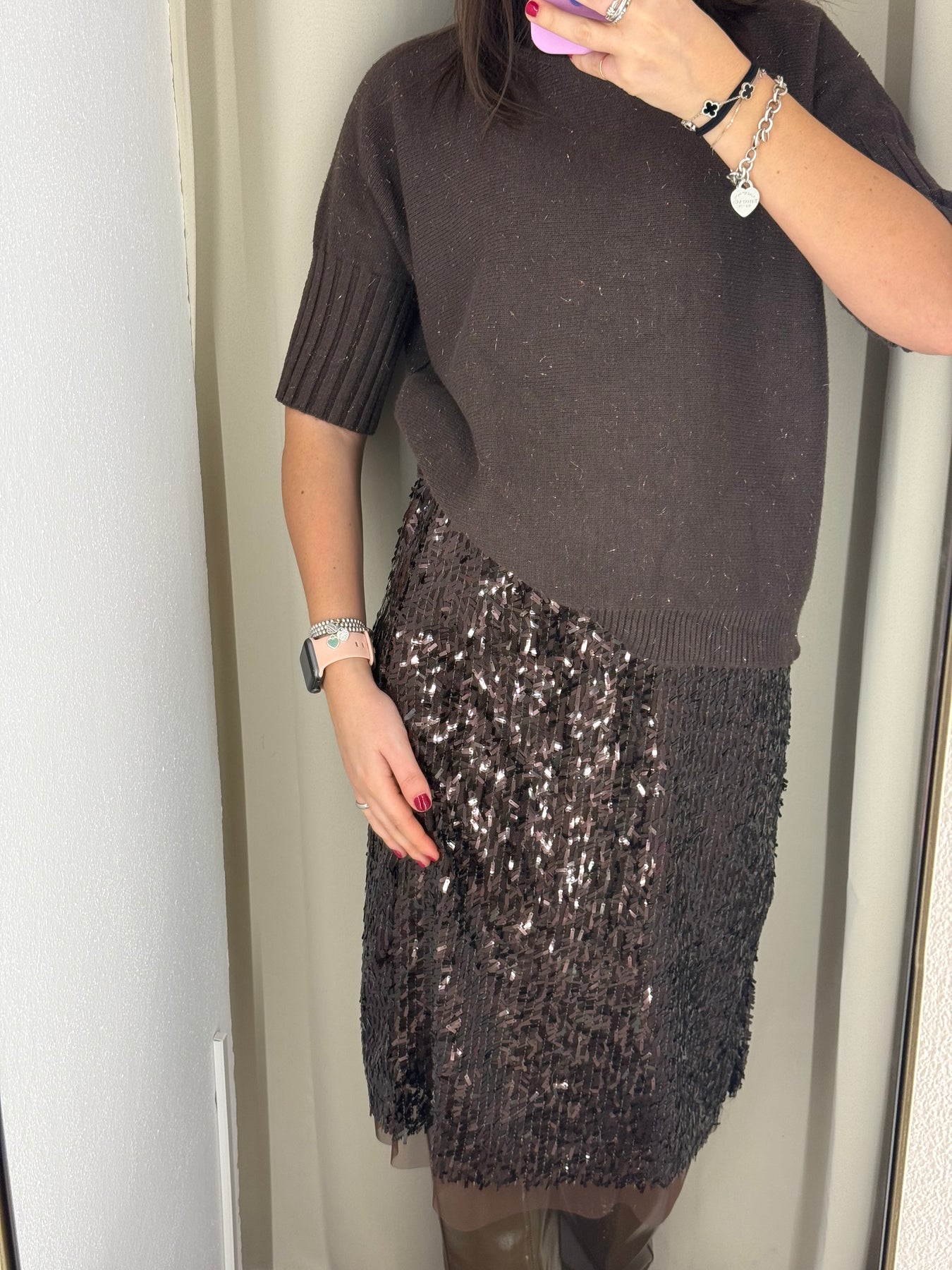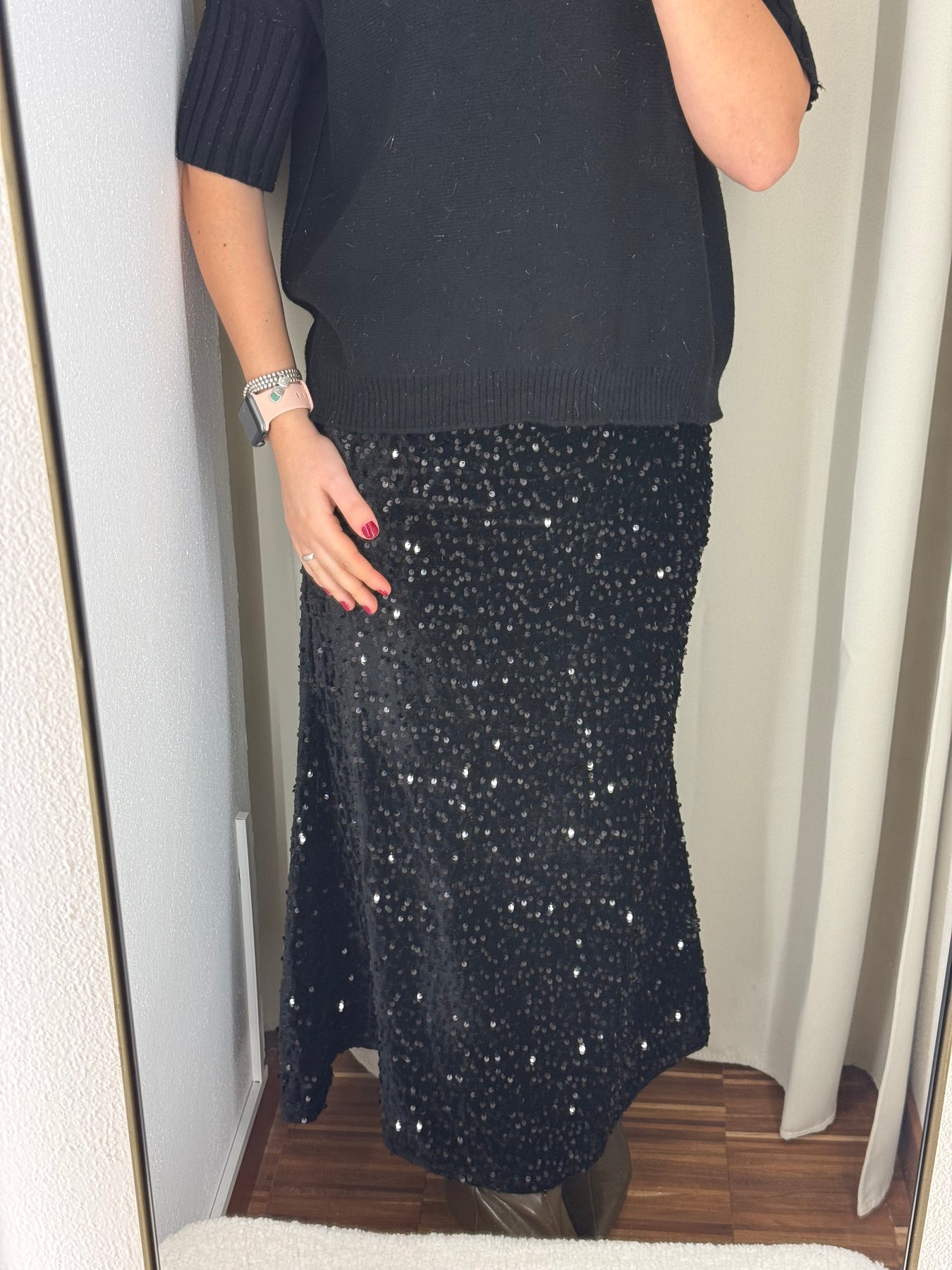 Gonna lunga con pailettes luminose con sotto veste, taglia unica, vita elasticizzata.