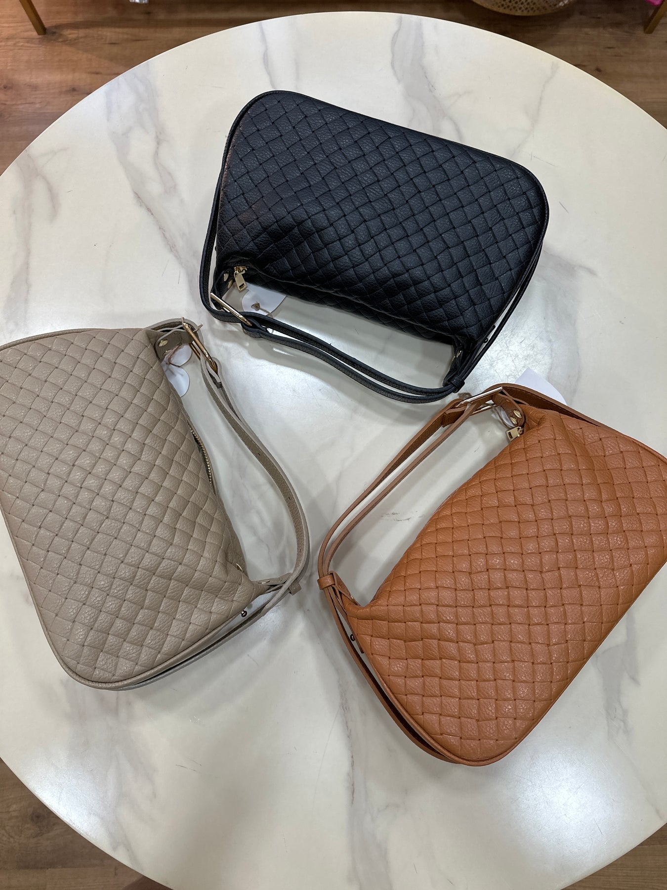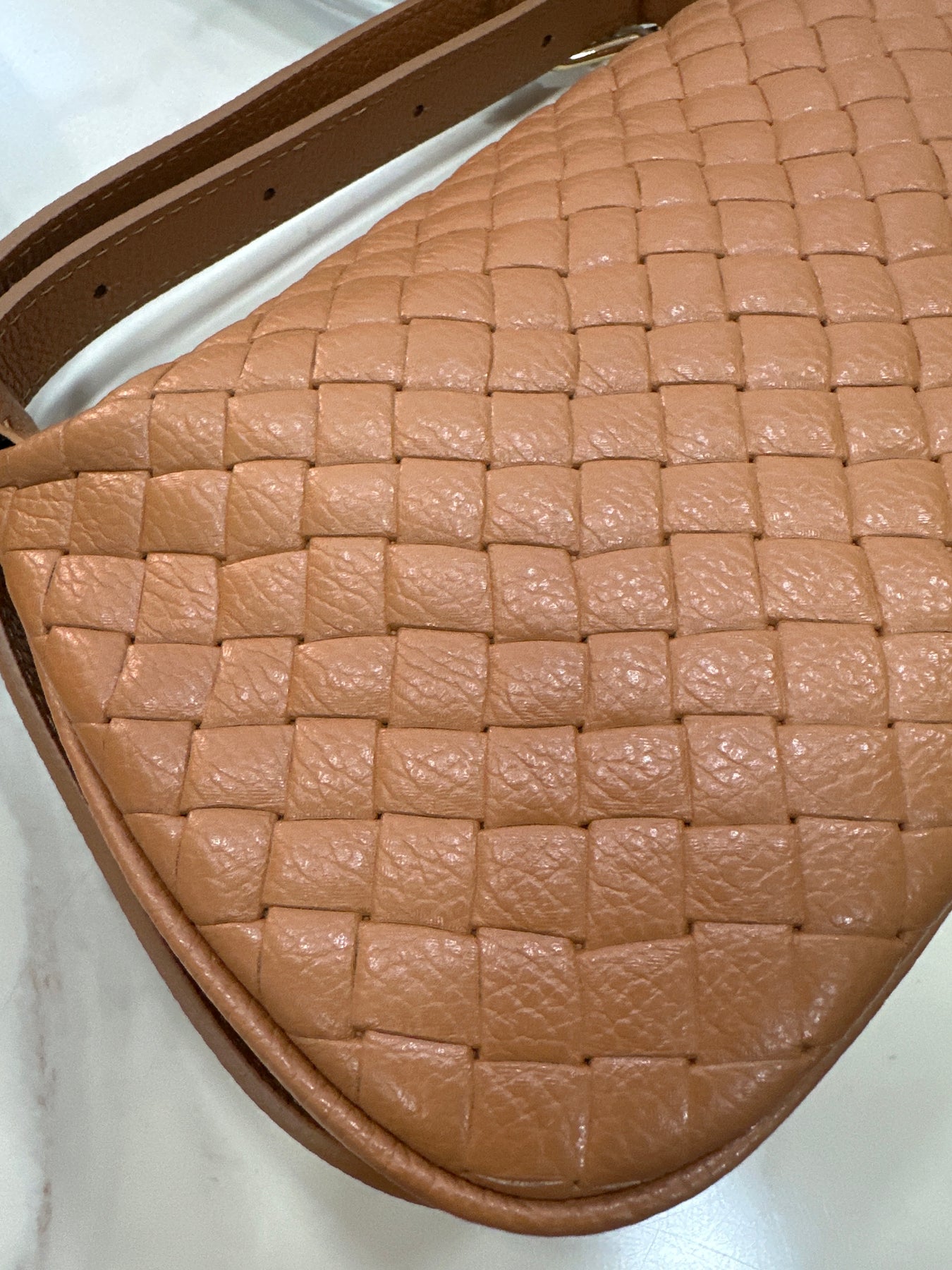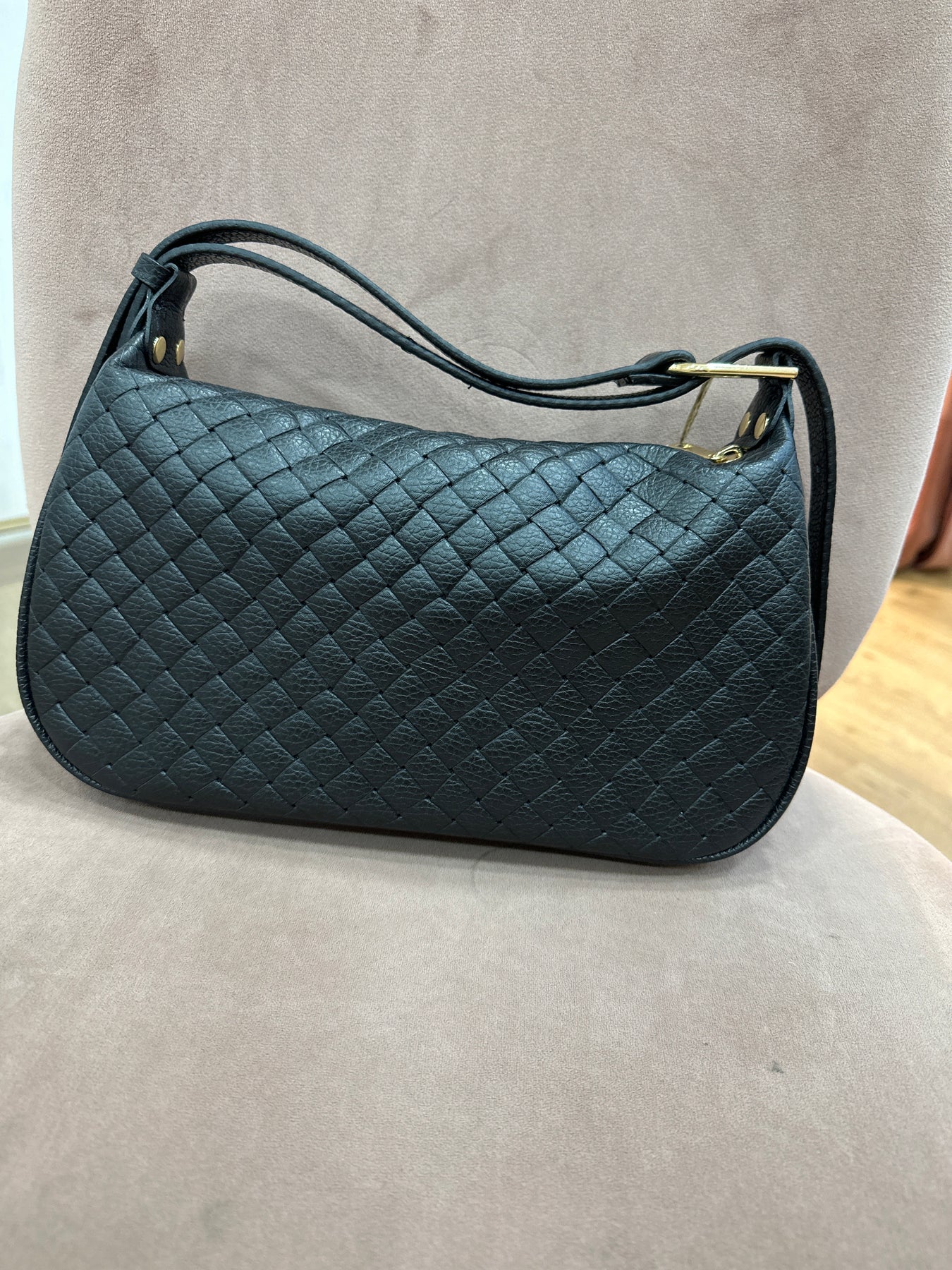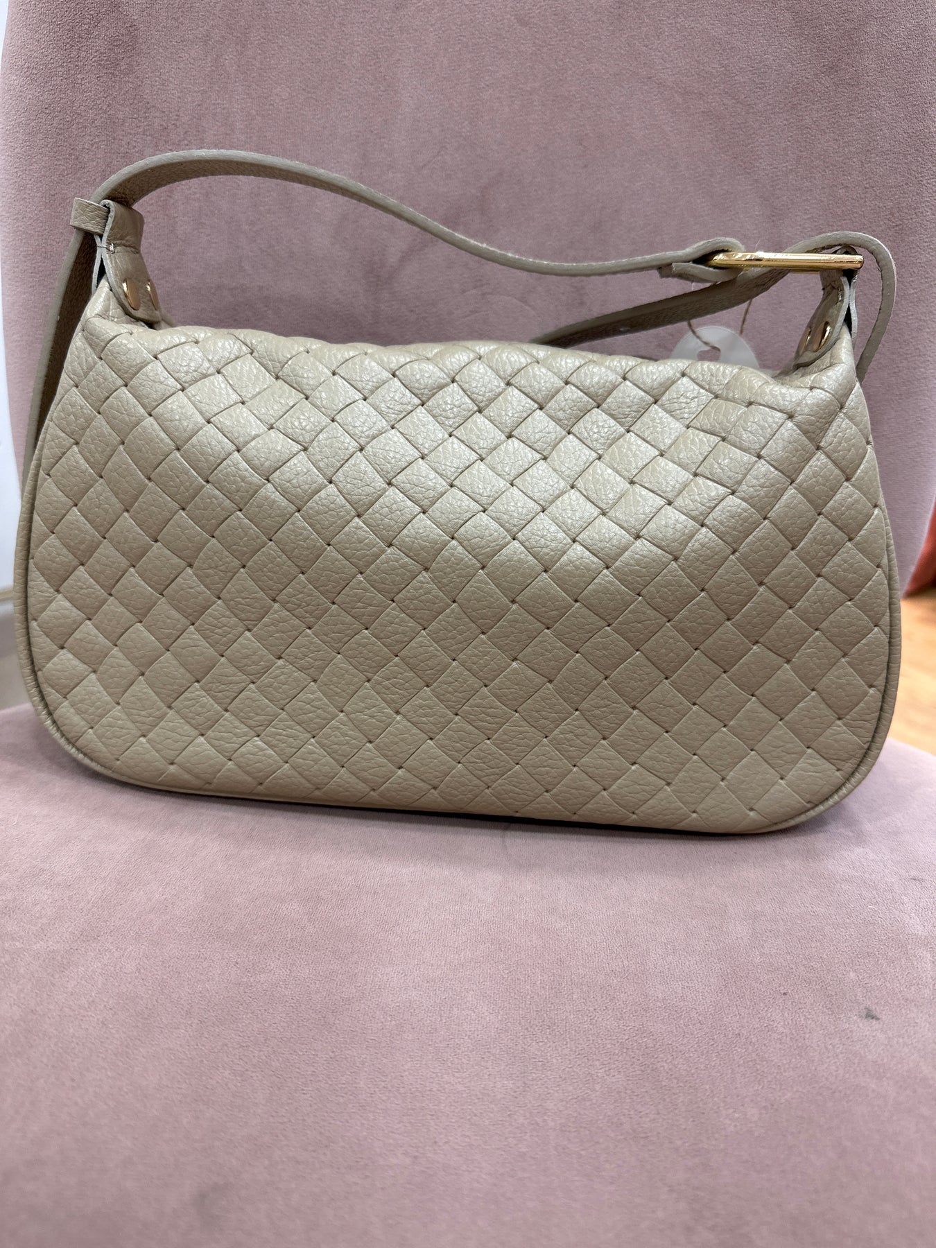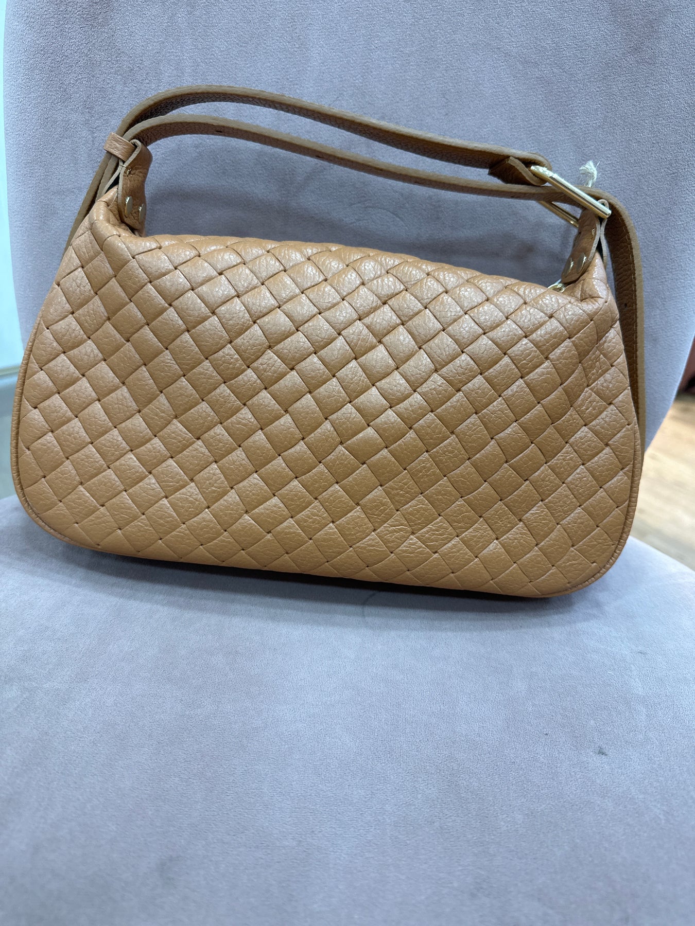 Borsa in vera pelle con manico corto e tessuto a quadri in pelle .