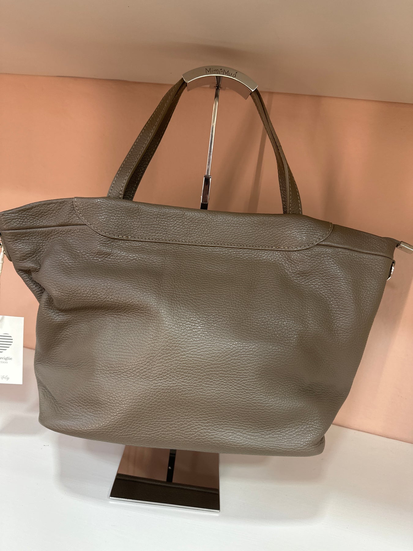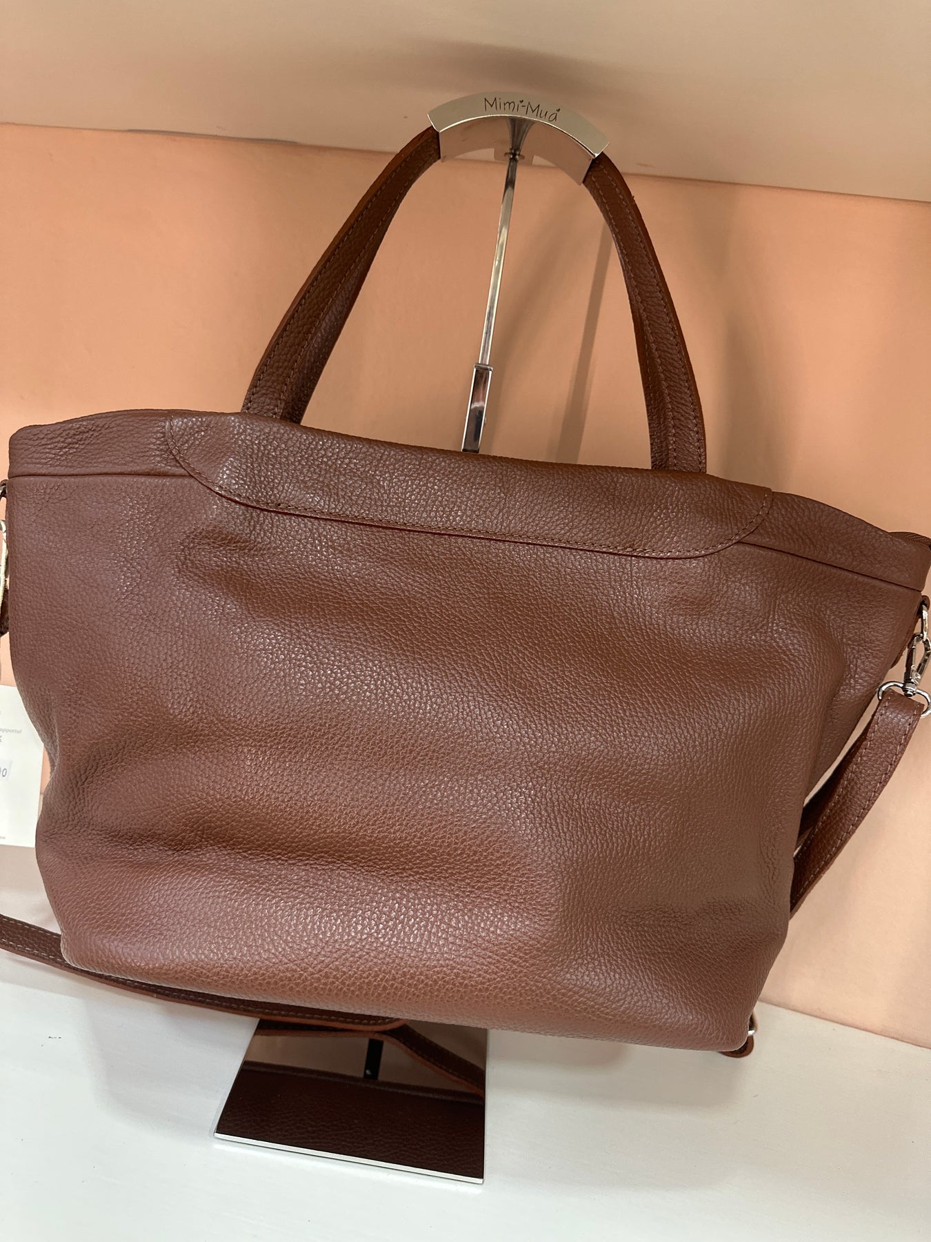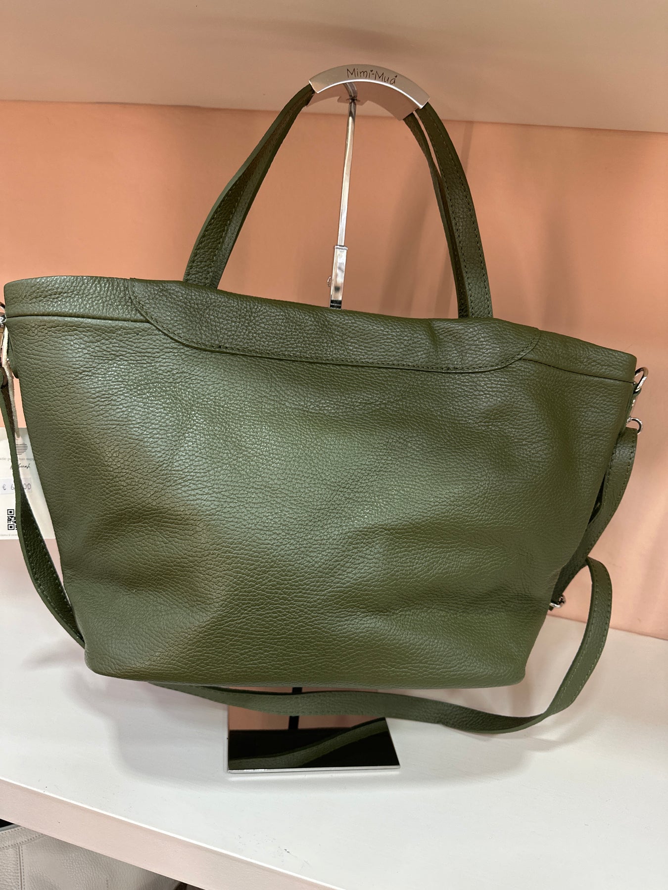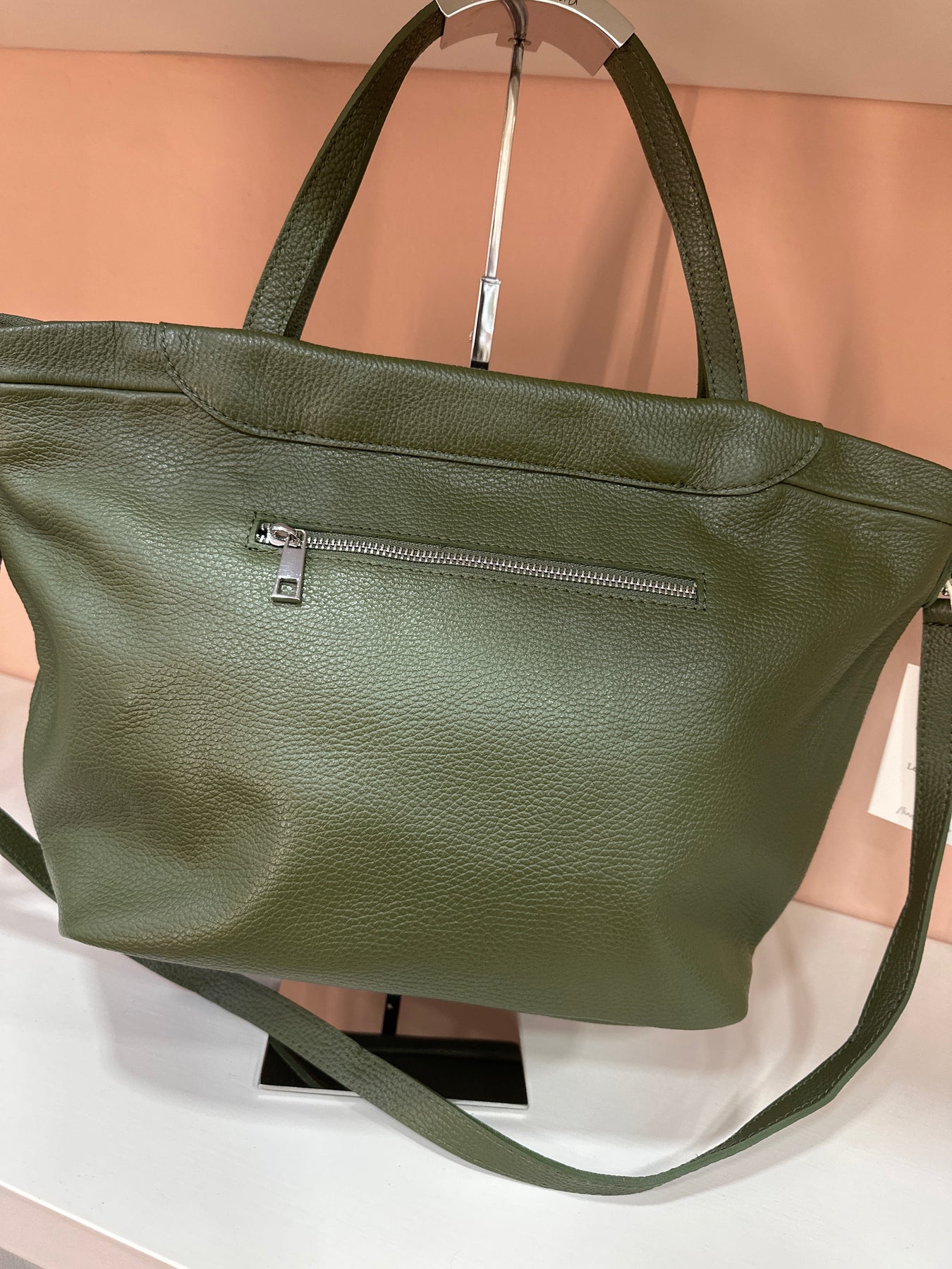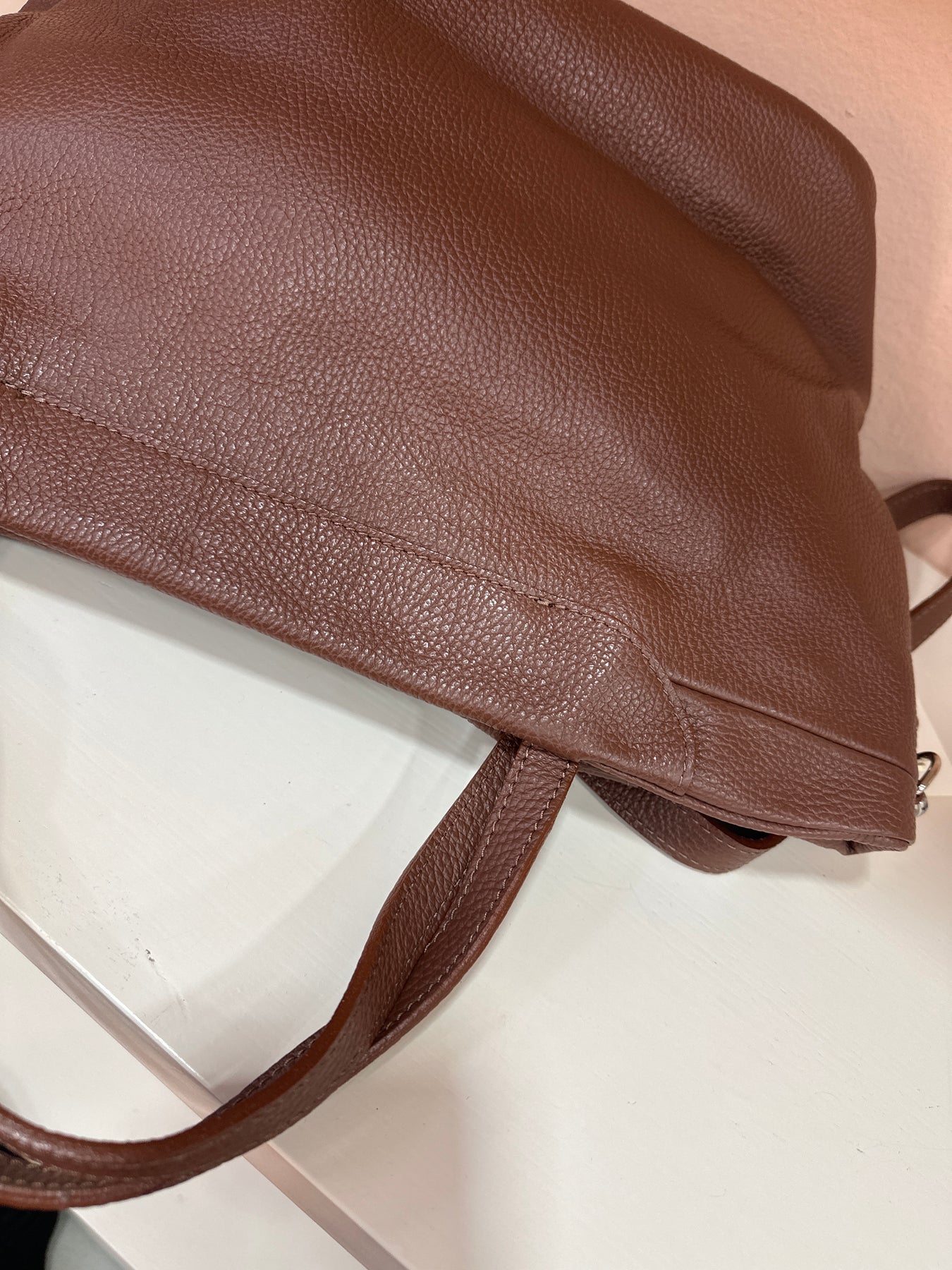 Borsa in vera pelle con doppio manico a mano e tracolla regolabile removibile, interno in cotone.