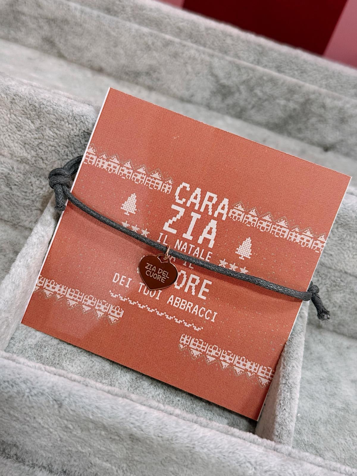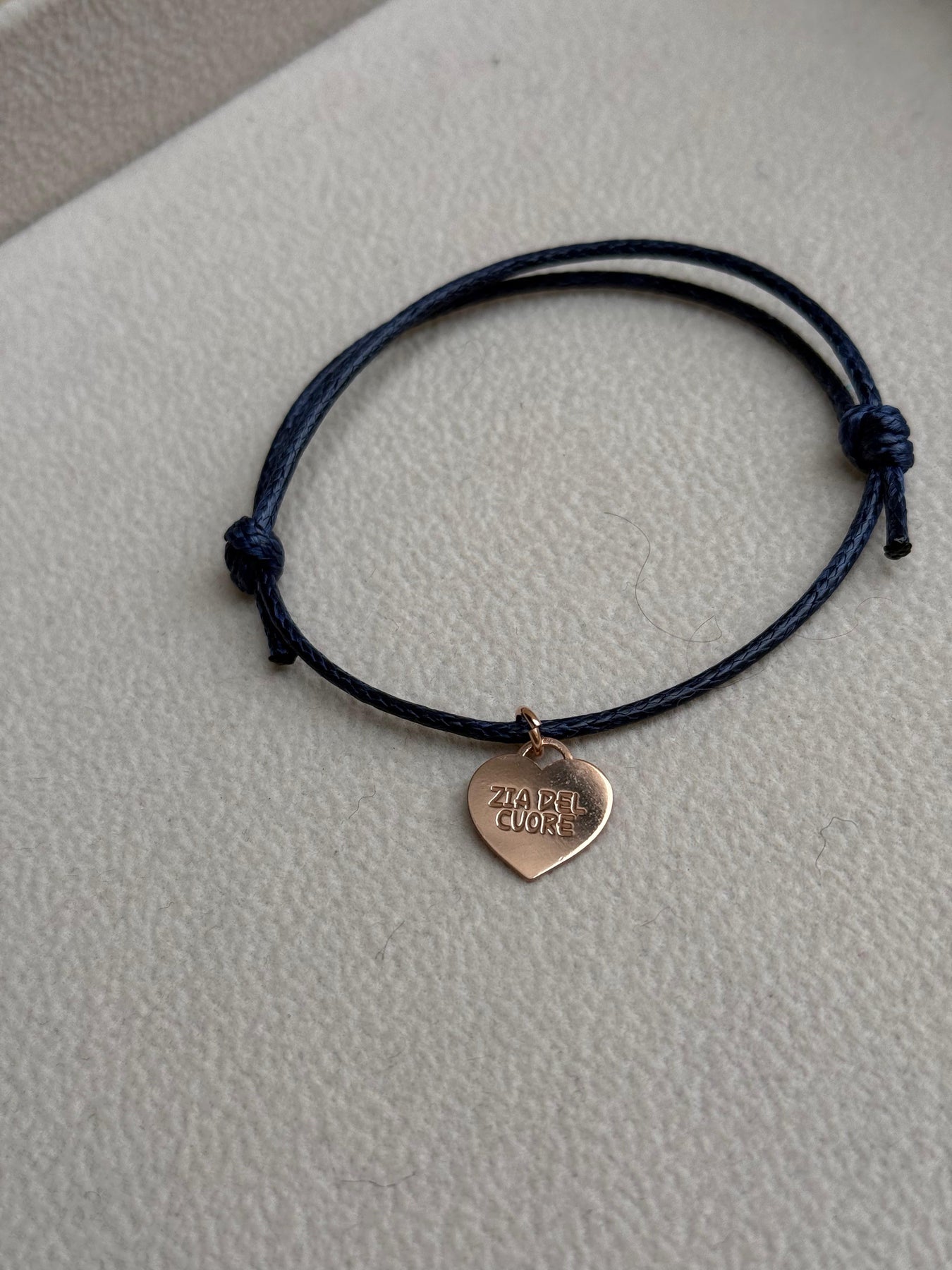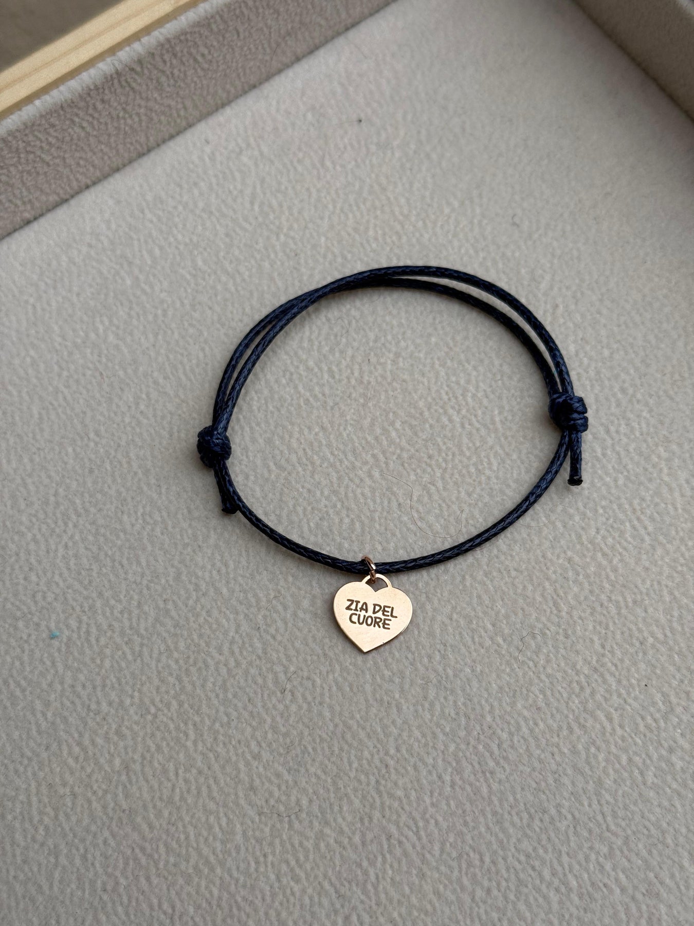 Bracciale con cordino e cuore con scritta Zia del cuore, cordini regolabili e disponibili in diverse varianti colore.