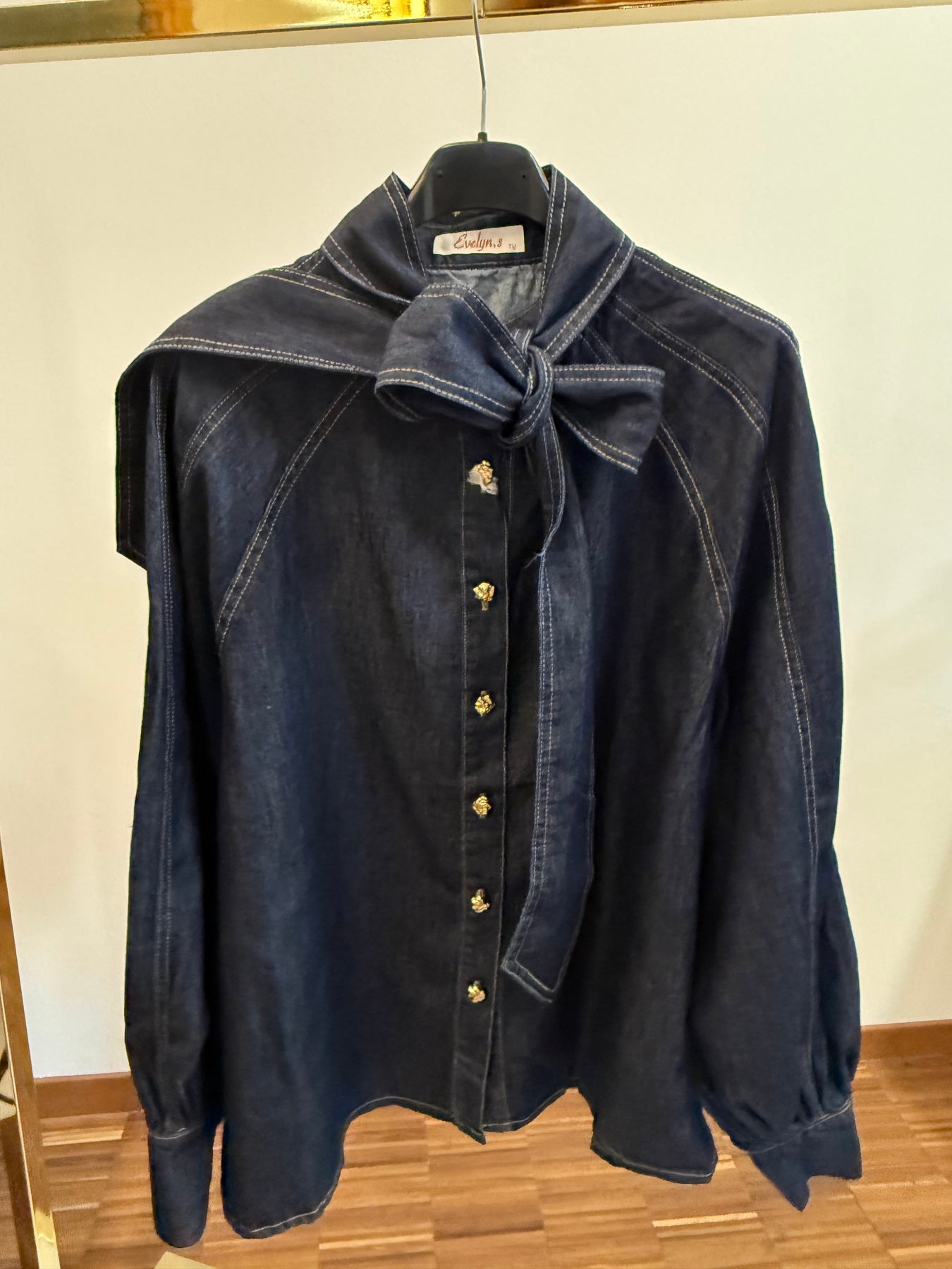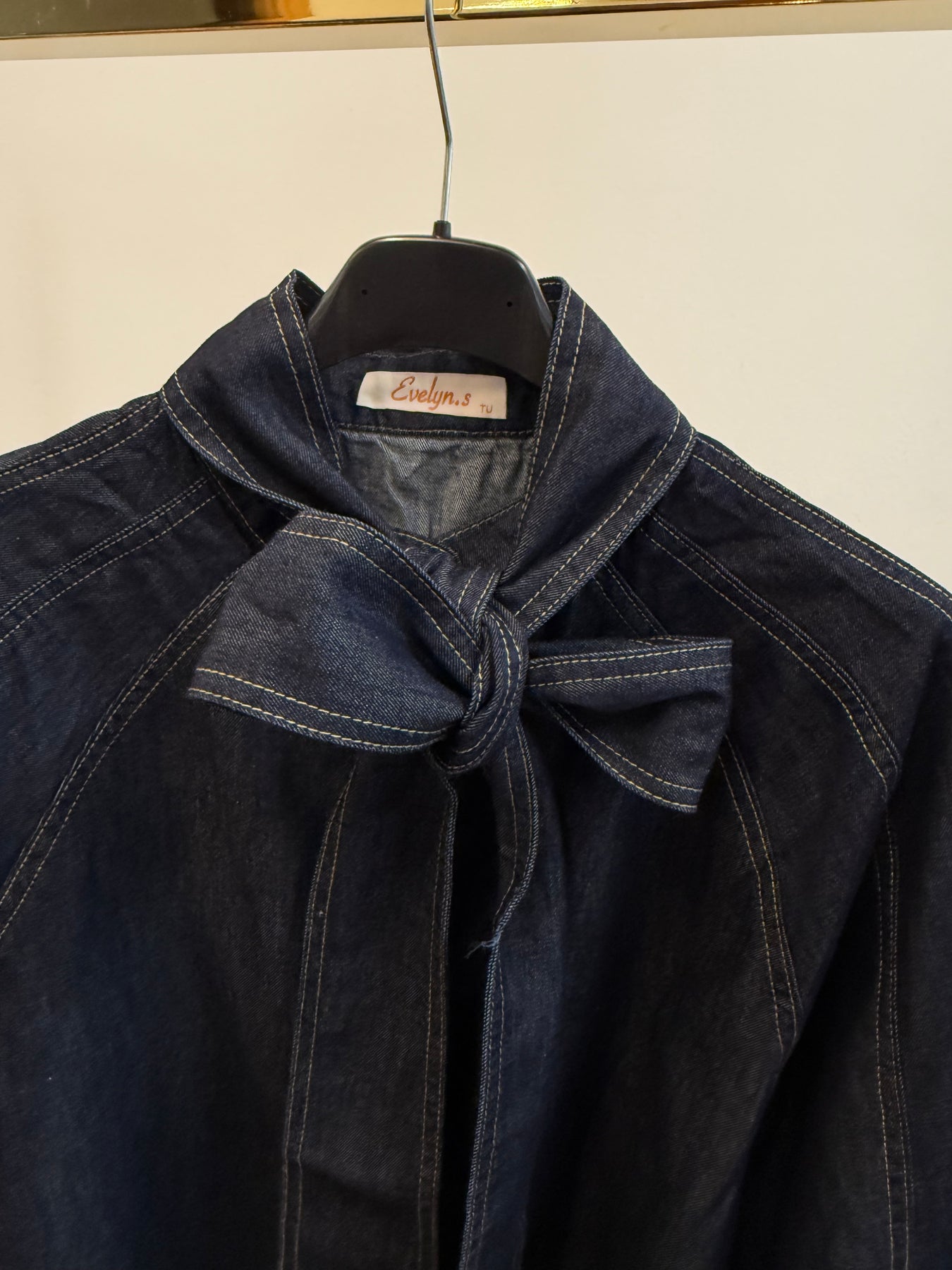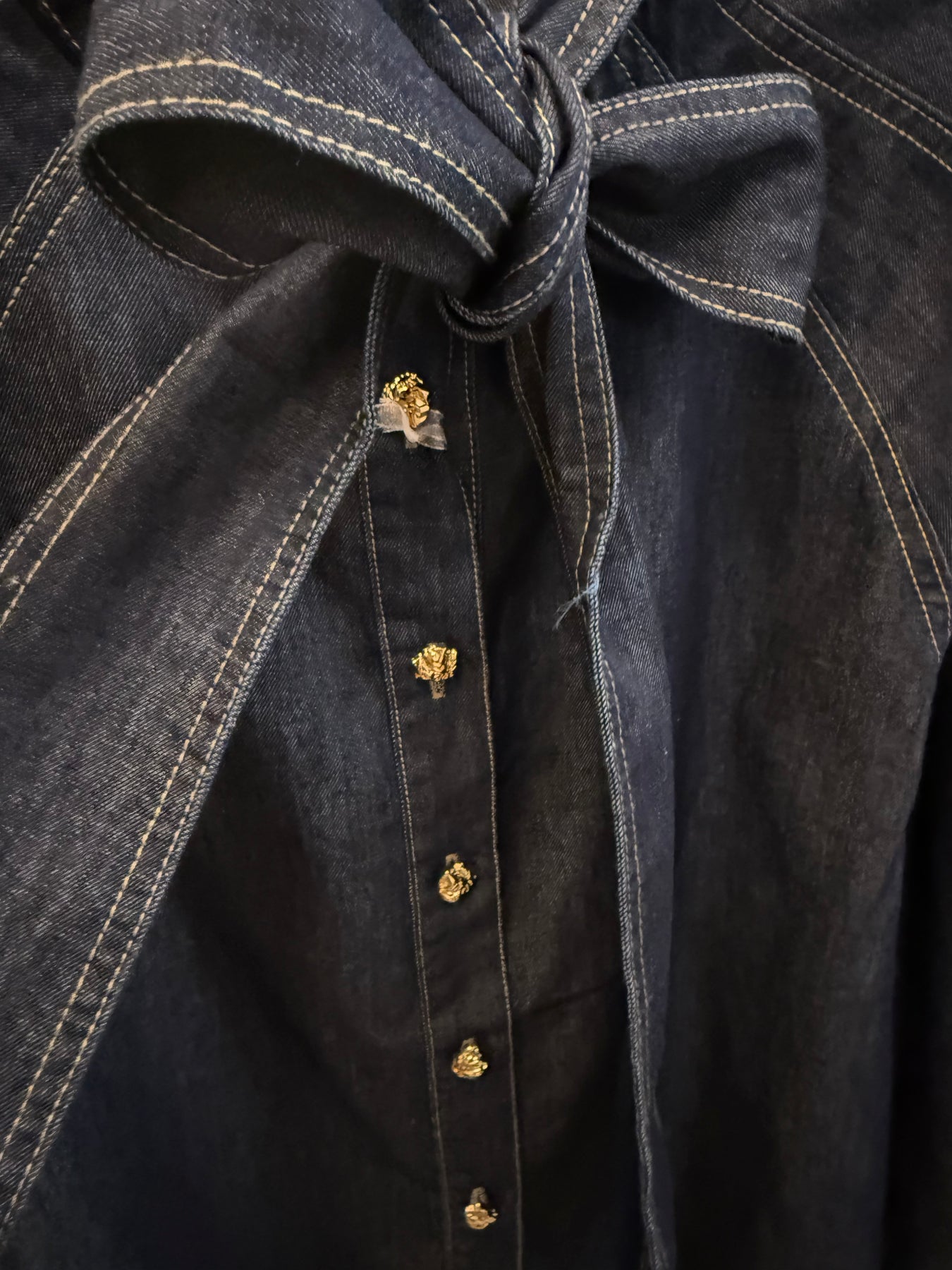 Camicia in jeans di cotone con fiocco e cuciture a vista