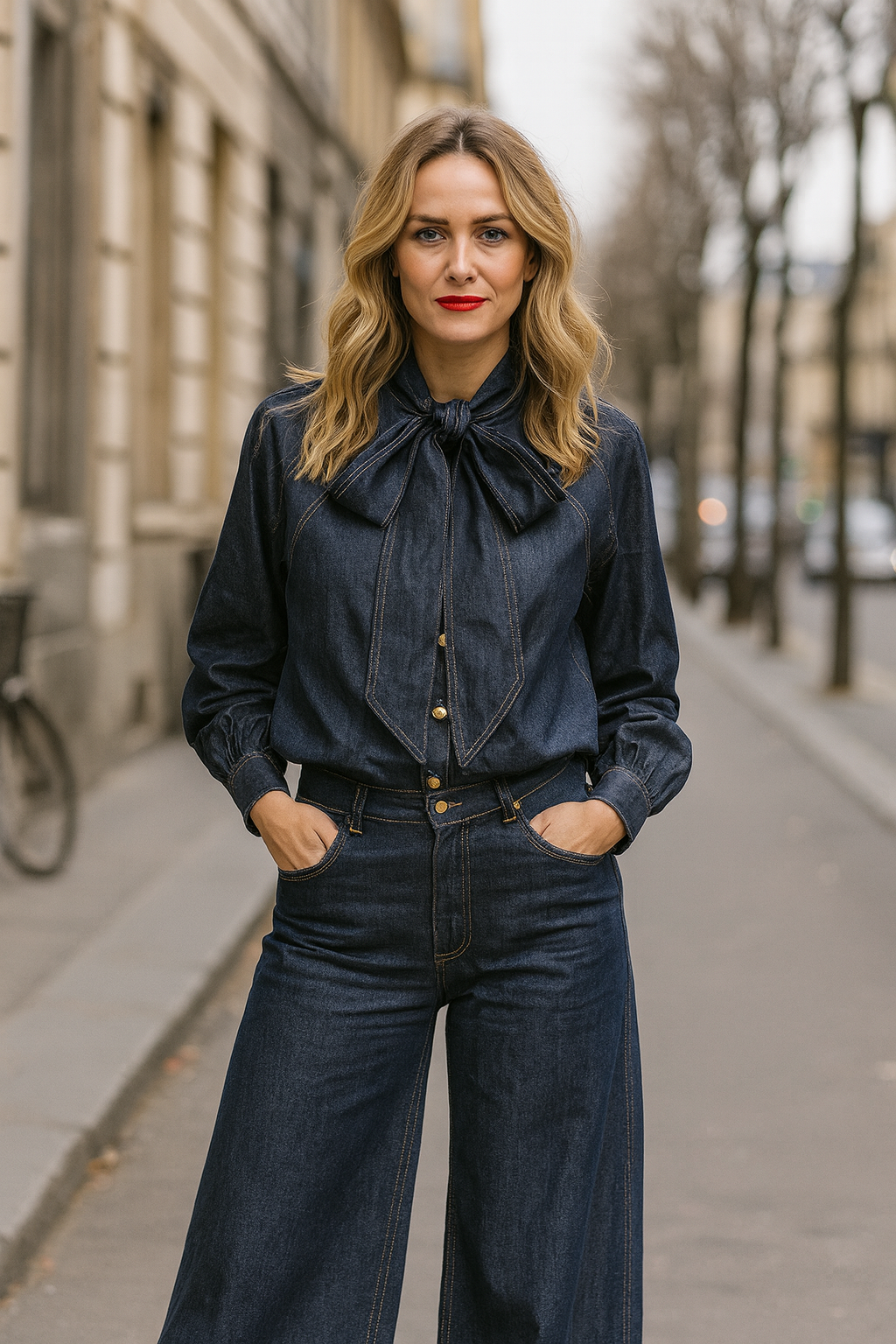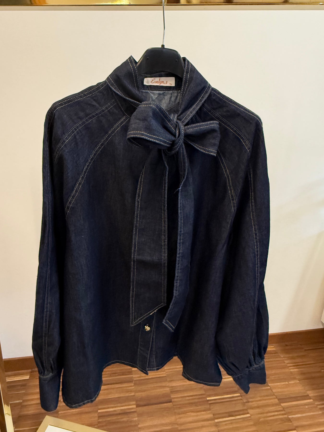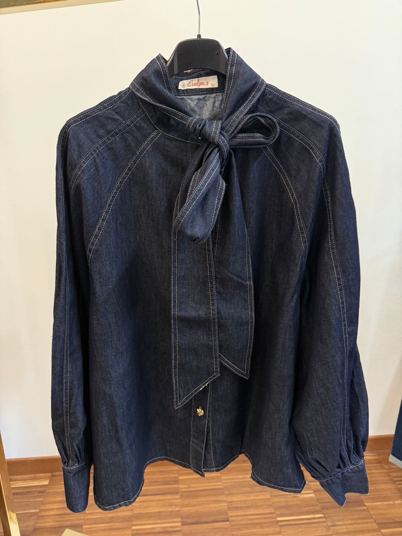 Camicia in jeans di cotone con fiocco e cuciture a vista