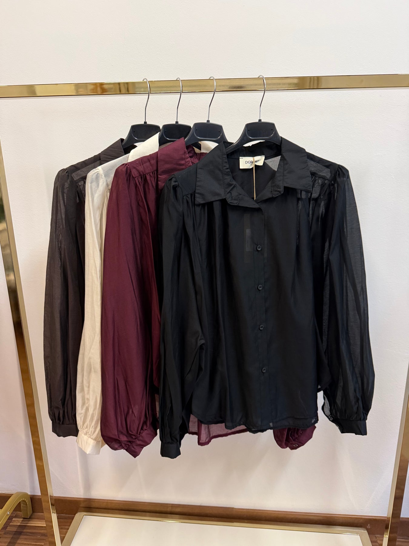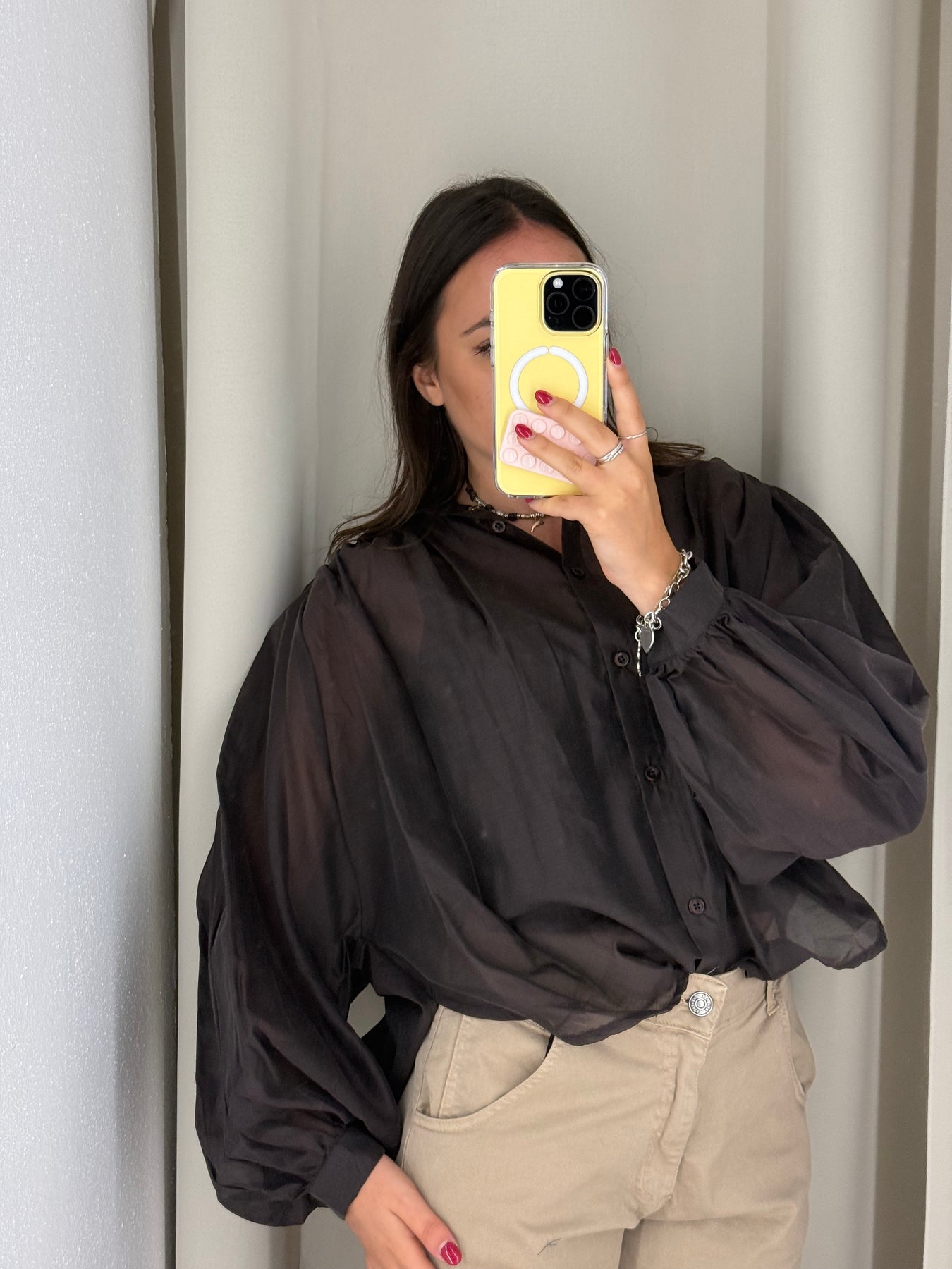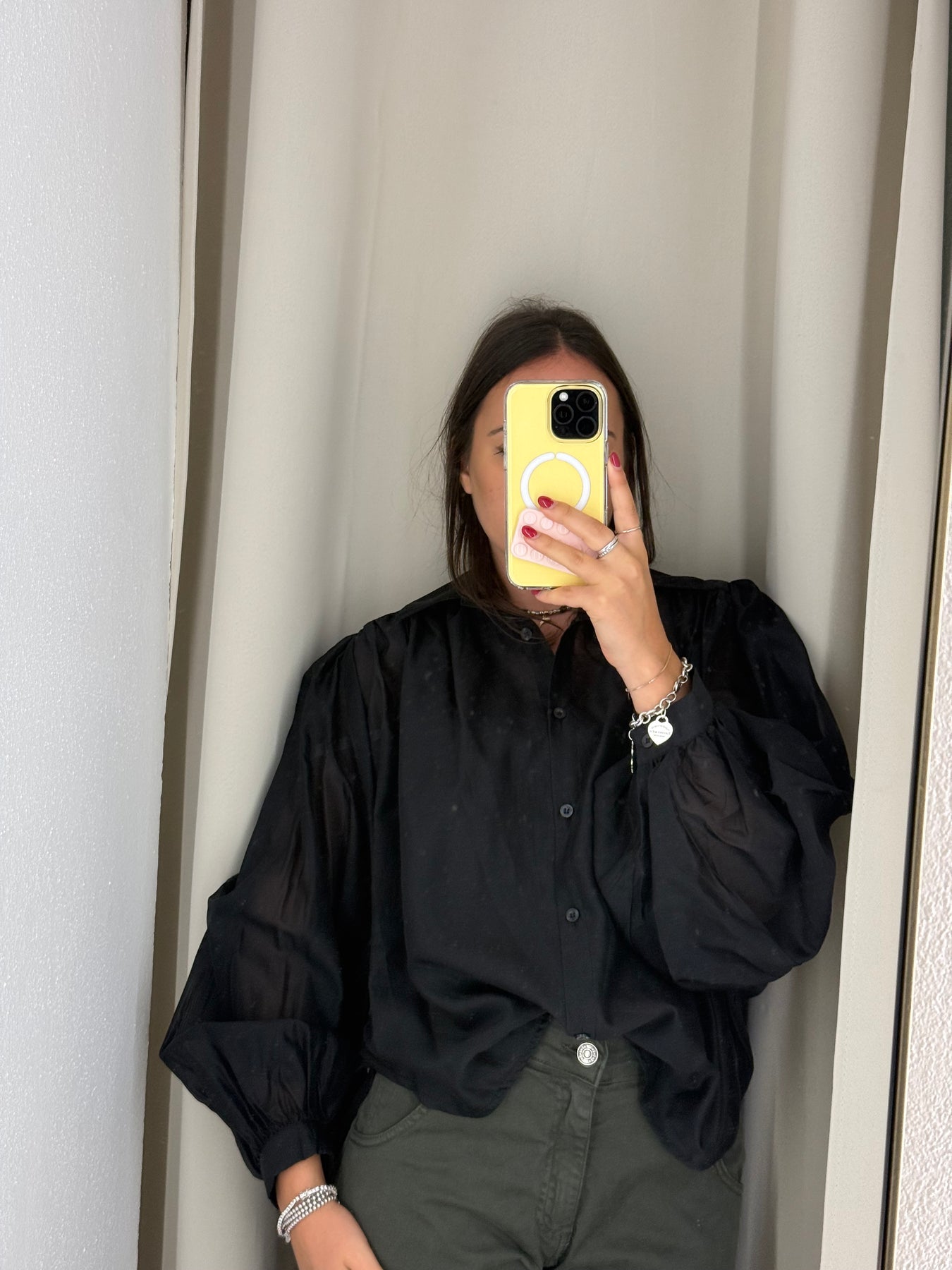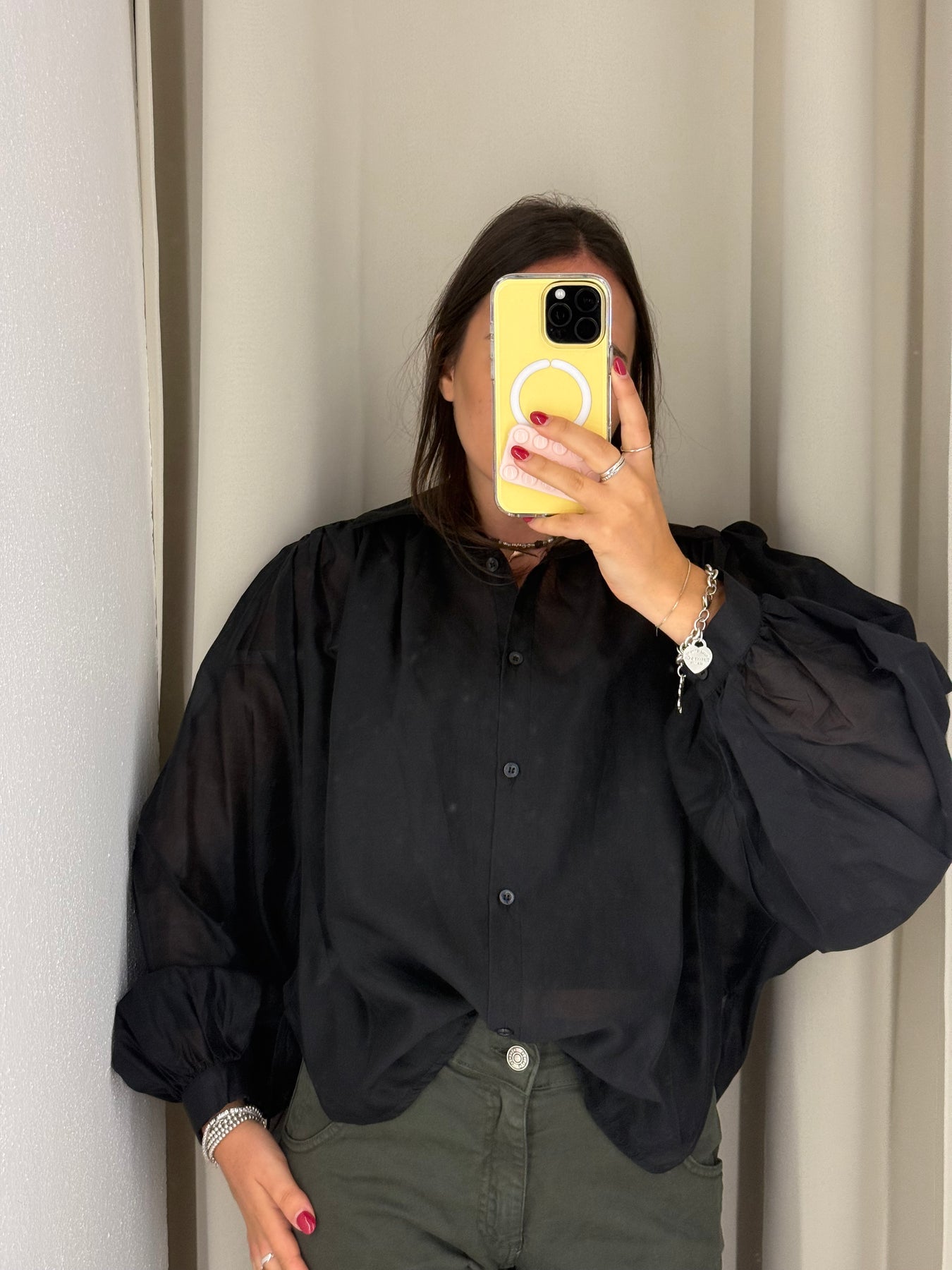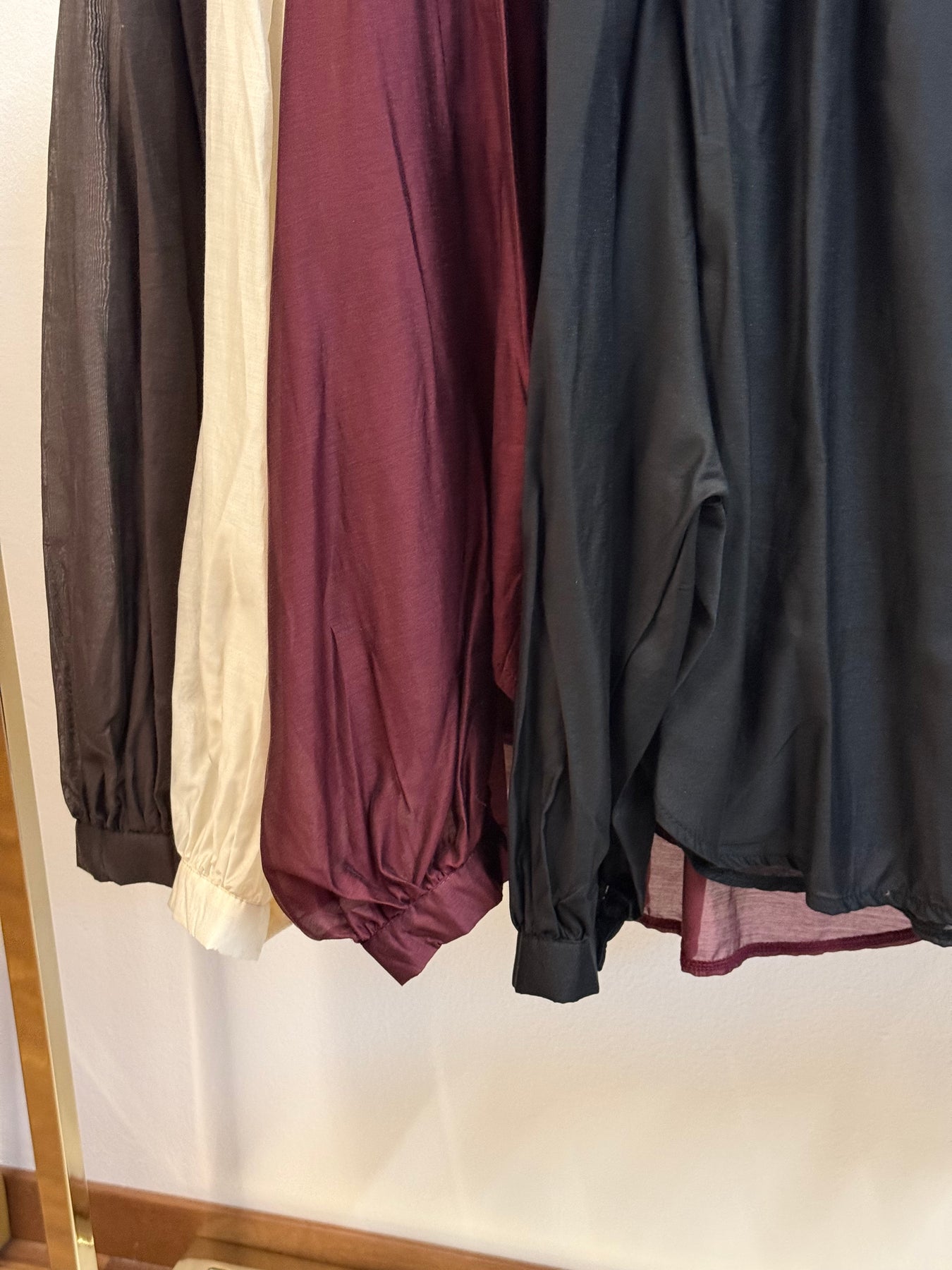 Camicia in viscosa con manica lunga a palloncino con bottoncino sul polso, taglia unica. Disponibile in 4 colori.