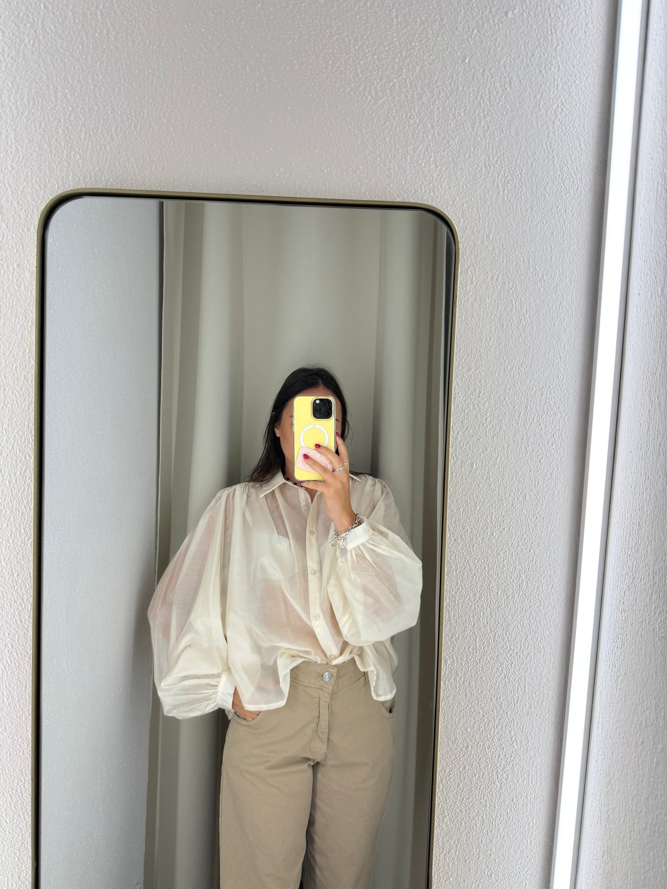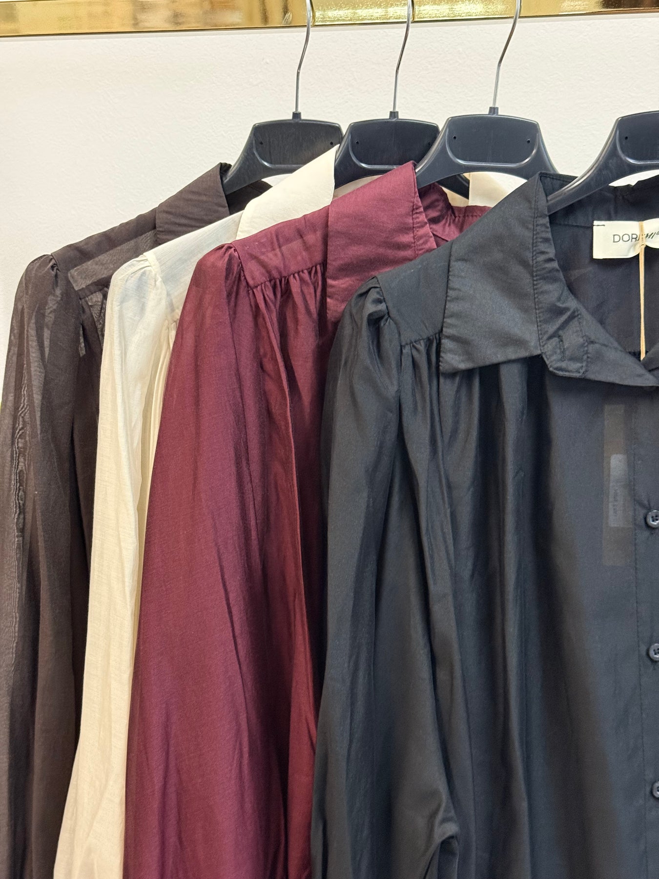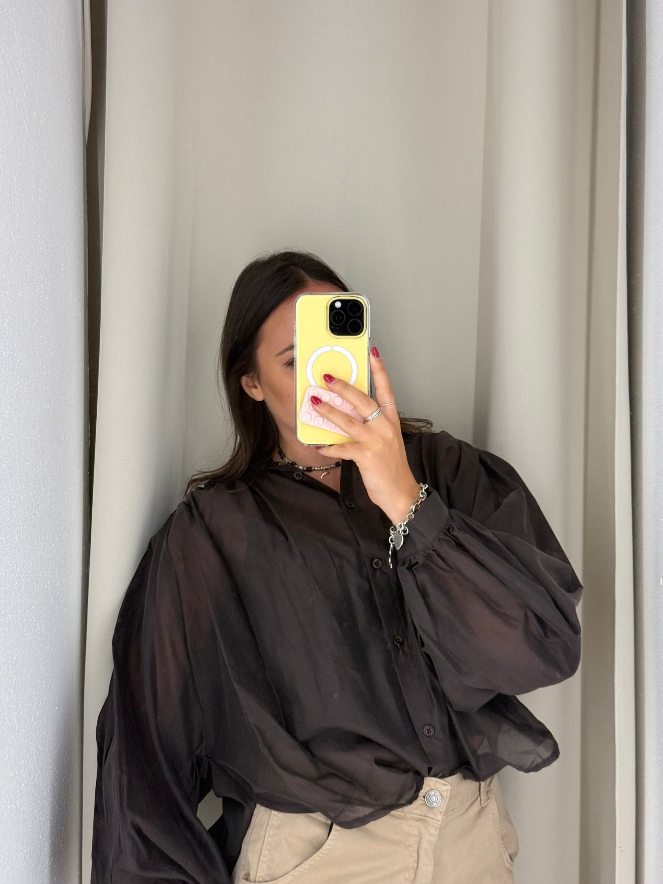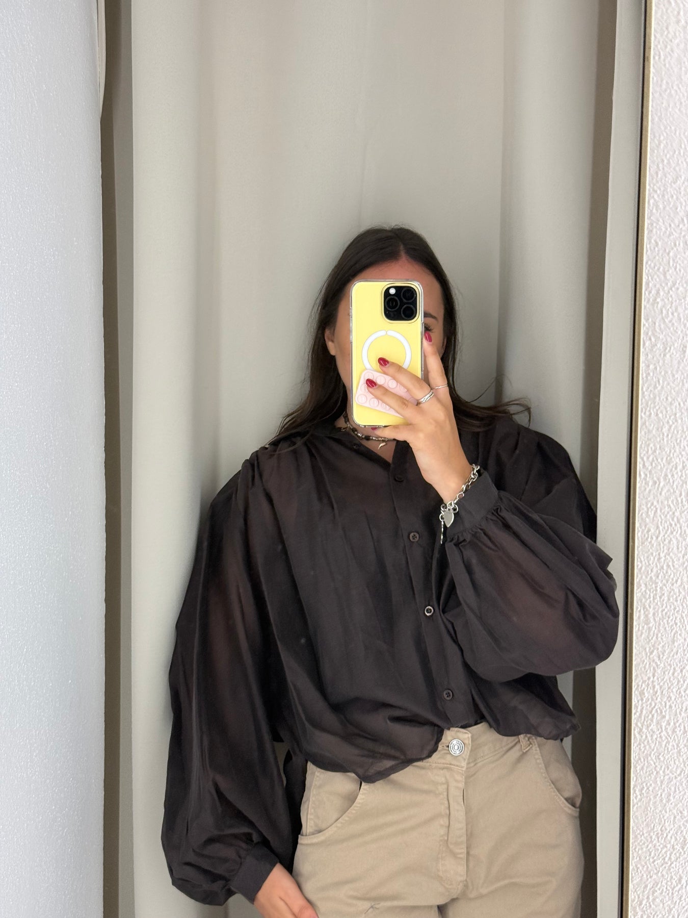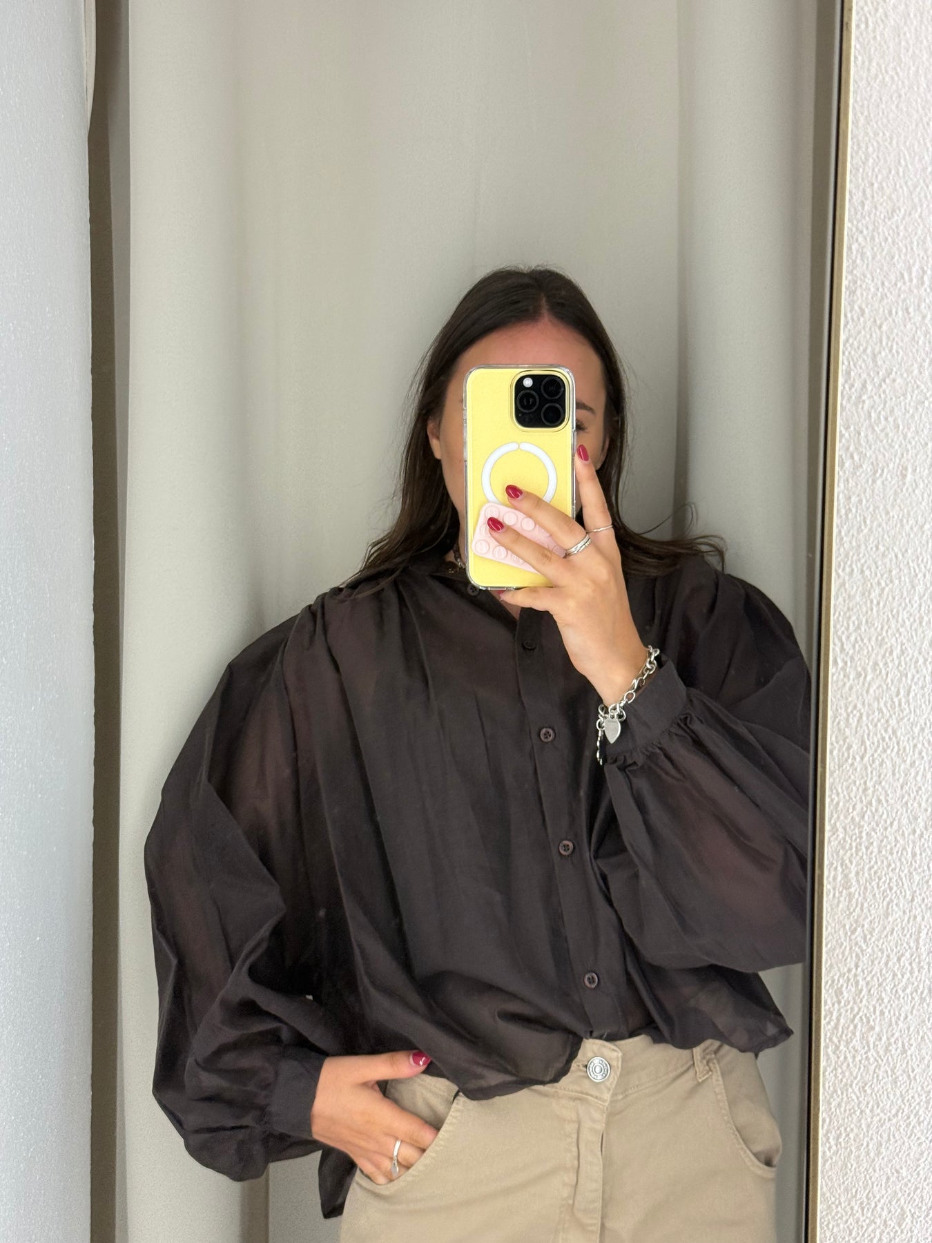 Camicia in viscosa con manica lunga a palloncino con bottoncino sul polso, taglia unica. Disponibile in 4 colori.
