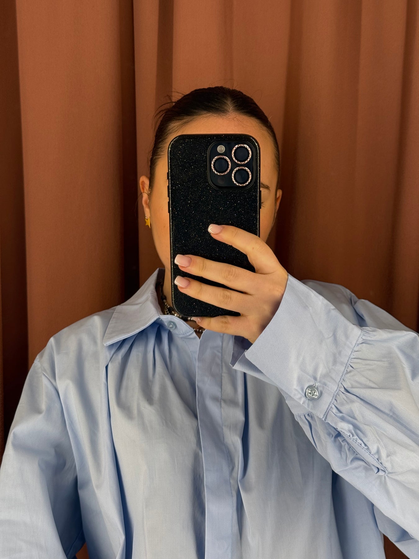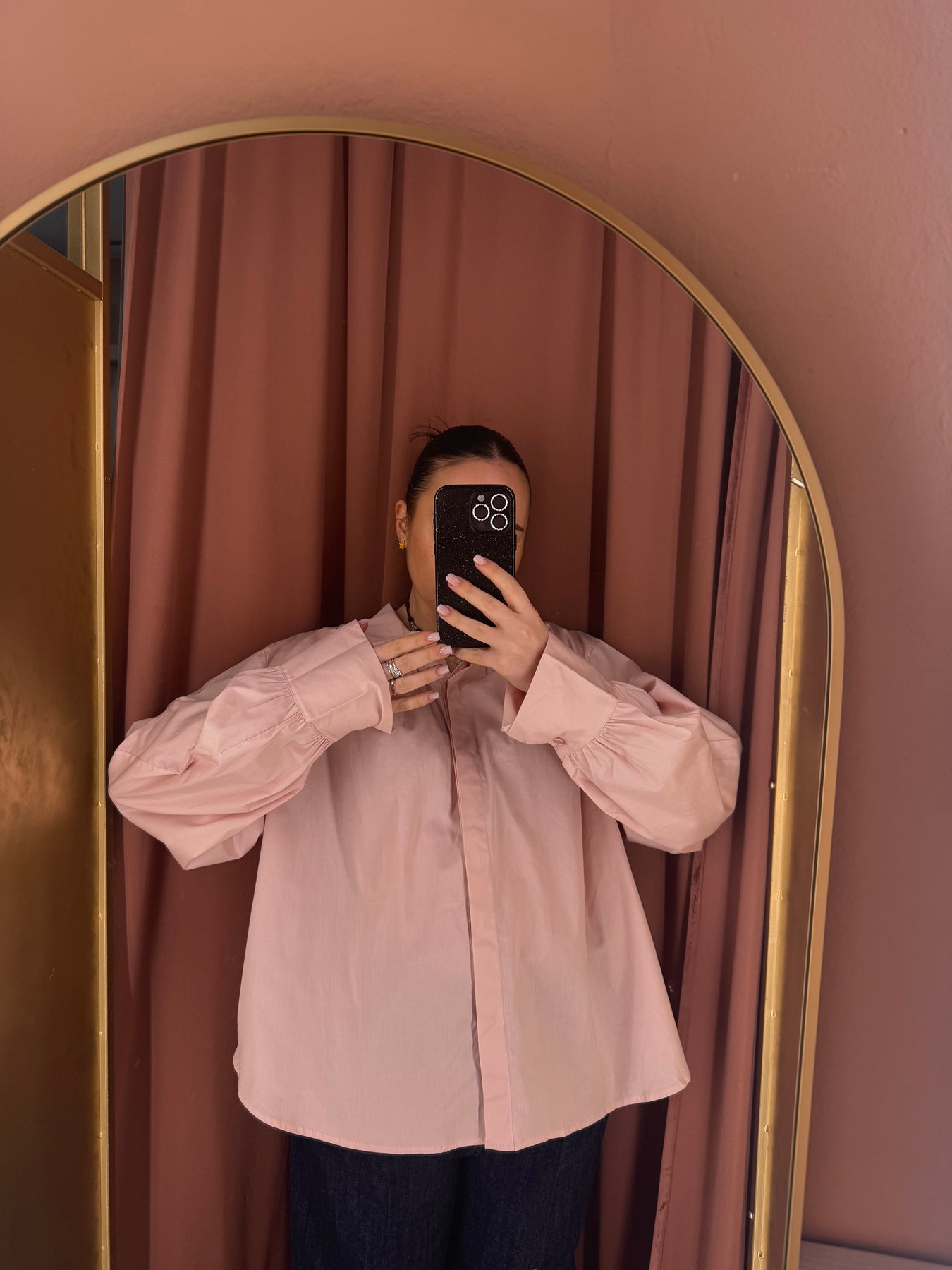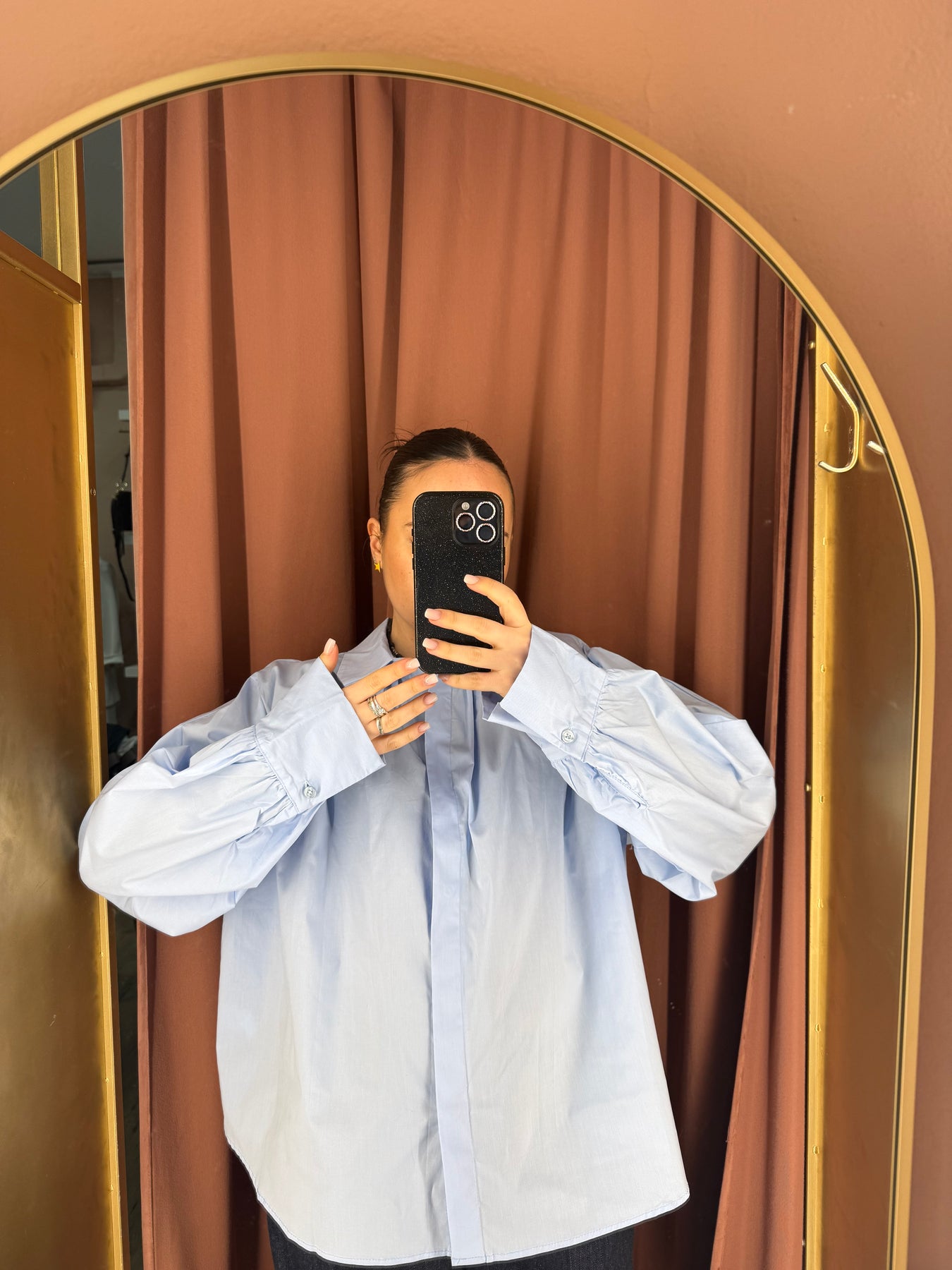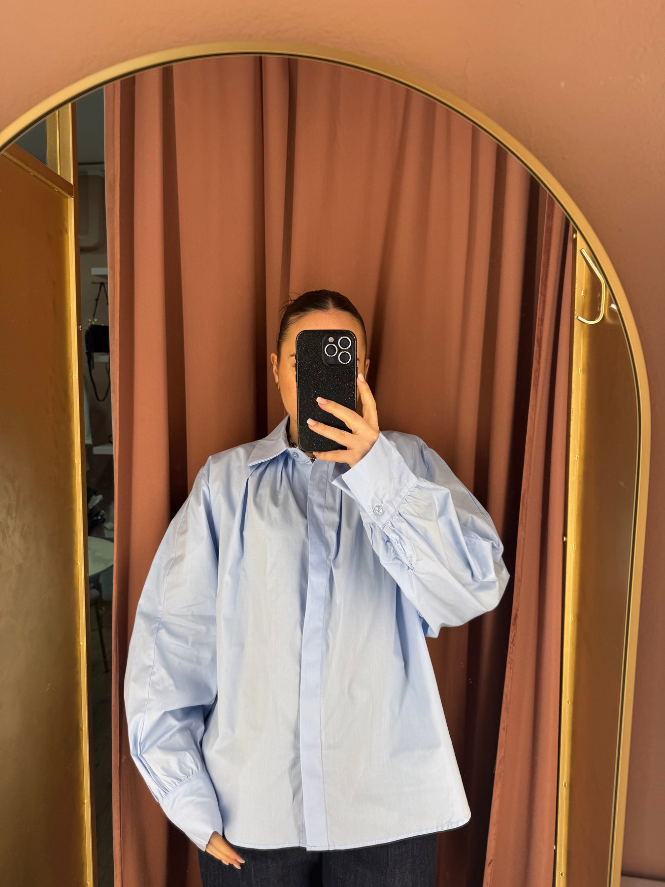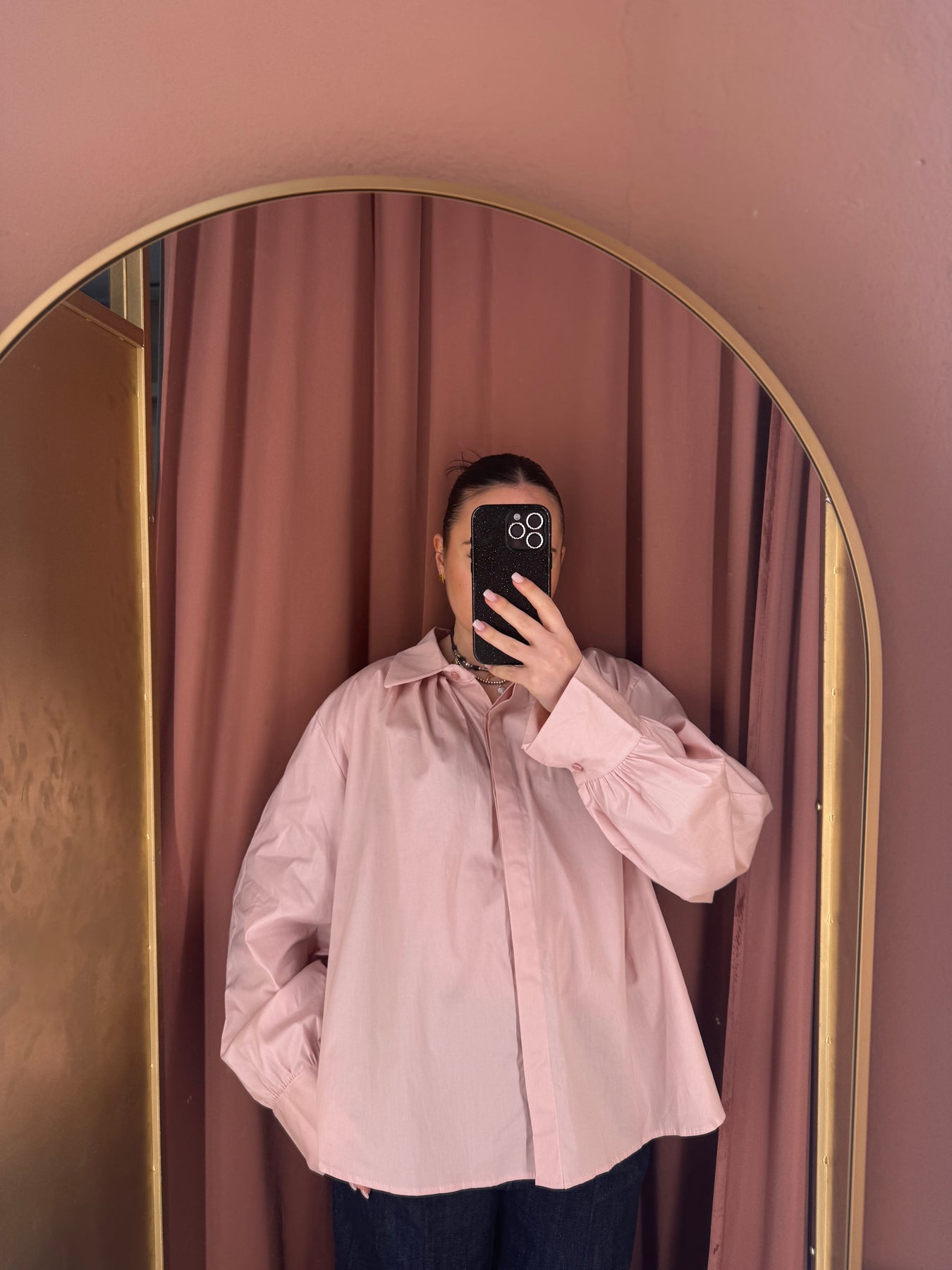 Camicia in popeline di cotone, ariosa, over con dettaglio delle pieghe sul davanti e nella parte schiena, manica lunga leggermente a palloncino.
