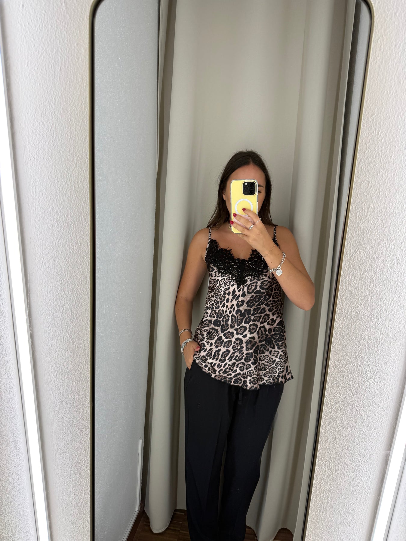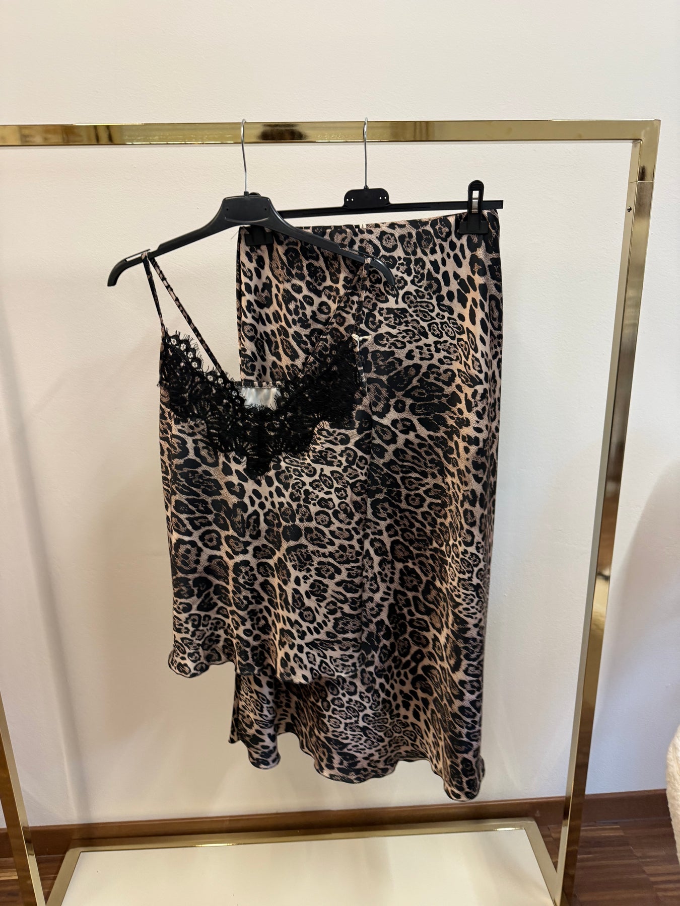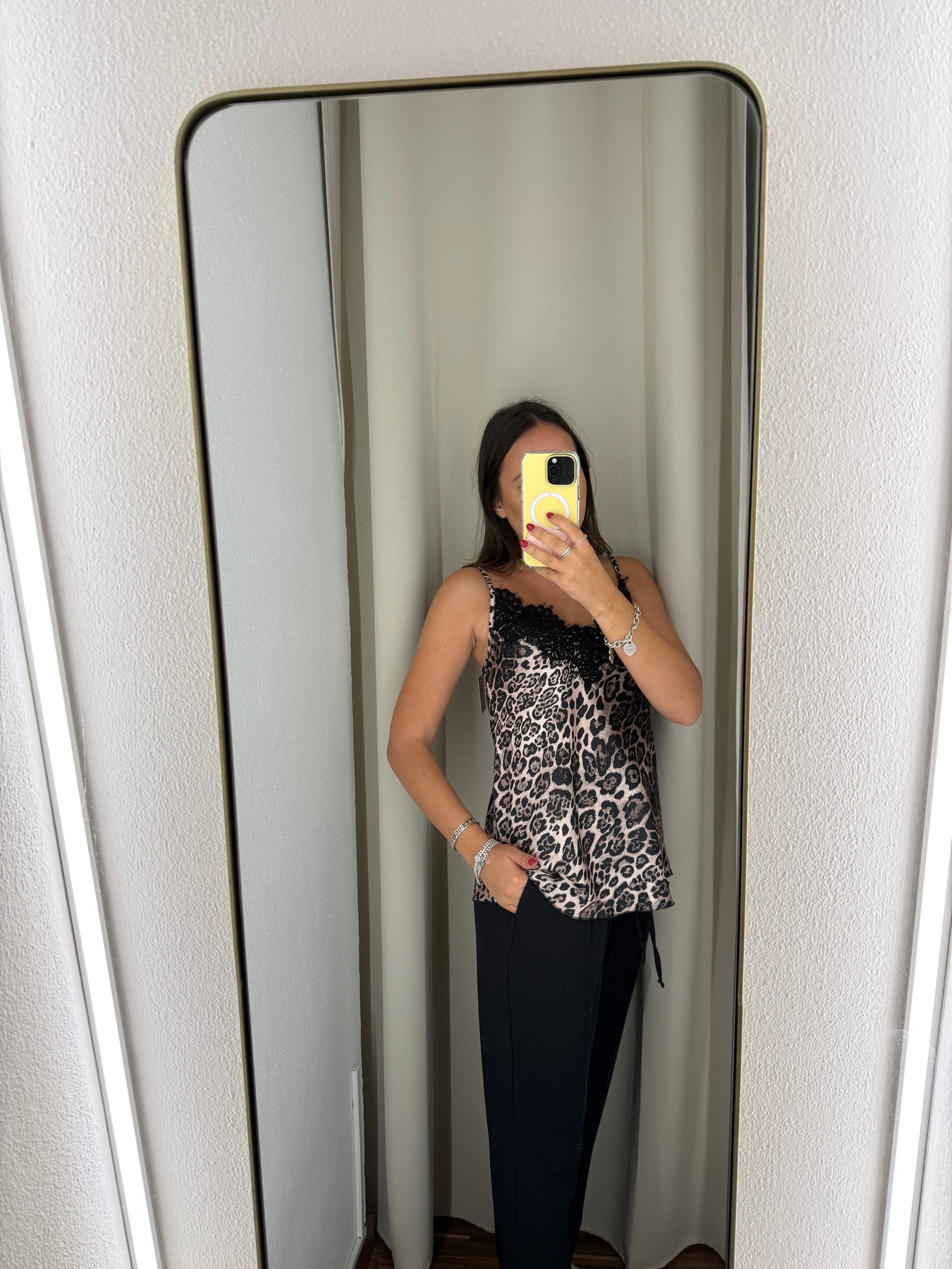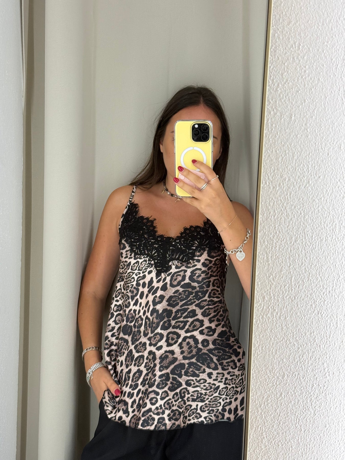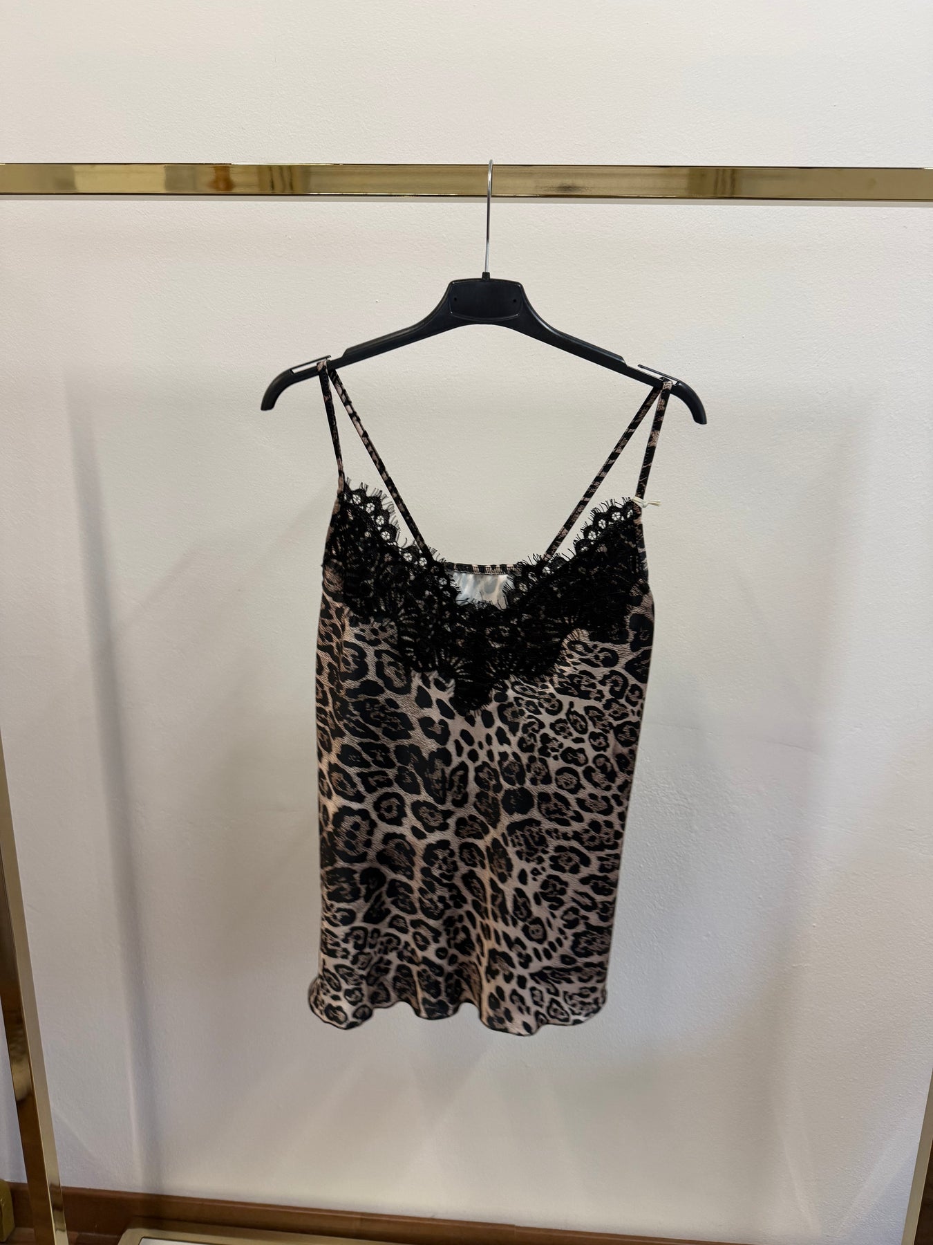 Canotta in satin maculata con pizzo nera e spalline regolabili.