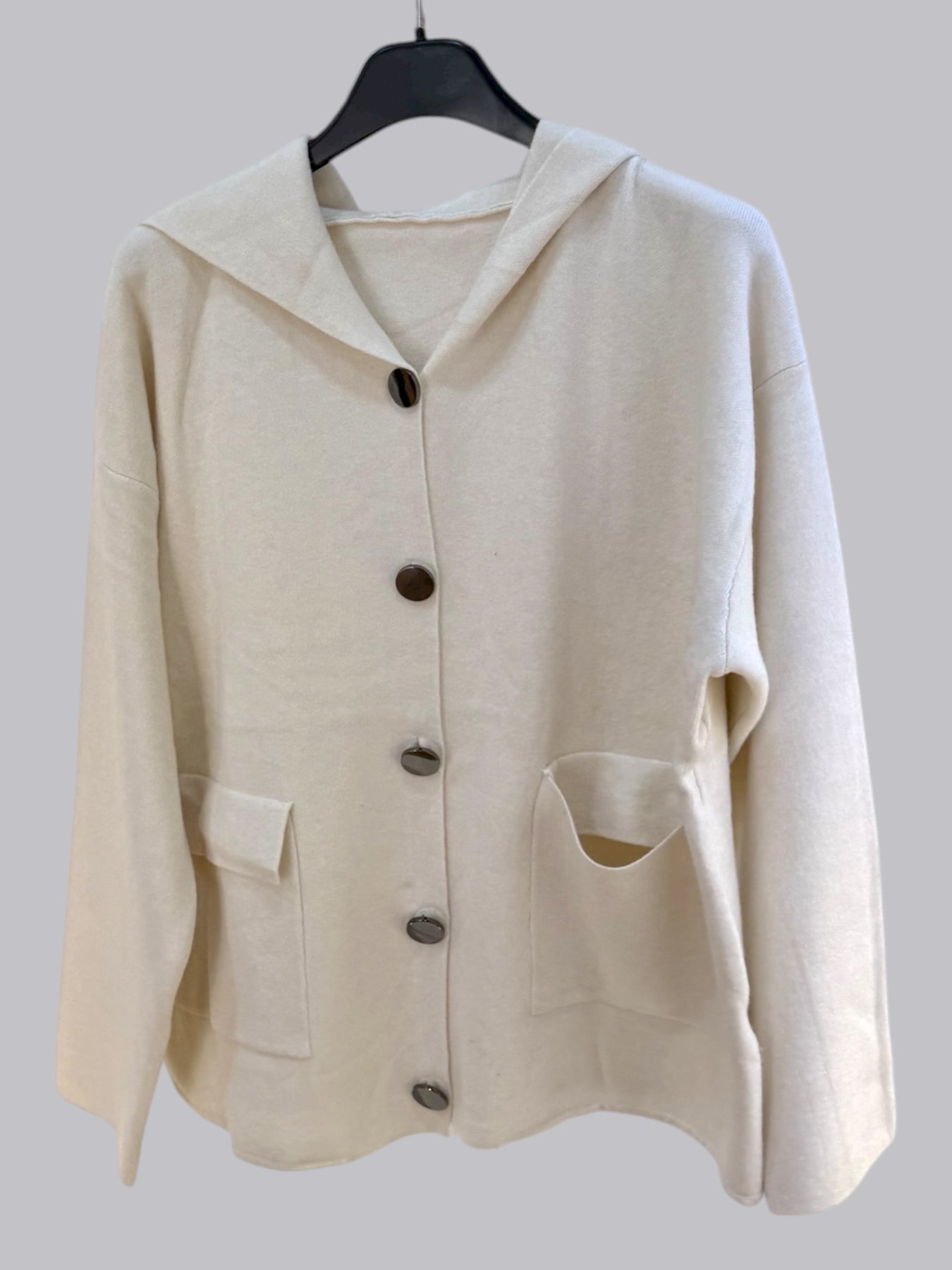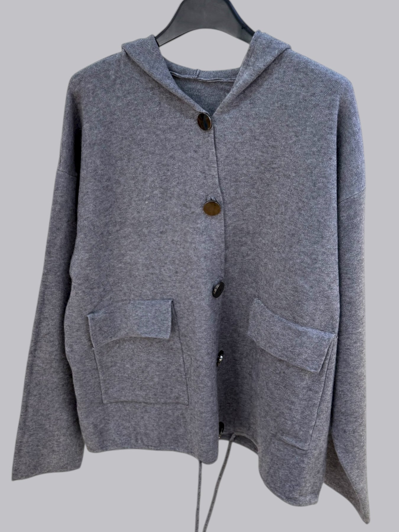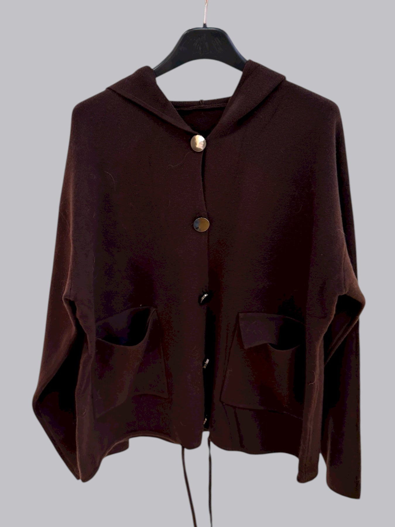 Cardigan con cappuccio e bottoni grandi con tasche davanti . Taglia unica, vestibilita’ fino a taglia XL.