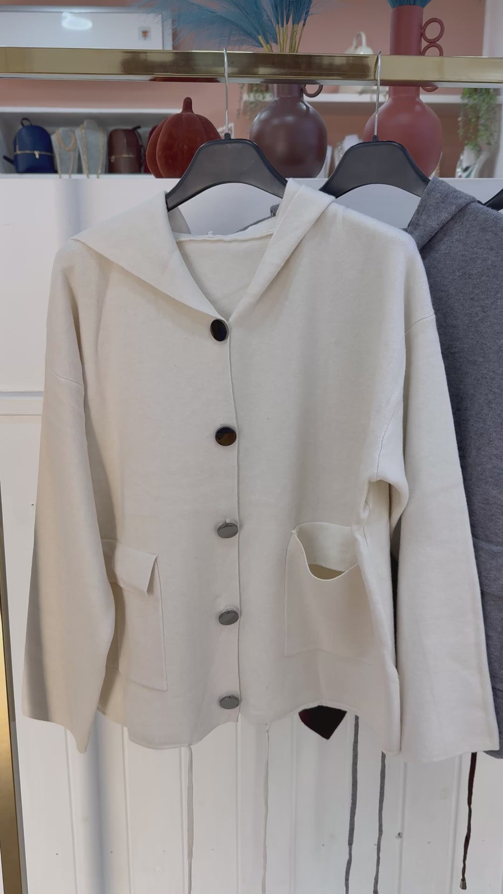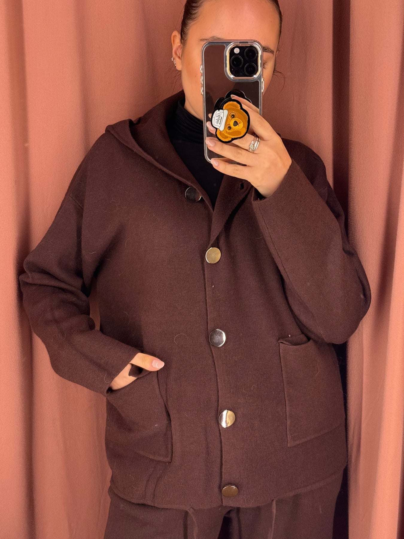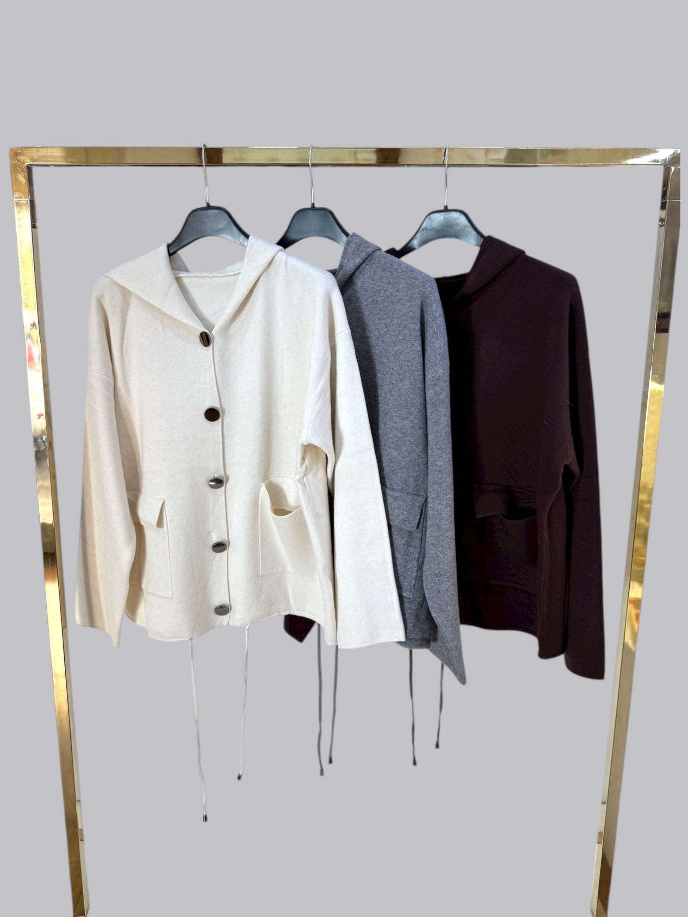 Cardigan con cappuccio e bottoni grandi con tasche davanti . Taglia unica, vestibilita’ fino a taglia XL.