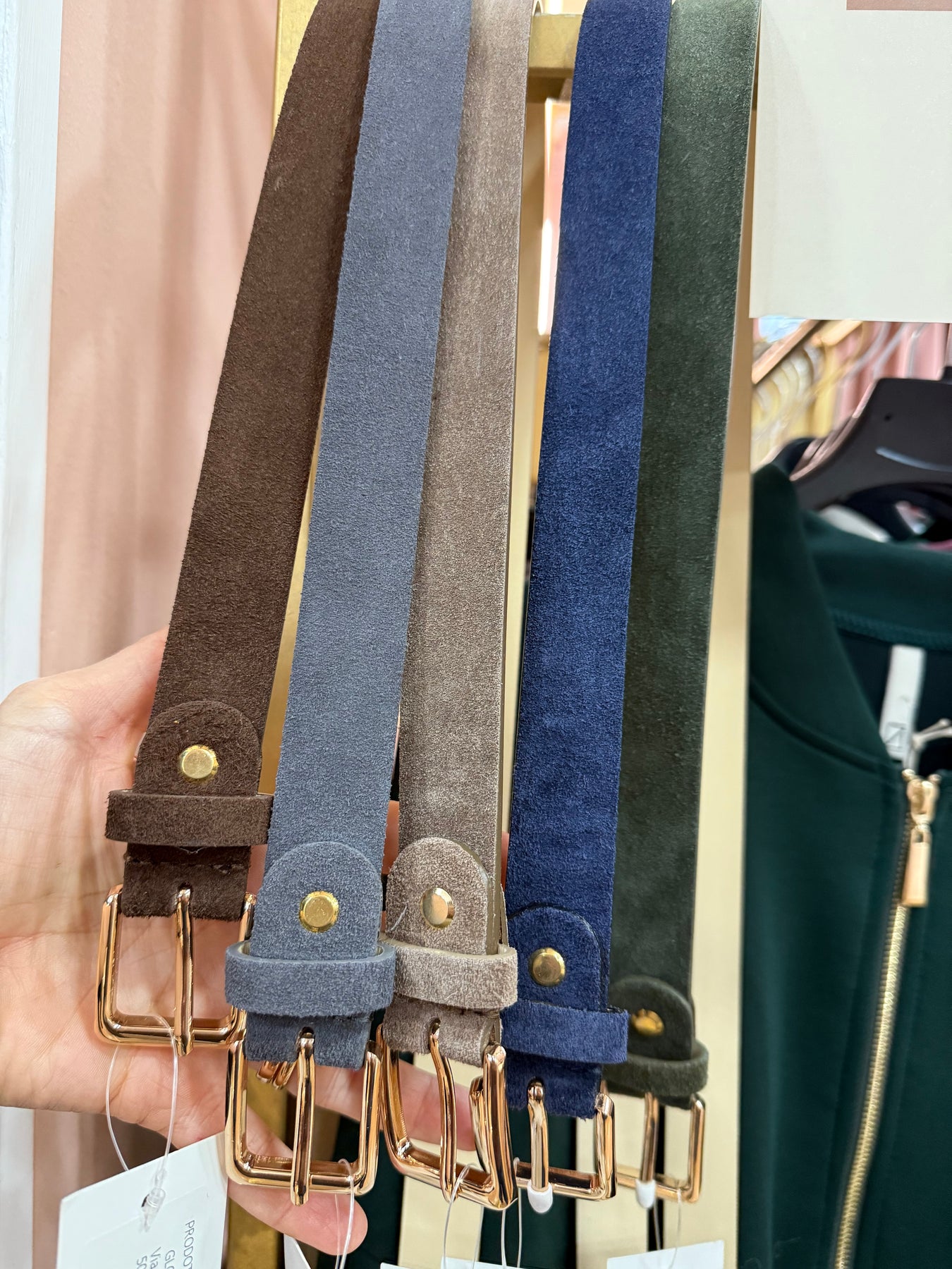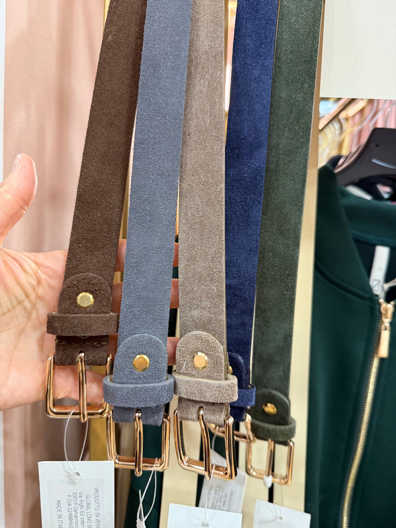 Cinture scamosciate altezza 2,5 cm fibia oro, misura lunghezza 1 metro.