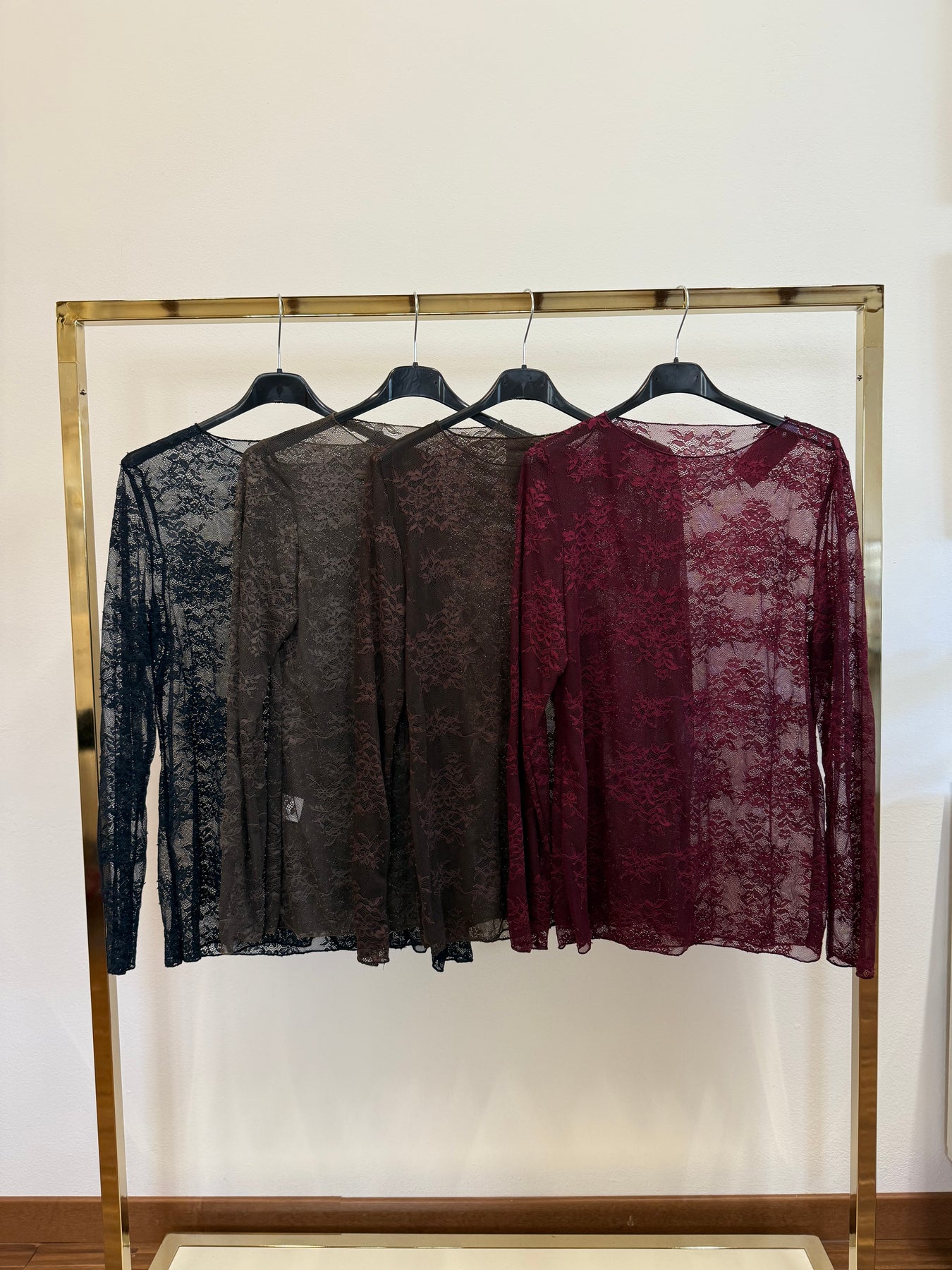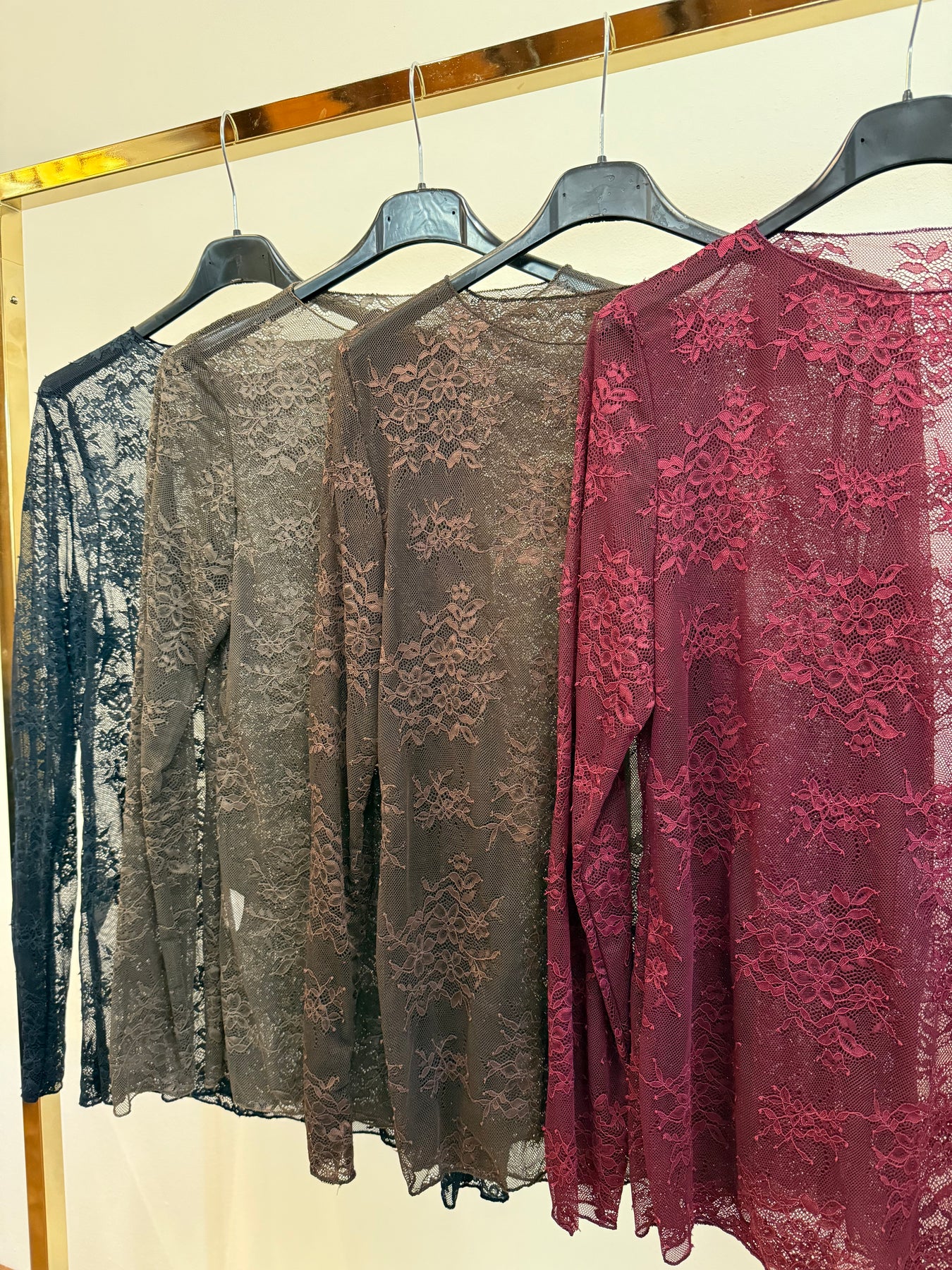 Maglia manica lunga in pizzo elasticizzato collo a giro