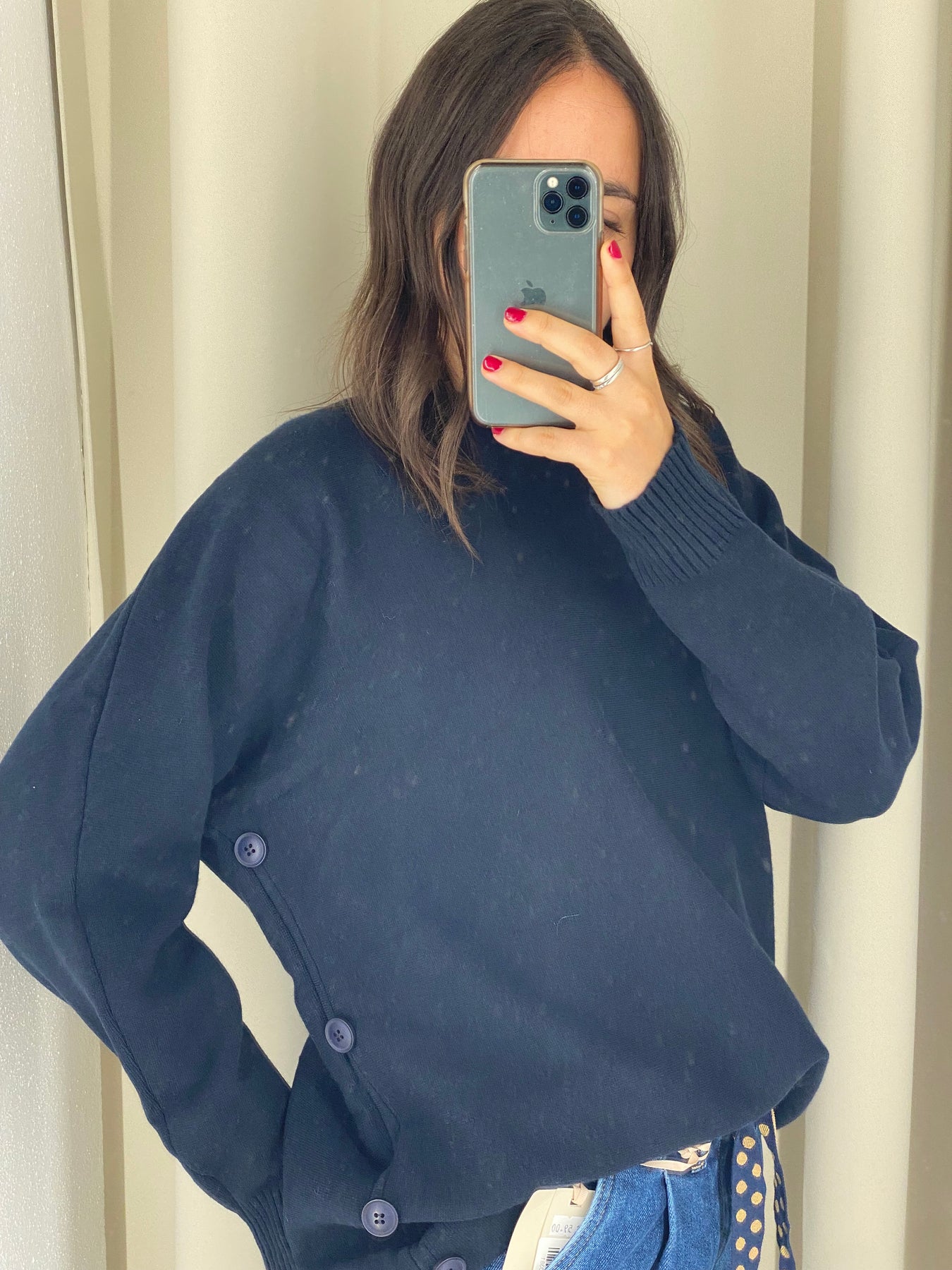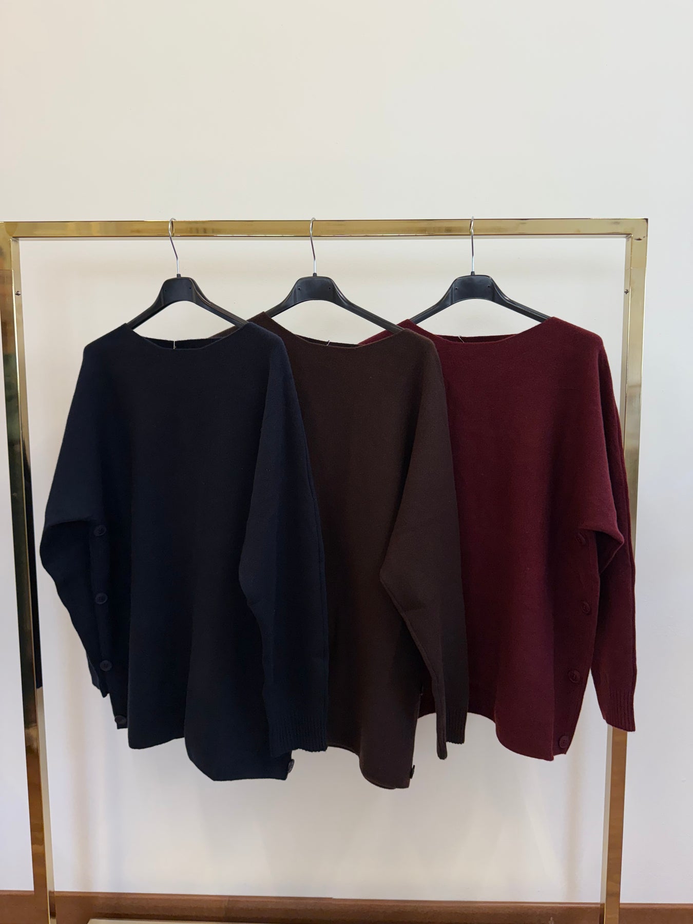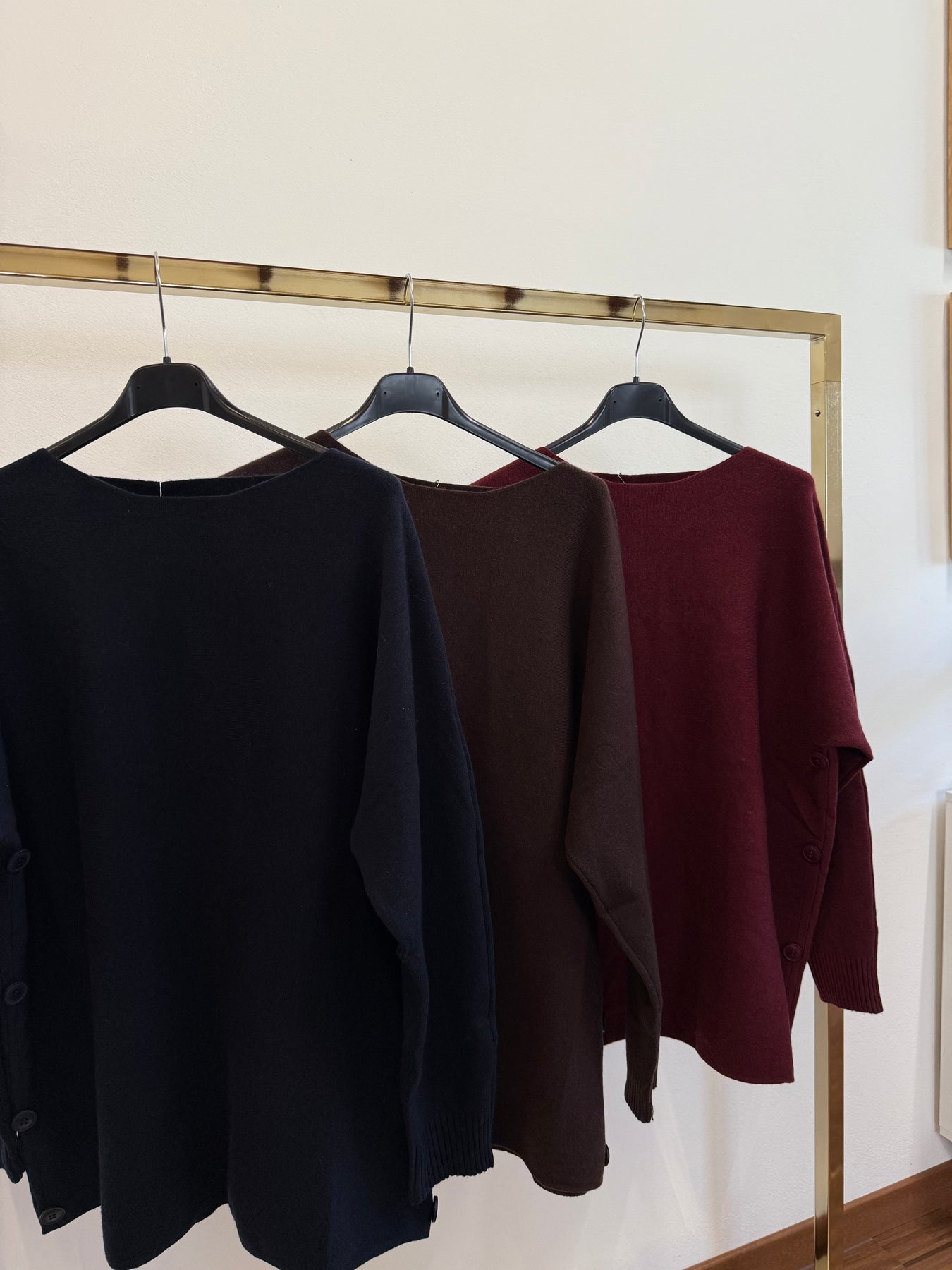 Maglione a girocollo a scatola modello over con bottoncini sul laterale, taglia unica. Vestibilita’ dalla M alla XL