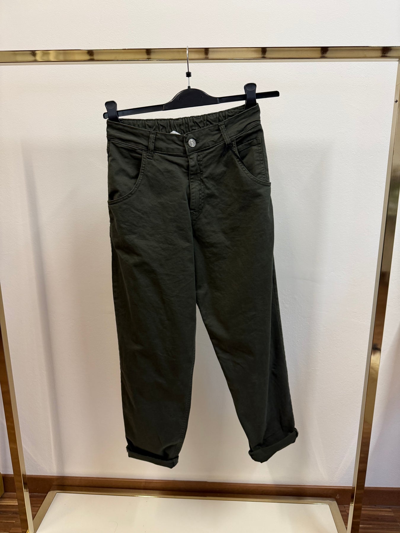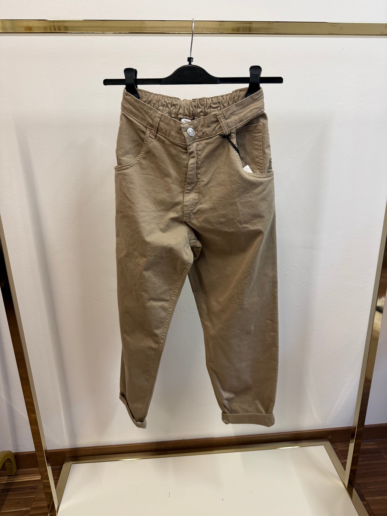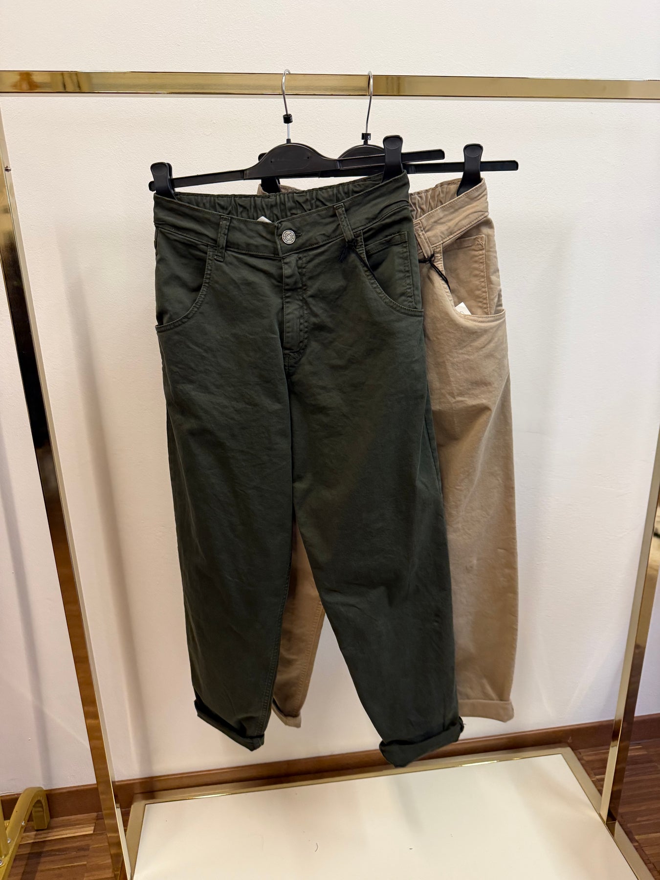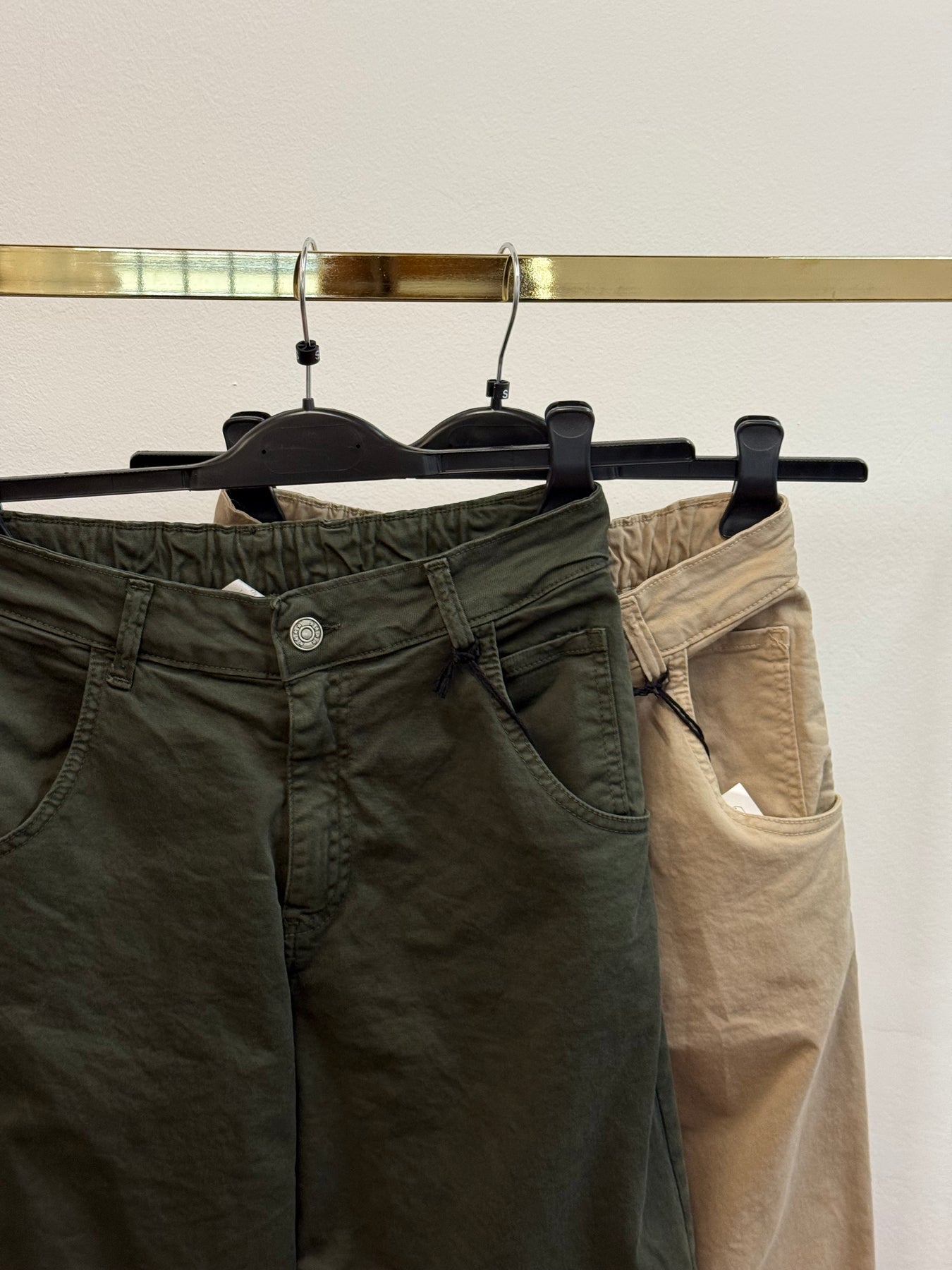 Pantalone denim con tasche bottone e vita elasticizzata dietro, disponibile in 2 varianti colore e doppia taglia.