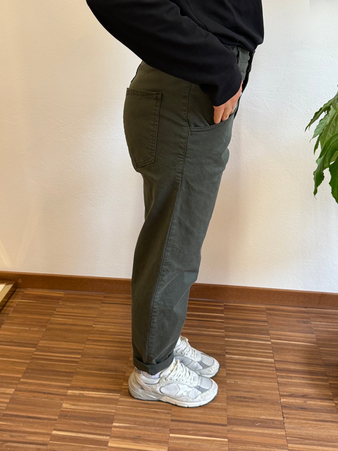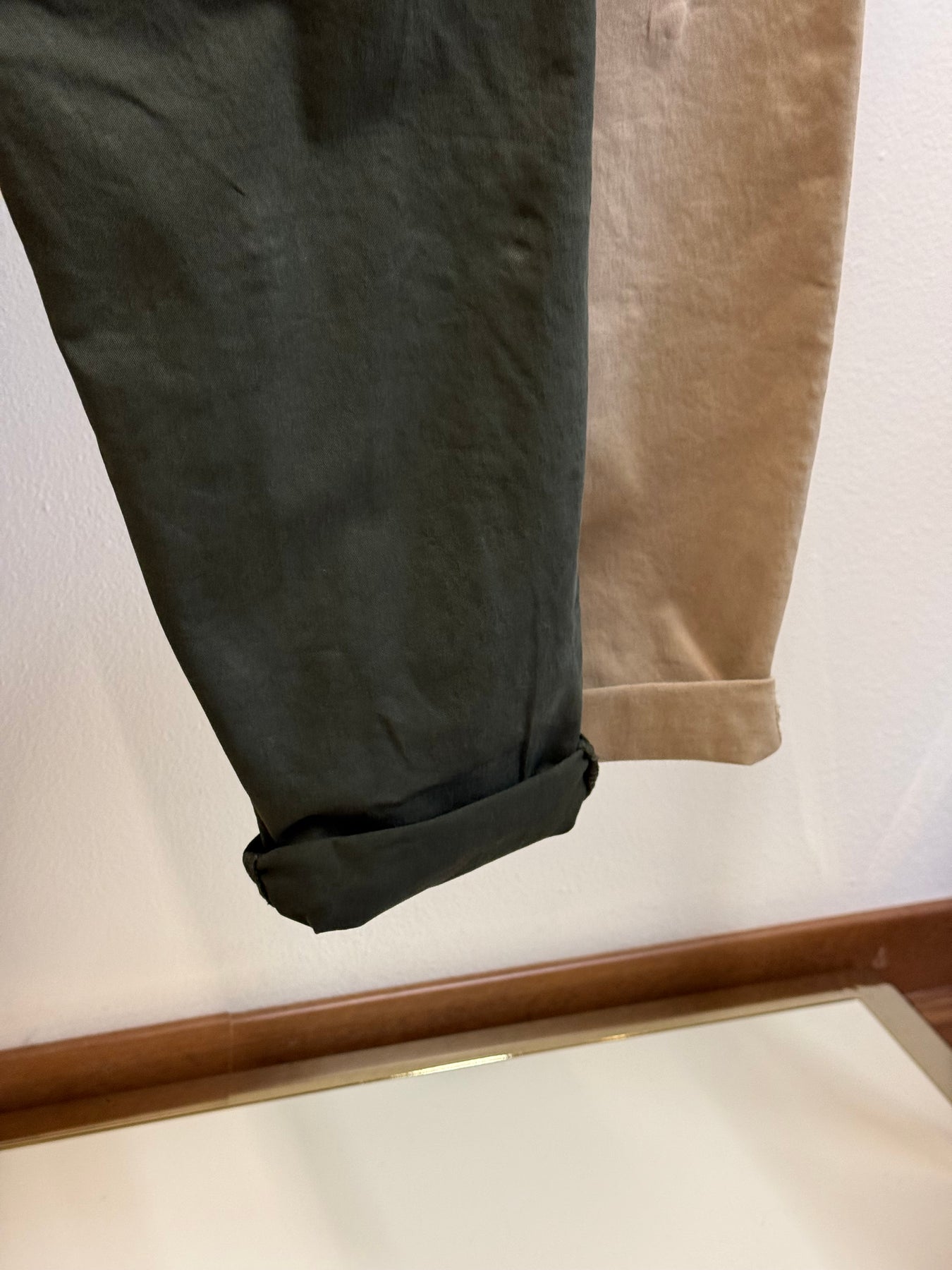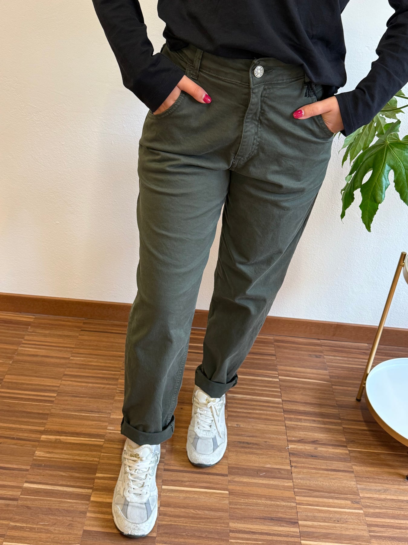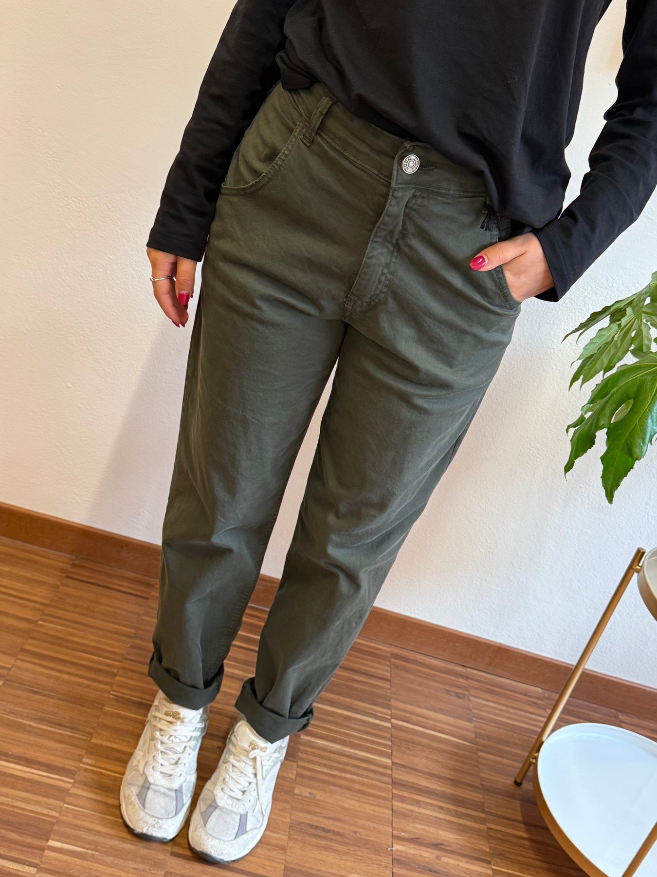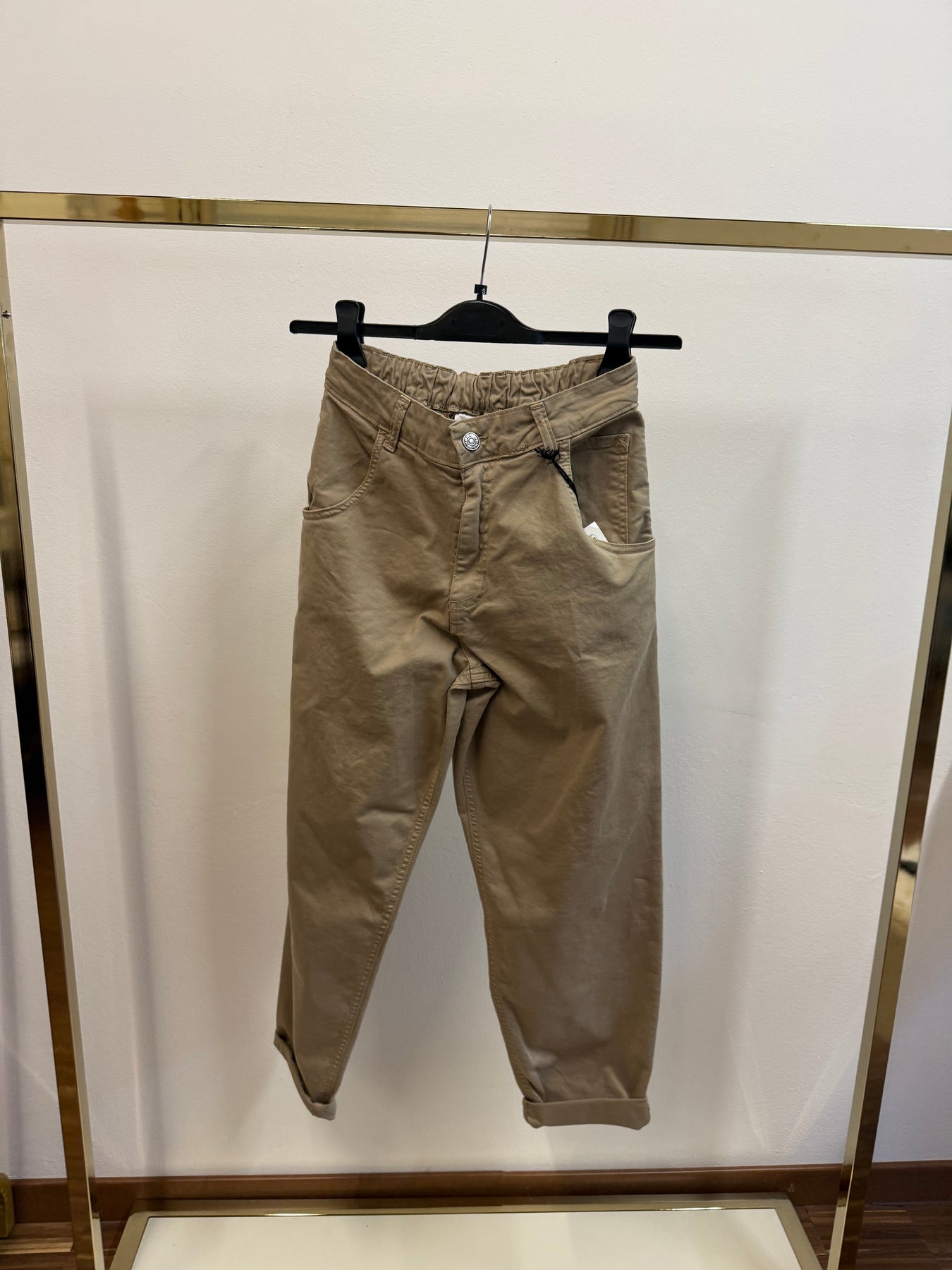 Pantalone denim con tasche bottone e vita elasticizzata dietro, disponibile in 2 varianti colore e doppia taglia.