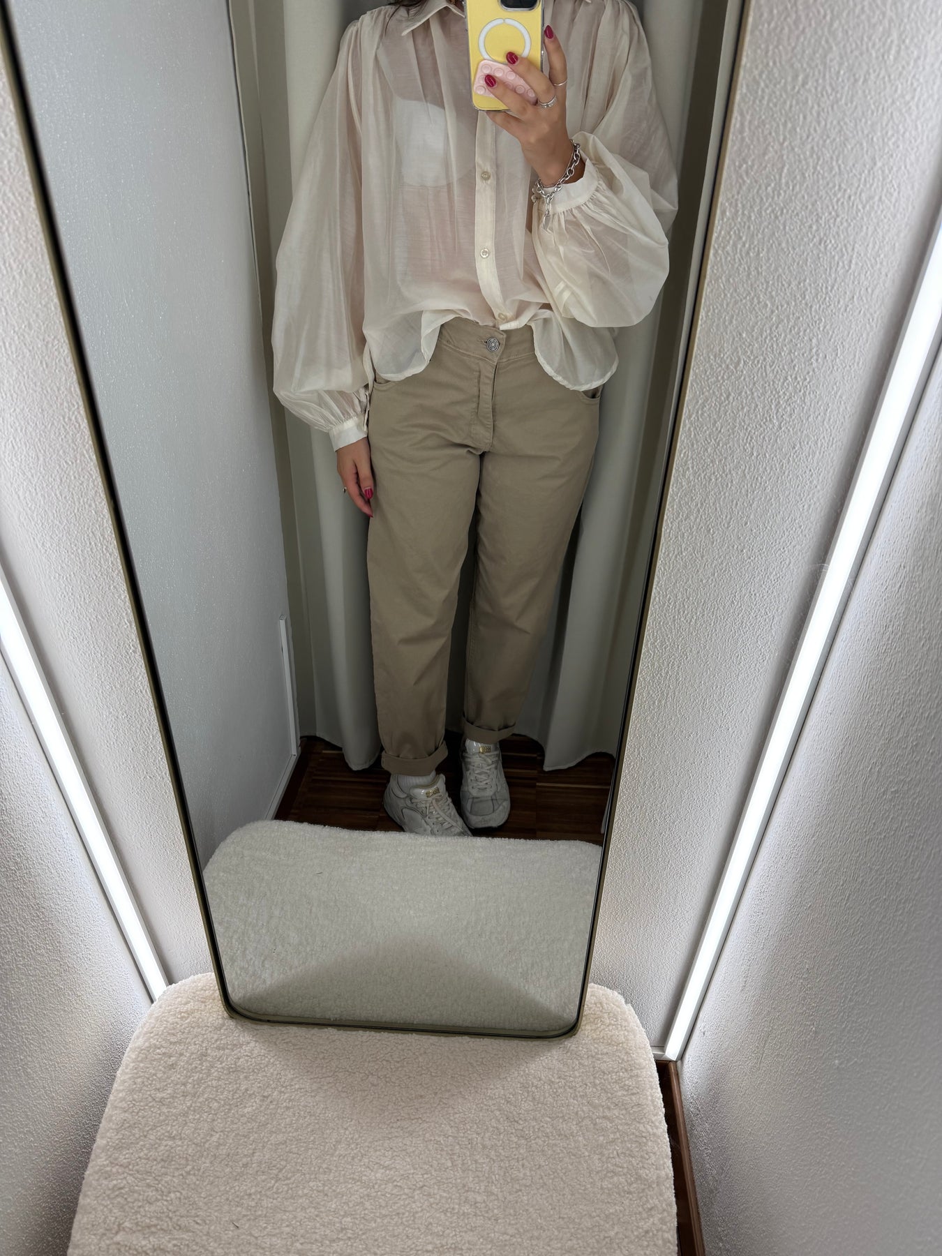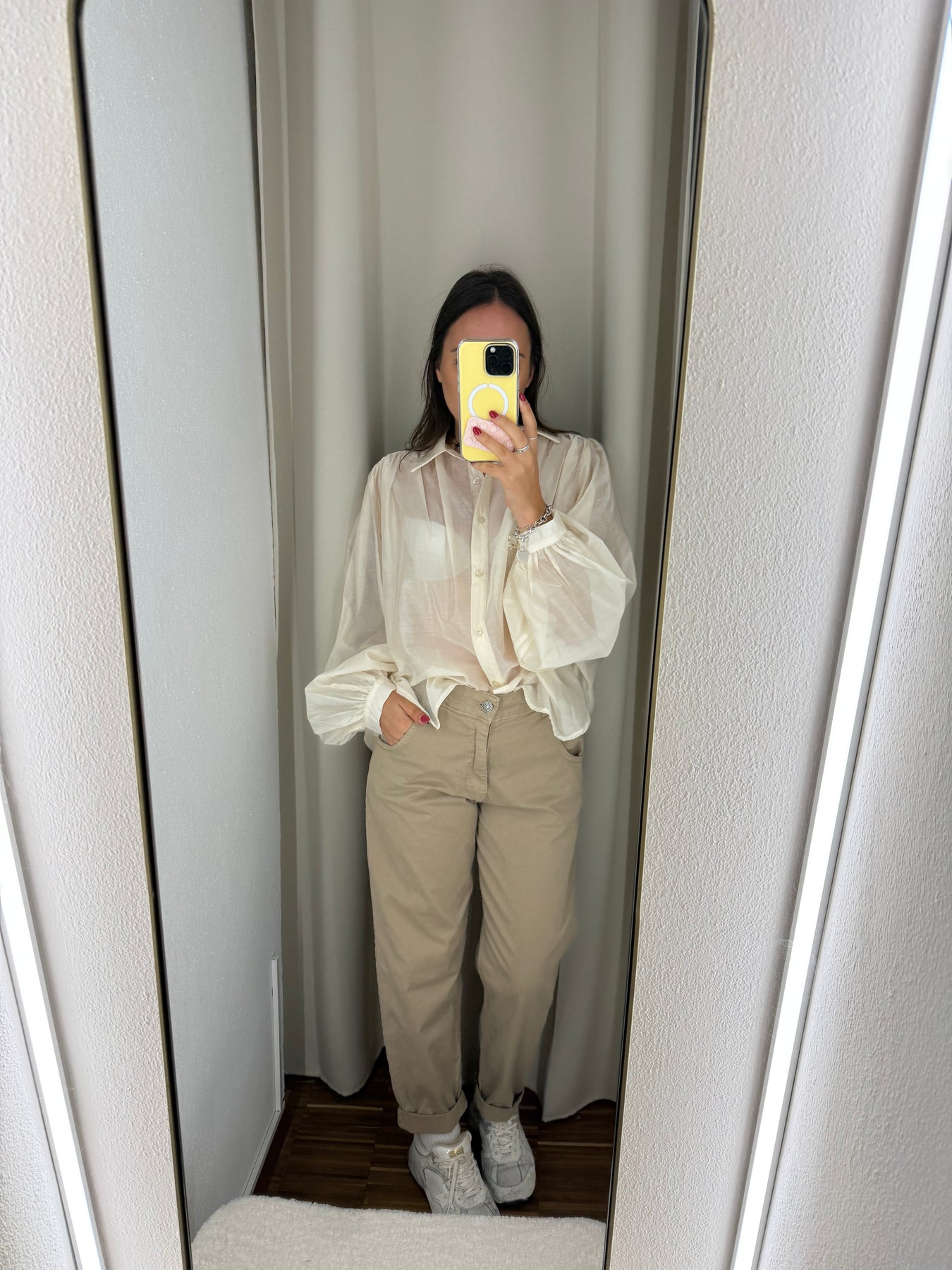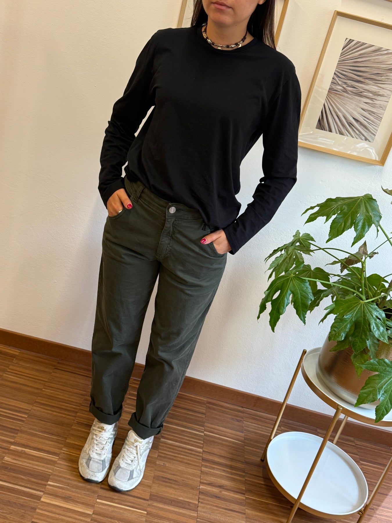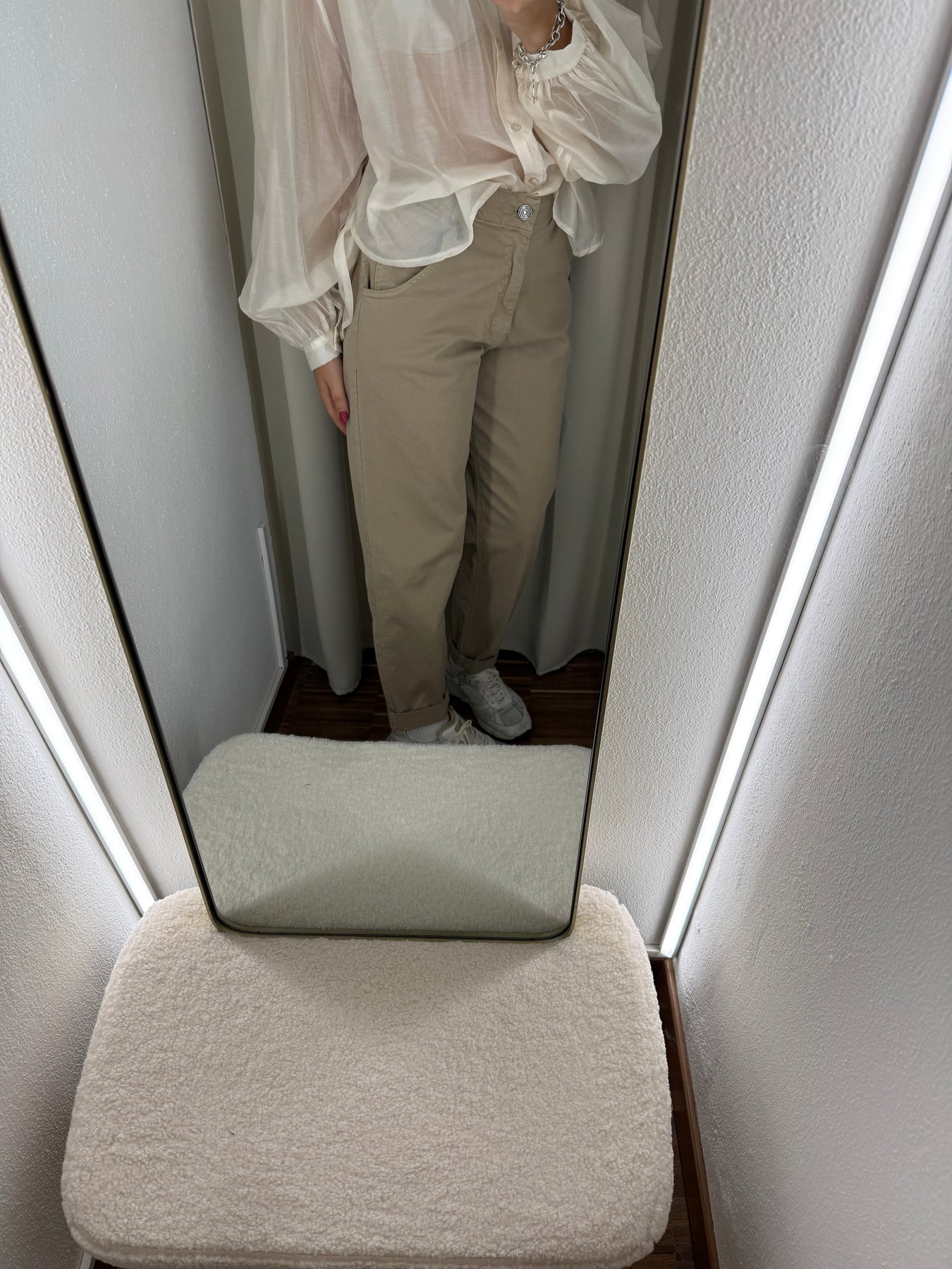 Pantalone denim con tasche bottone e vita elasticizzata dietro, disponibile in 2 varianti colore e doppia taglia.